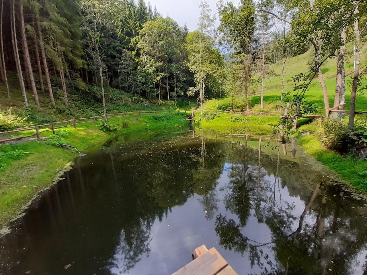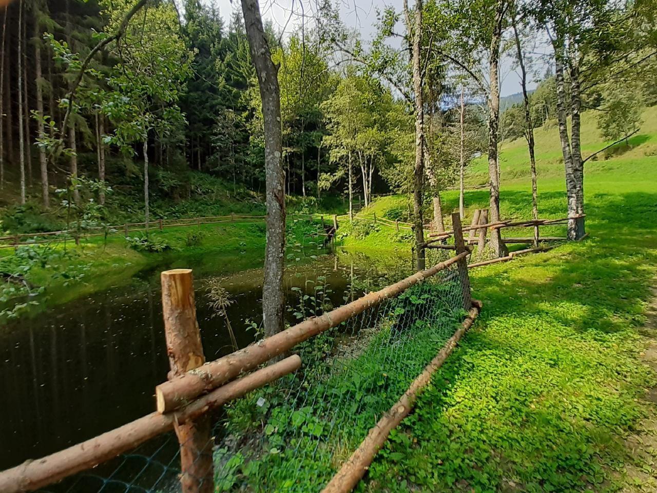 Der Außenbereich des Teichhauses lädt mit seiner idyllischen Lage direkt an einem plätschernden Bächlein, das in zwei sanierte Forellenteiche mündet, zum Verweilen und Angeln ein. An das Ferienhaus angrenzend steht eine Halle, die als Lager und Wirtschaftsgebäude dient, in der Fahrzeuge abgestellt werden können. Die 2018/19 sanierten Teiche, besetzt mit Forellen, bieten eine einzigartige Gelegenheit für Angler und Naturfreunde.