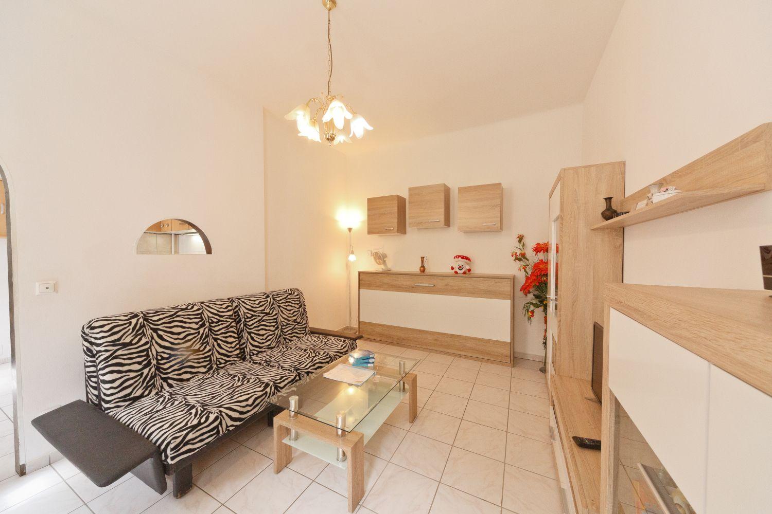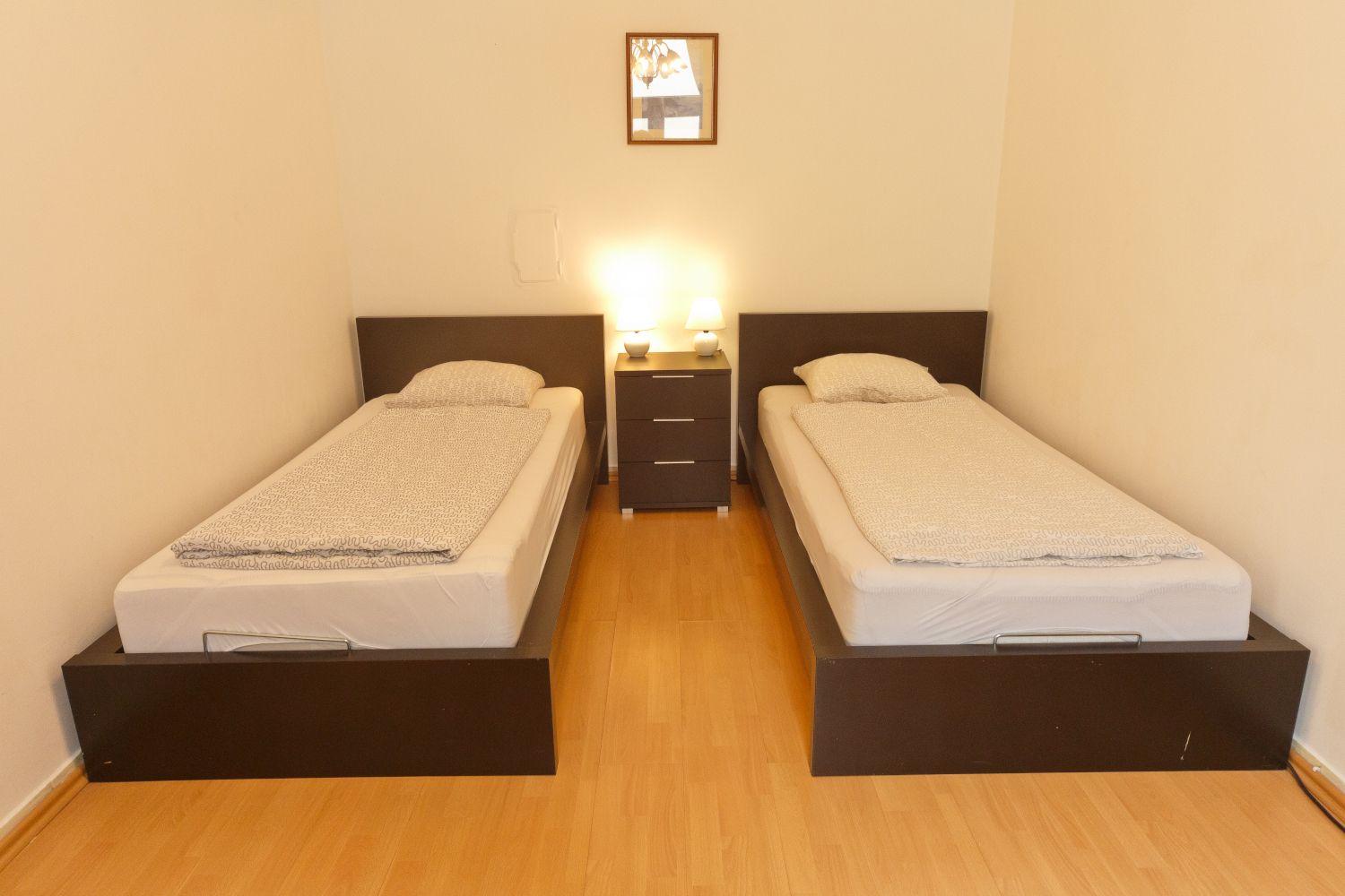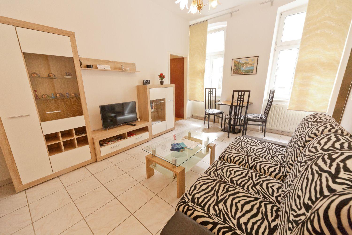 Diese Wohnung liegt im ersten Stockwerk und bietet auf 45 m² Platz für zwei Personen. Die mit einem Fliesenboden ausgelegte Wohnung ist aufgeteilt in einen Eingangsbereich, ein Badezimmer mit Toilette, einen Wohnraum, eine Küche und ein Schlafzimmer. Der Wohnraum bietet eine Couch, Couchtisch, einen Wohnzimmerschrank sowie einen Essbereich mit Tisch und zwei Stühlen. Die Küche besteht aus einem Herd, Kapsel Kaffeemaschine, Mikrowelle, Kühlschrank, Spüle und Wasserkocher. Im Badezimmer haben Sie eine Dusche, ein WC und ein Waschbecken zu Ihrer Verfügung, Das Schlafzimmer besteht aus zwei Einzelbetten mit Nachttisch und einen geräumigen Kleiderschrank.