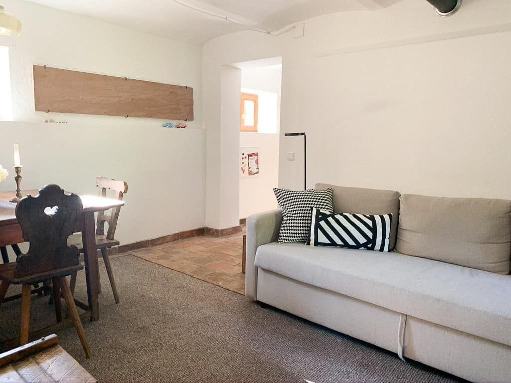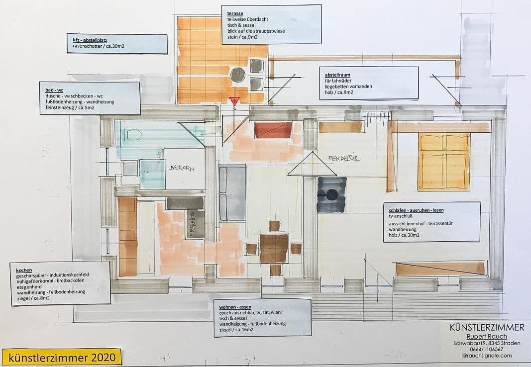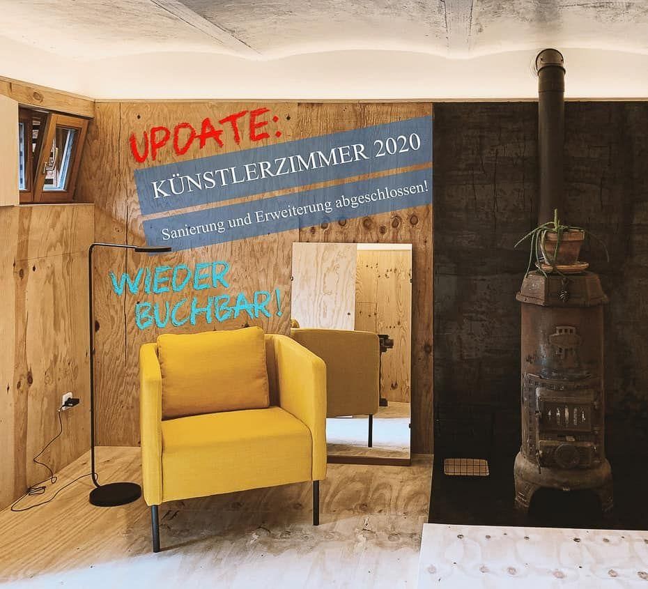 Das Künstlerzimmer wurde 2020 komplett saniert und um einen Raum auf nunmehr 60m² erweitert. Küche, Wohnen & Essen mit Schlafgelegenheit und ein komfortables Schlafzimmer (1,60 x 2,00m). Natürlich besitzt sie auch ein eigenes Badezimmer mit WC und Dusche.