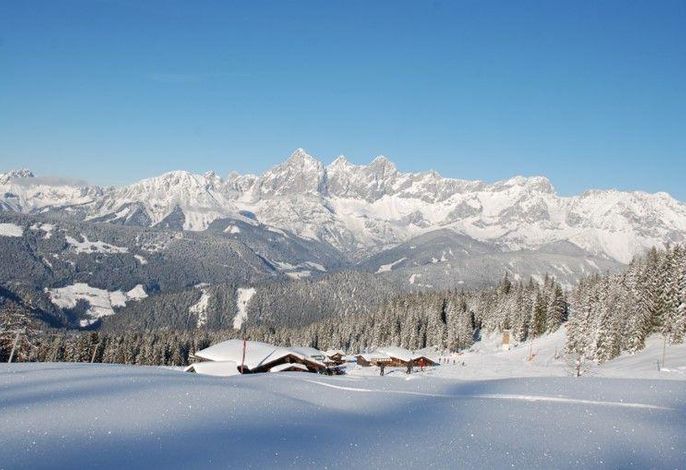 Der Außenbereich lässt ebenfalls keine Wünsche offen. Ein privater Wellnessbereich mit Sauna und atemberaubendem Panoramablick auf den Dachstein bietet Entspannung pur. Für die Lagerung Ihrer Sportausrüstung sorgen ein Skiraum mit Schuhtrockner sowie eine abschließbare Fahrradgarage. Zwei überdachte Carport-Stellplätze sowie eine Aufladestation für Elektro-Autos ergänzen die Außenausstattung. Der große Garten mit Terrasse, Balkon und eigenem Spielplatz lädt zu entspannten Stunden unter freiem Himmel ein.