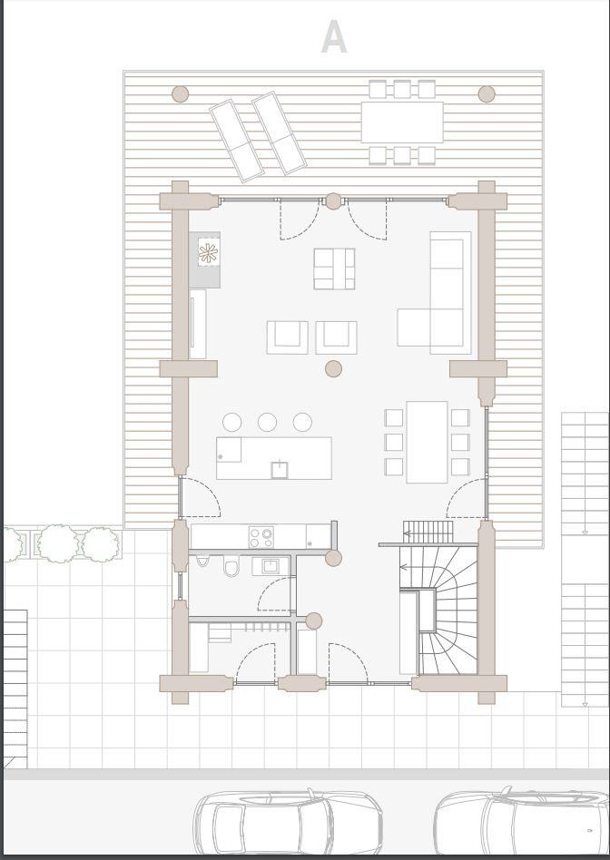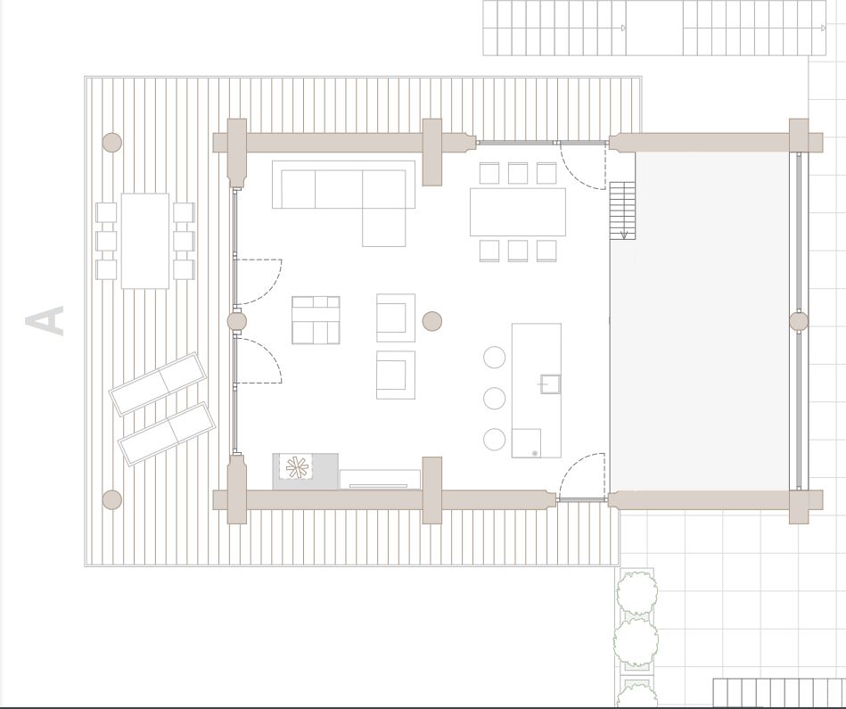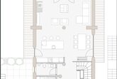 Erster Stock; Wohn-/Kochbereich mit einer großen Terrasse