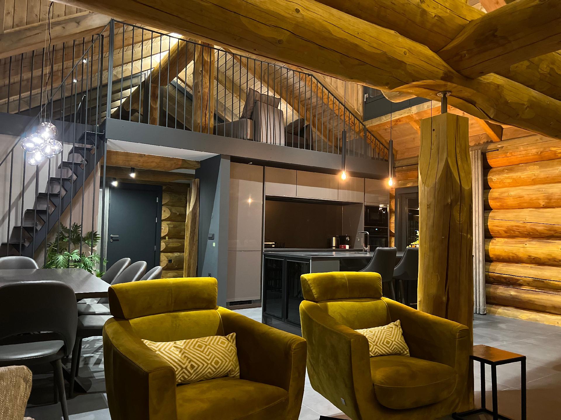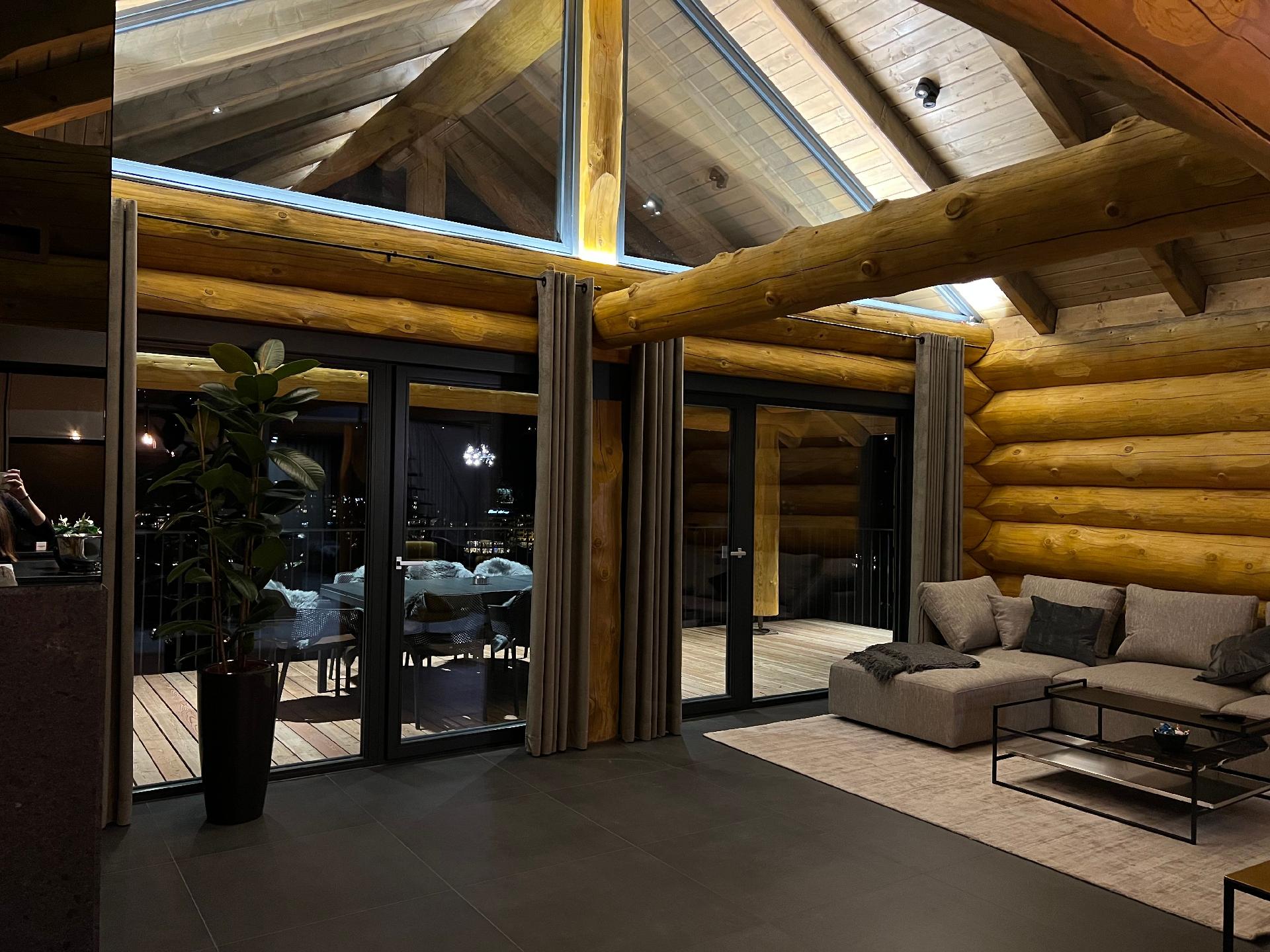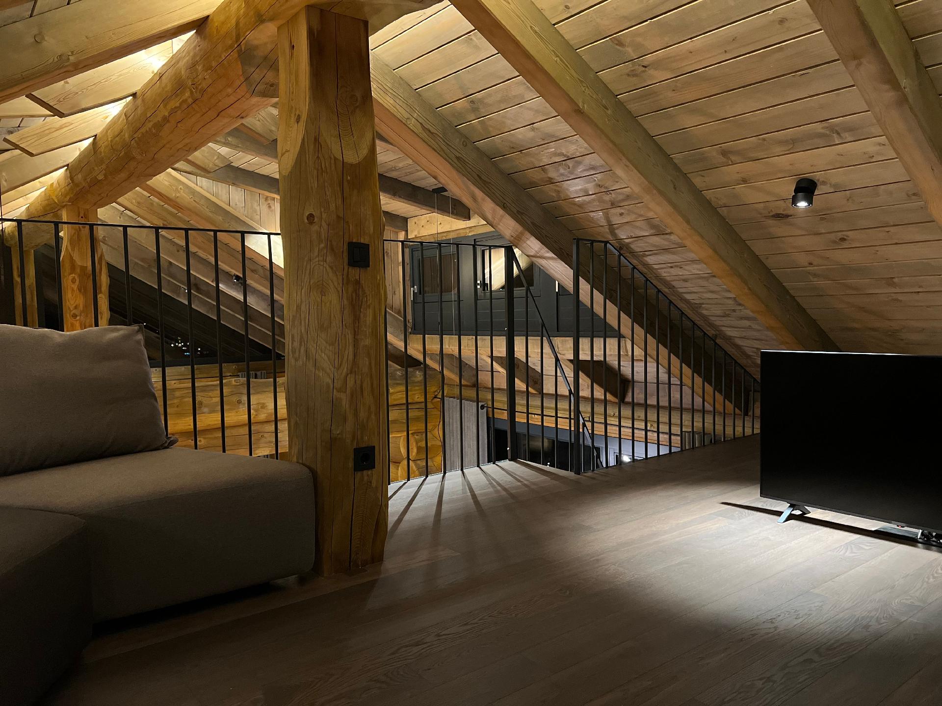 Im Obergeschoss befindet sich ein sehr großer, doppelt hoher Wohnbereich mit wunderschön freigelegten Holzbalken und einem offenen Kamin. Die ganze Etage ist von einer großen Terrasse mit Blick auf die Stadt umgeben. Es gibt eine voll ausgestattete Küche mit einer gemütlichen Essecke. Der beheizte Skiraum ist direkt von außen zugänglich und eine Gästetoilette befindet sich ebenfalls auf dieser Etage.