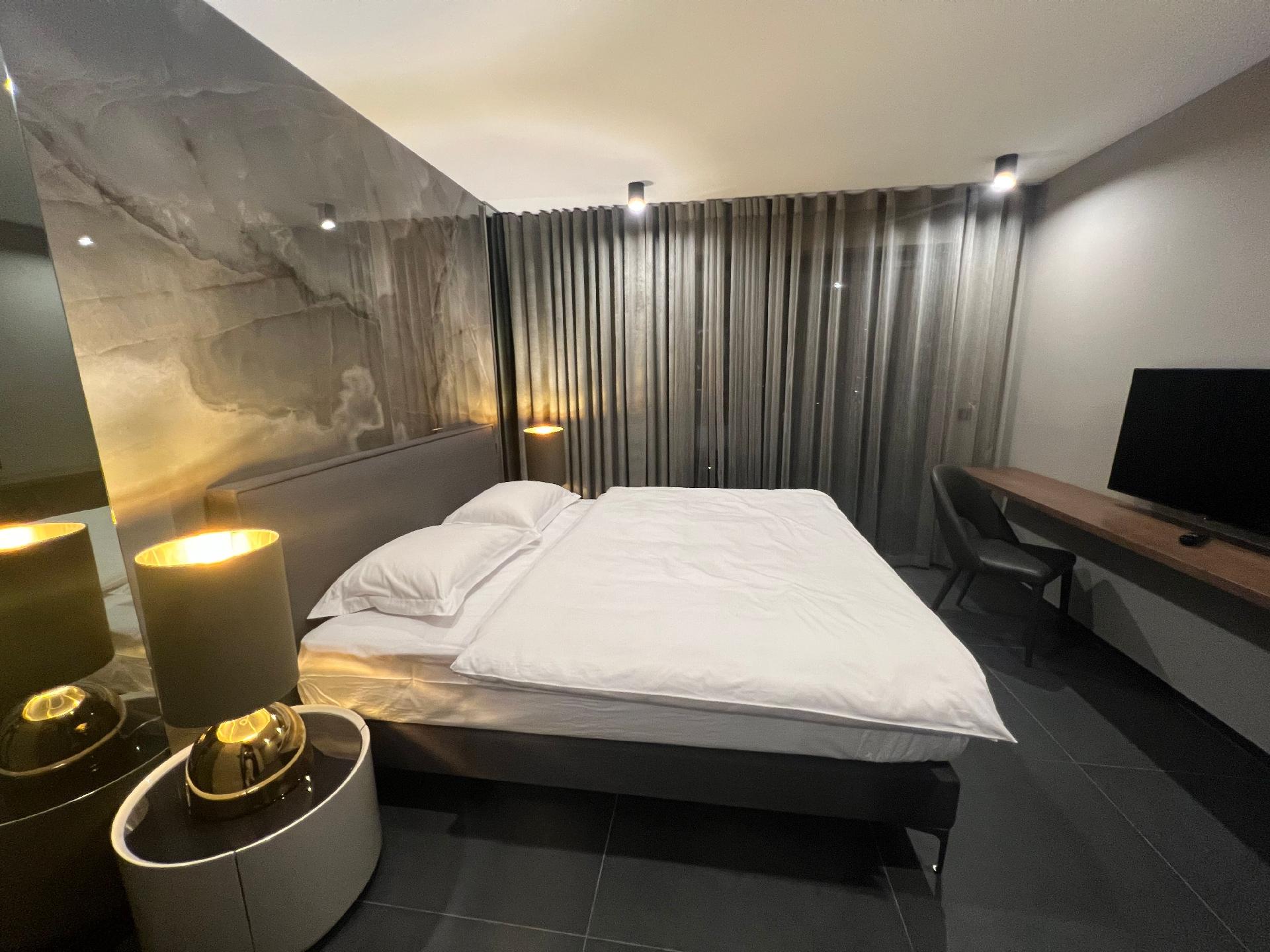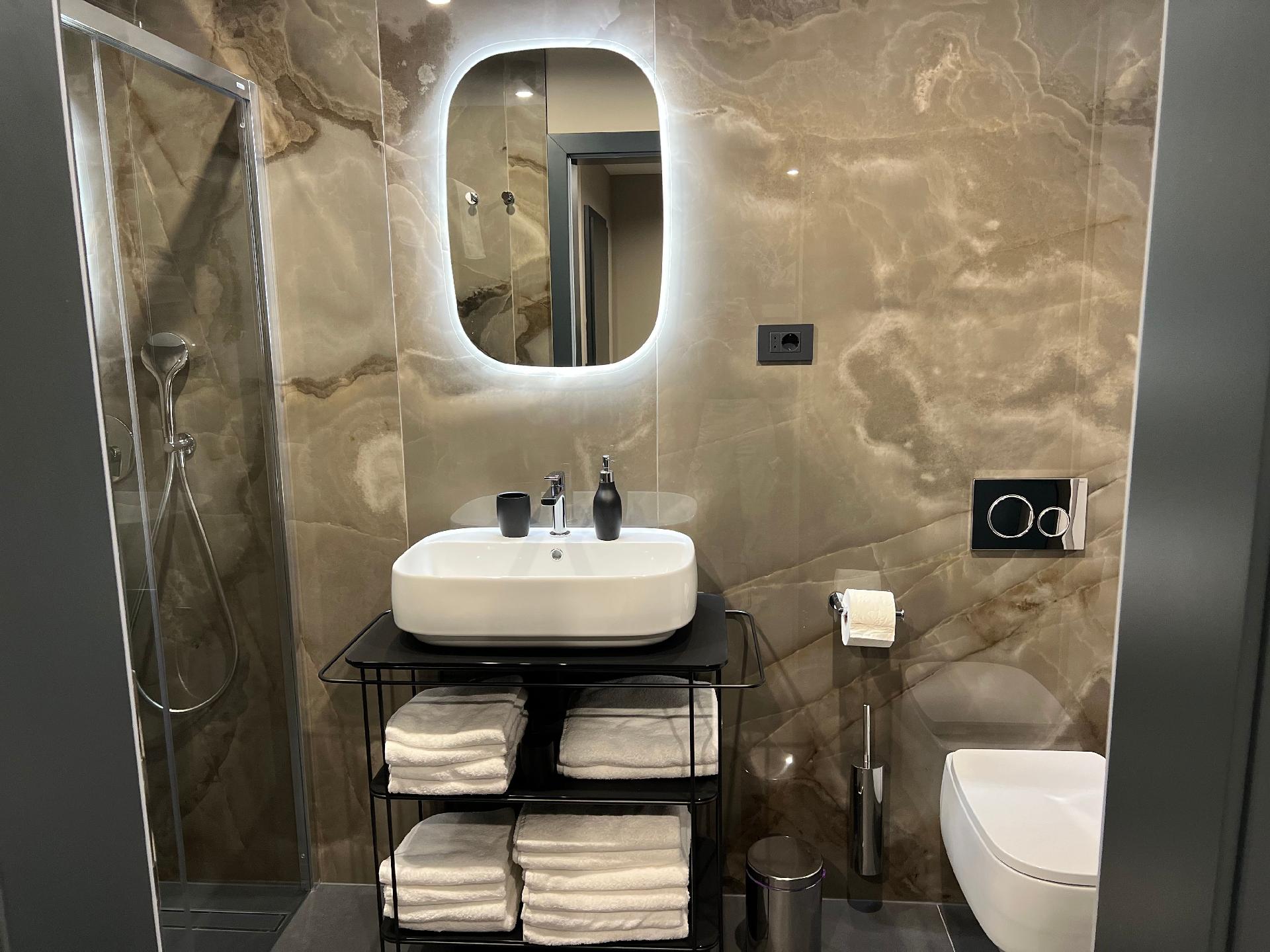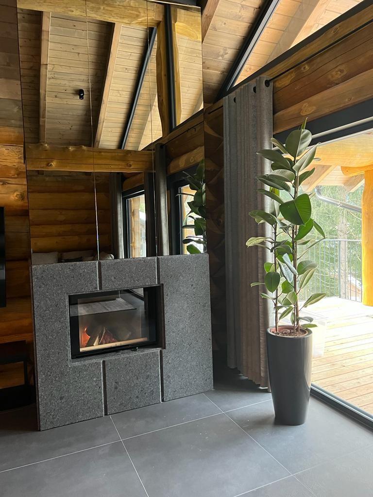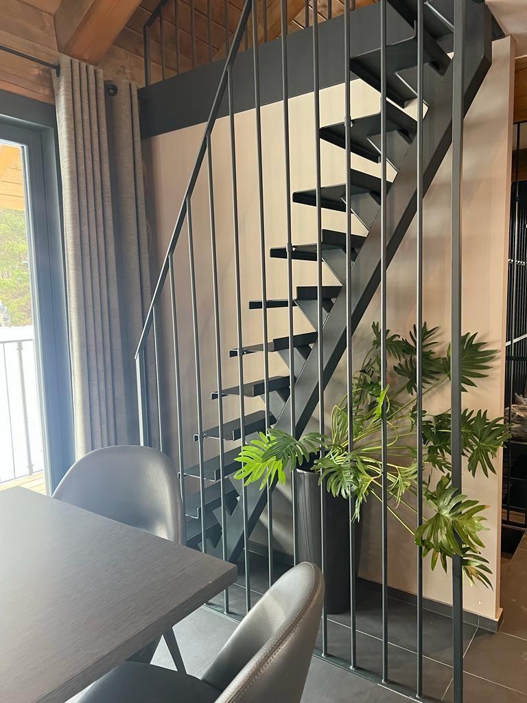 Im Obergeschoss befindet sich ein sehr großer, doppelt hoher Wohnbereich mit wunderschön freigelegten Holzbalken und einem offenen Kamin. Die ganze Etage ist von einer großen Terrasse mit Blick auf die Stadt umgeben. Es gibt eine voll ausgestattete Küche mit einer gemütlichen Essecke. Der beheizte Skiraum ist direkt von außen zugänglich und eine Gästetoilette befindet sich ebenfalls auf dieser Etage.