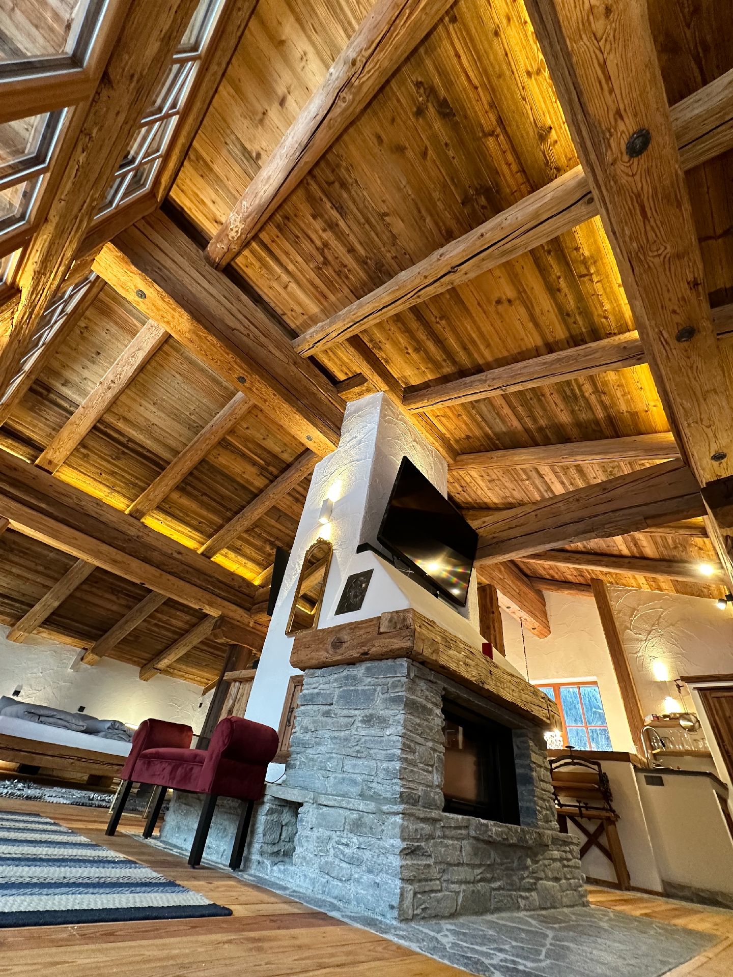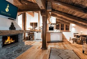 Im Inneren des Luxus-Appartements erwarten Sie nicht nur ein offener Kamin, der den gemütlichen Wohn-Essbereich vom Schlafbereich trennt, sondern auch ein Badezimmer, das höchsten Ansprüchen gerecht wird. Die modern ausgestattete Küche mit hochwertiger Kochinsel und Weinklimaschrank sowie das stilvolle Interieur aus natürlichen Materialien wie Naturstein und Holz schaffen eine Atmosphäre von Stil und Gemütlichkeit.