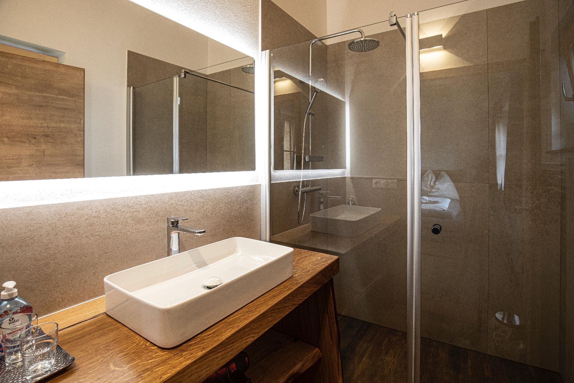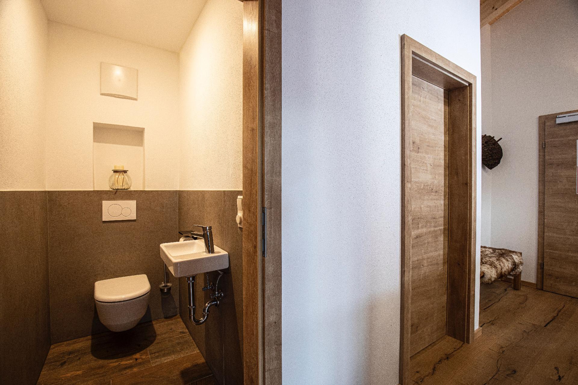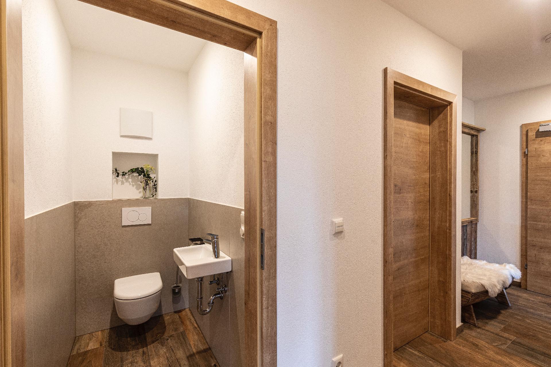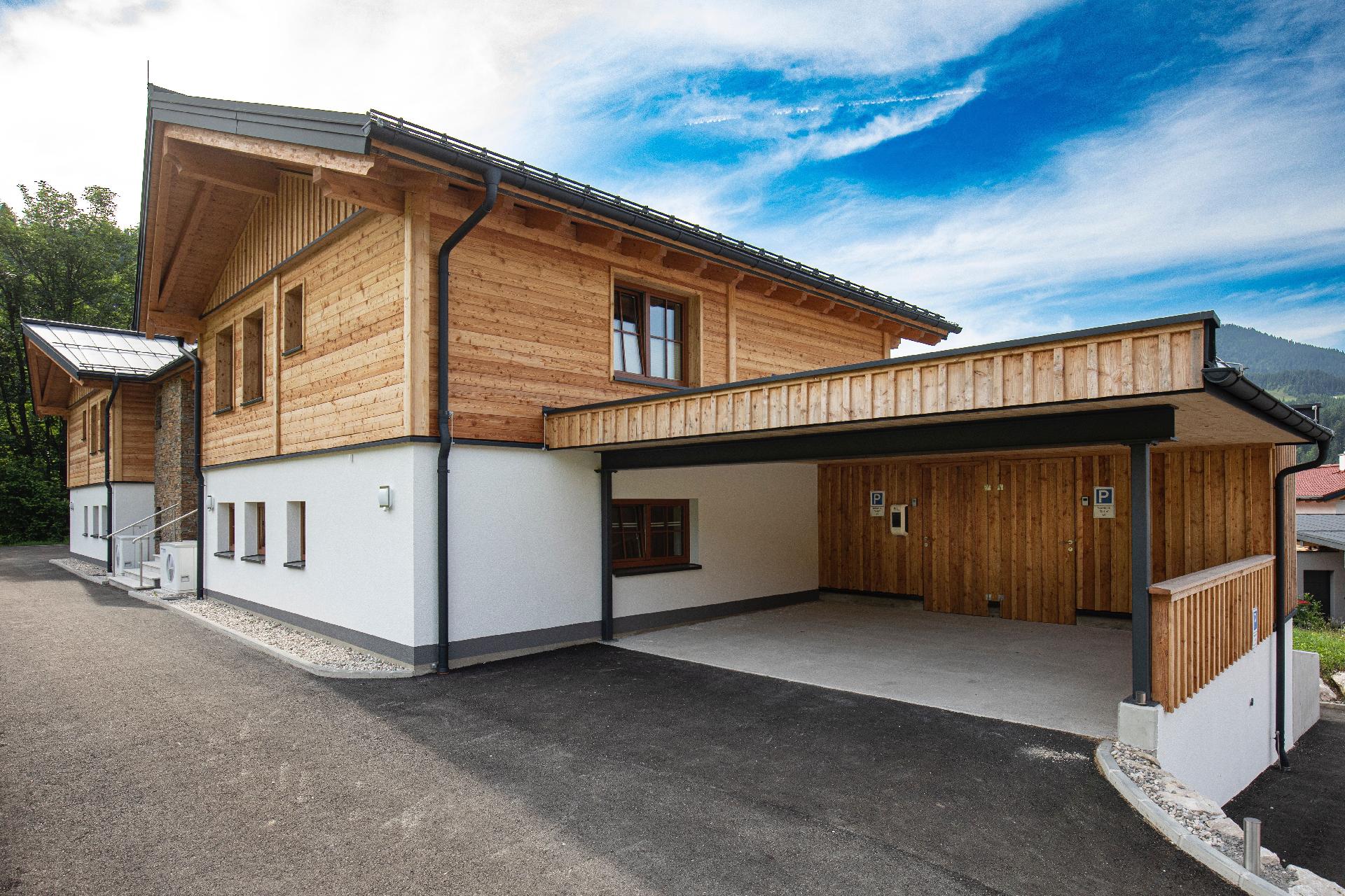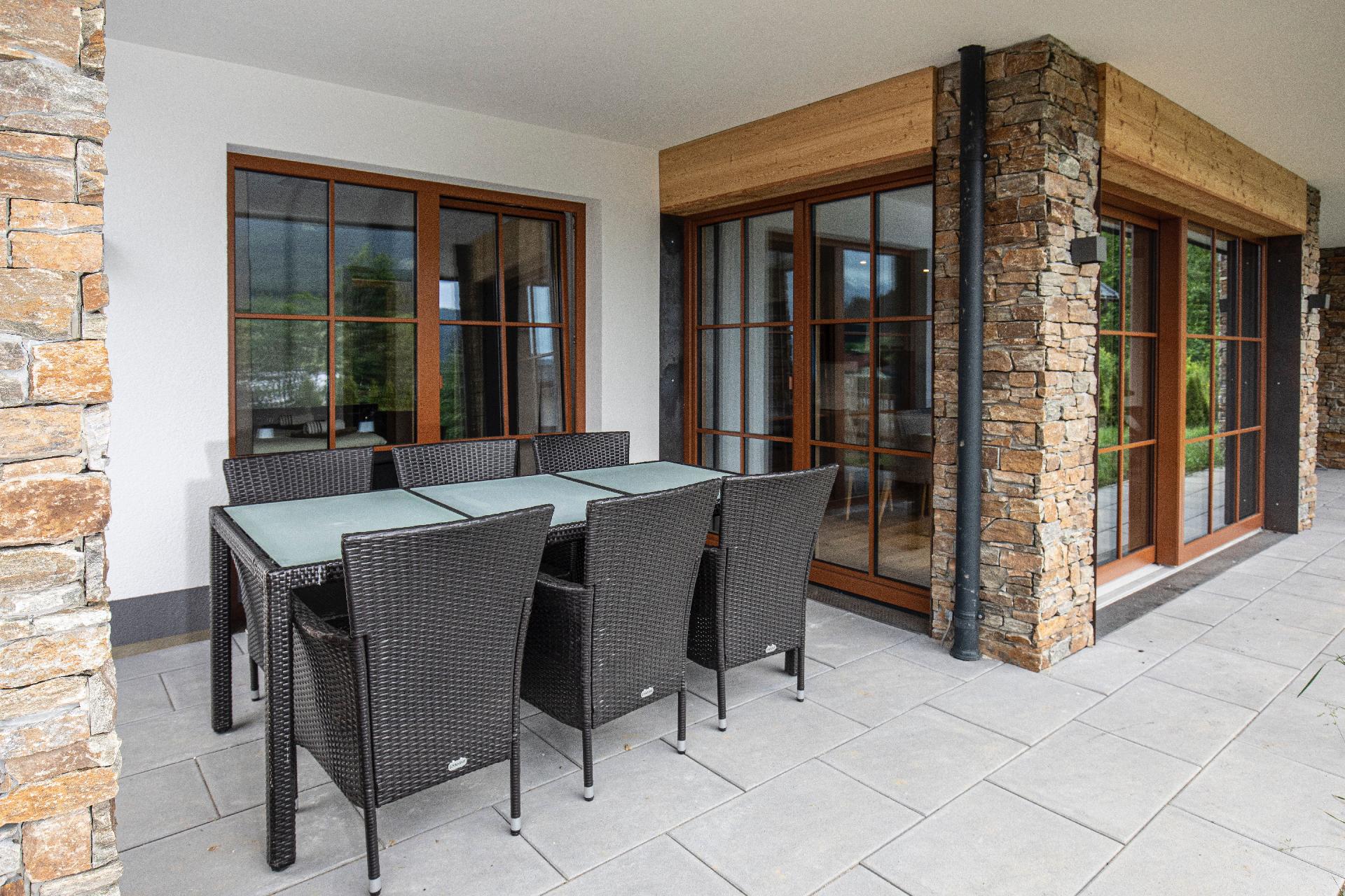 Jedes Chalet verfügt über zwei große Terrassenflächen sowie einem Zugang zum Garten. Ausserdem verfügt es über zwei Carport Stellplätze mit je einer E- Ladesäule und zwei versperrbare Abstellräume für Skier, Räder usw..