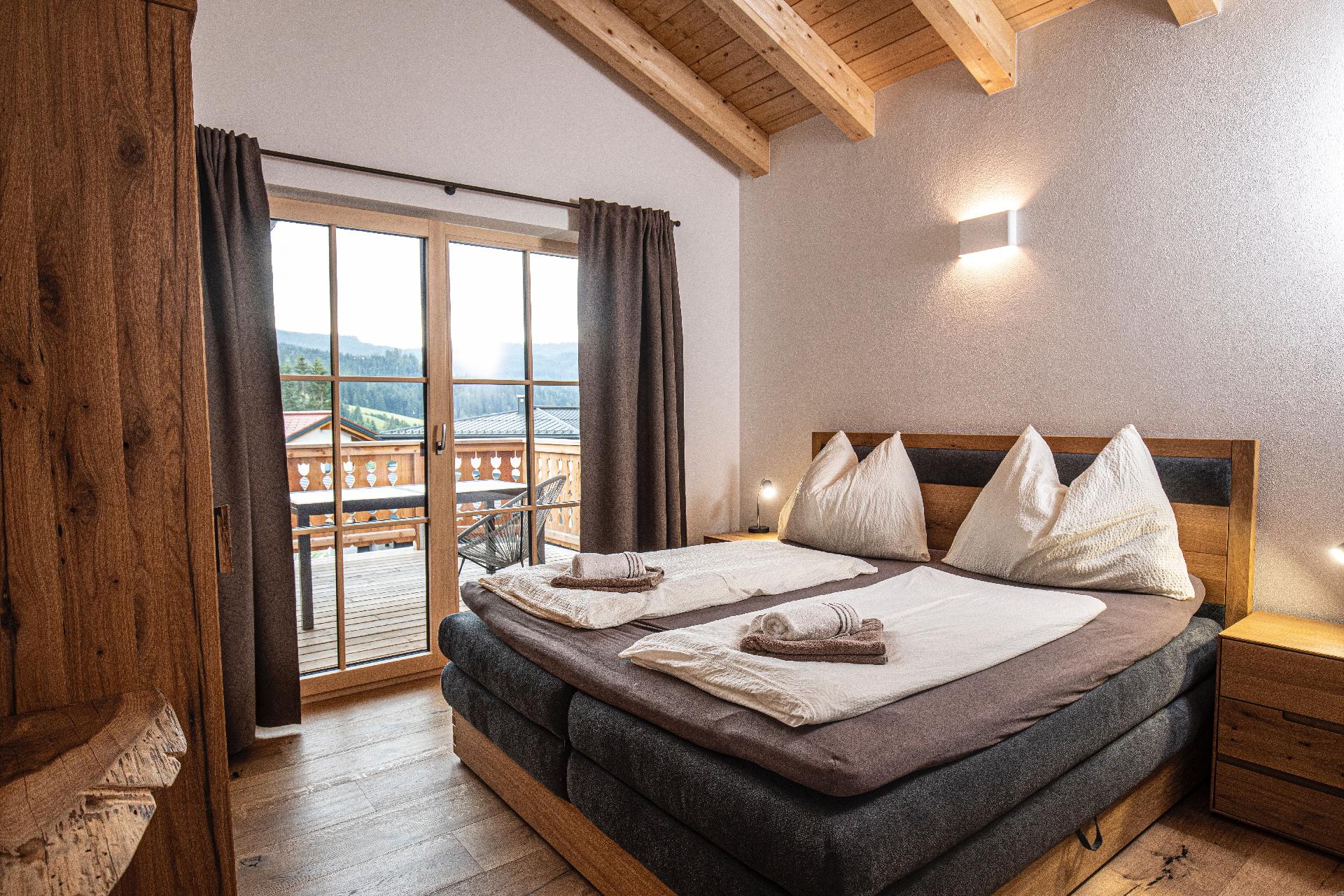 Man genießt einen herrlichen Ausblick auf Berge, grüne Wiesen, Wälder und im Winter direkt auf die Skipiste.