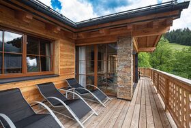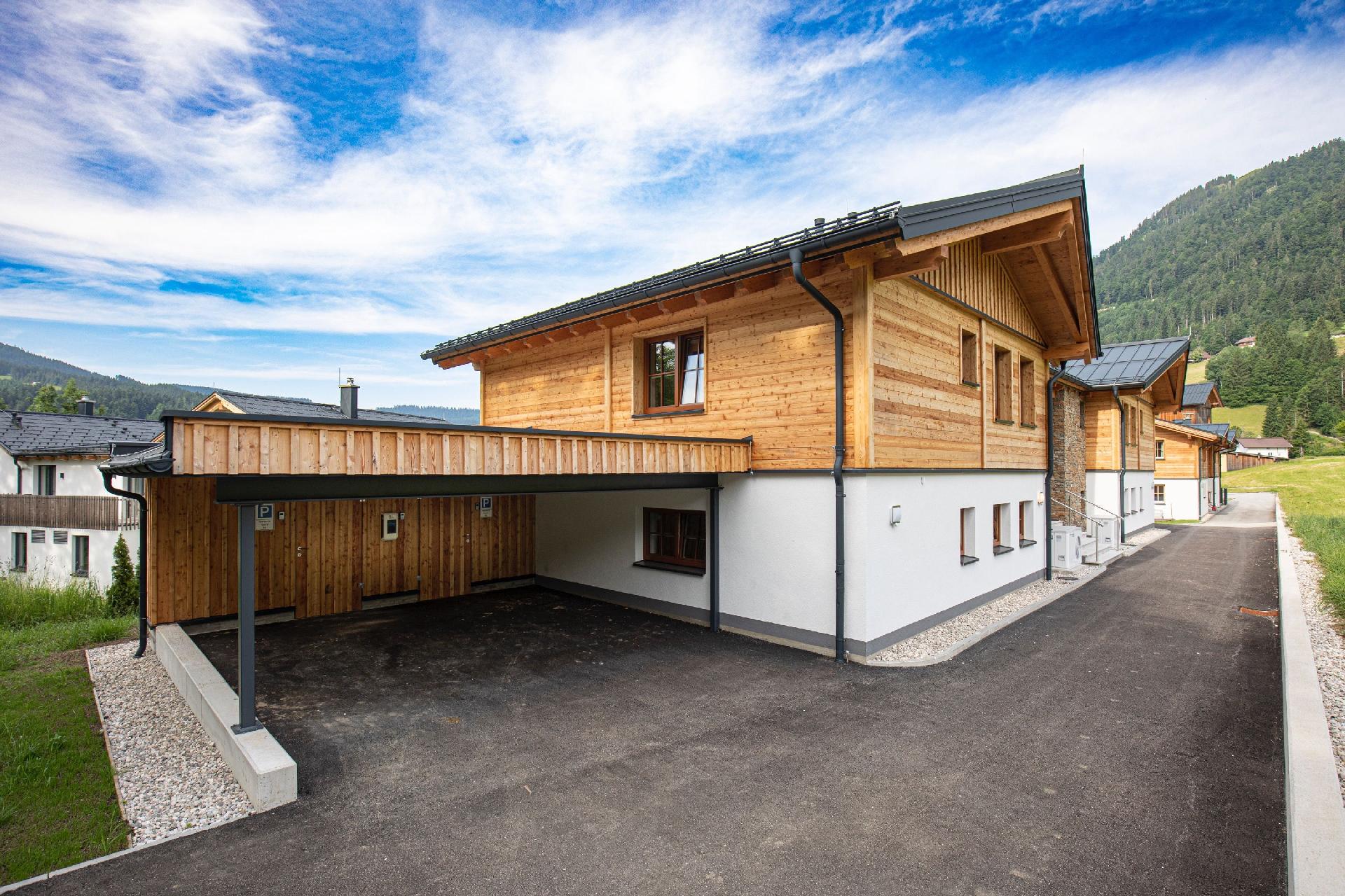 Jedes Chalet verfügt über zwei große Terrassenflächen sowie einem Zugang zum Garten. Ausserdem verfügt es über zwei Carport Stellplätze mit je einer E- Ladesäule und zwei versperrbare Abstellräume für Skier, Räder usw..