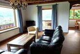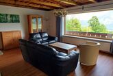 * Geräumiges Wohnzimmer mit großem Panorama-Fenster mit grandiosem See- und Bergblick, Fernseher mit SAT-TV, Radio.
