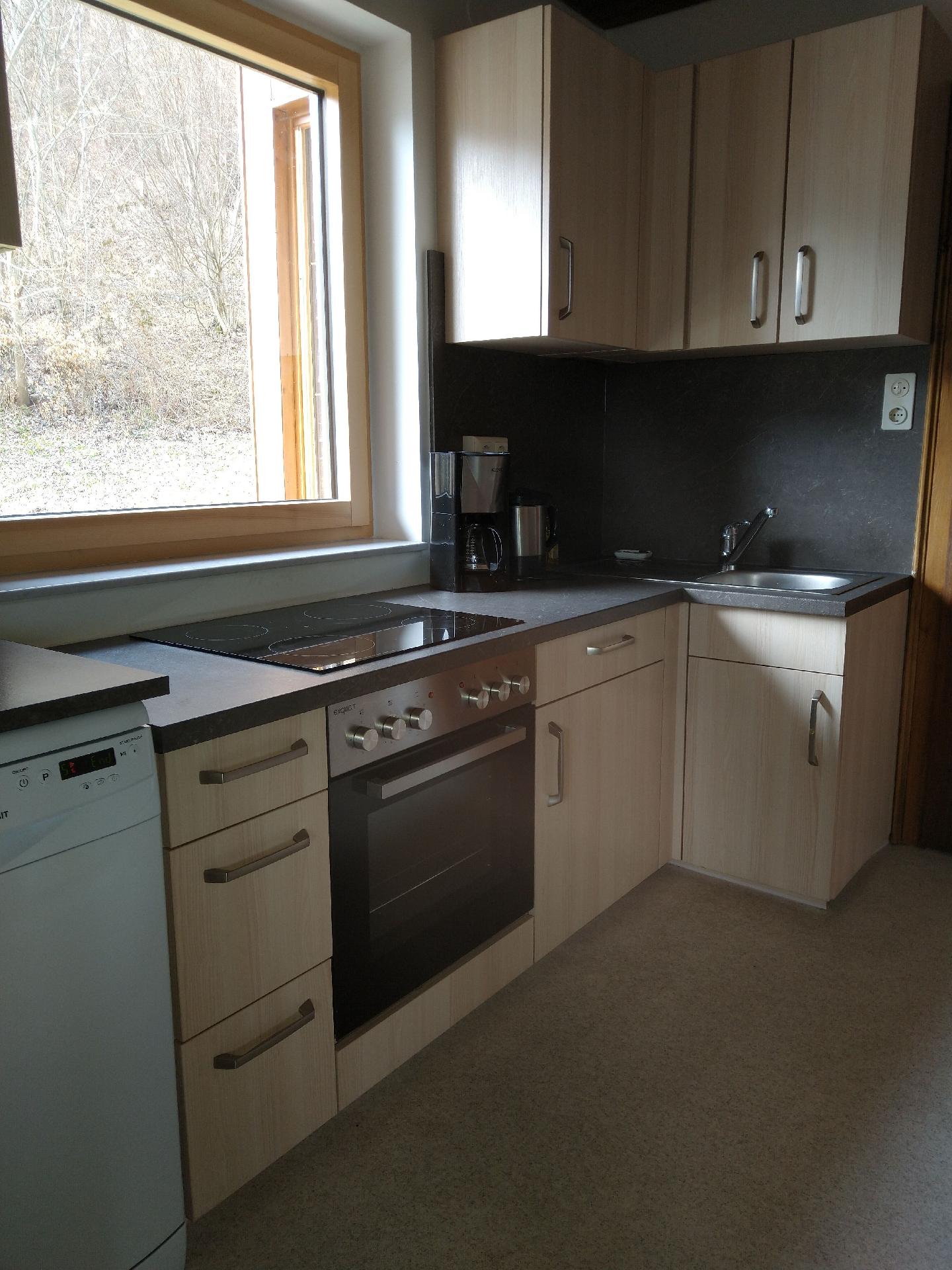 * Kleine, moderne Küche: E-Herd mit Backrohr, Mikrowelle, Kaffeemaschine, Kühlschrank, kleiner Geschirrspüler.