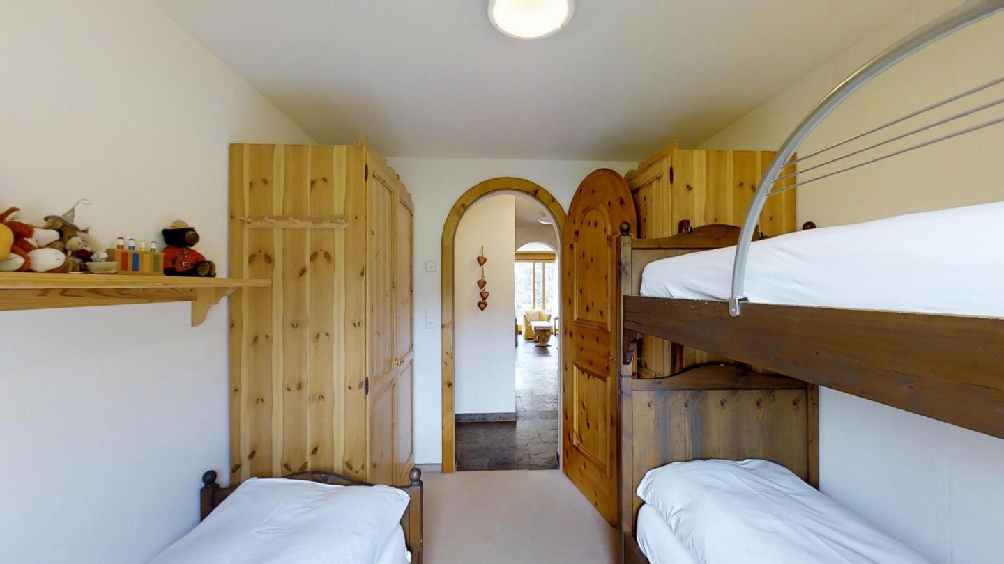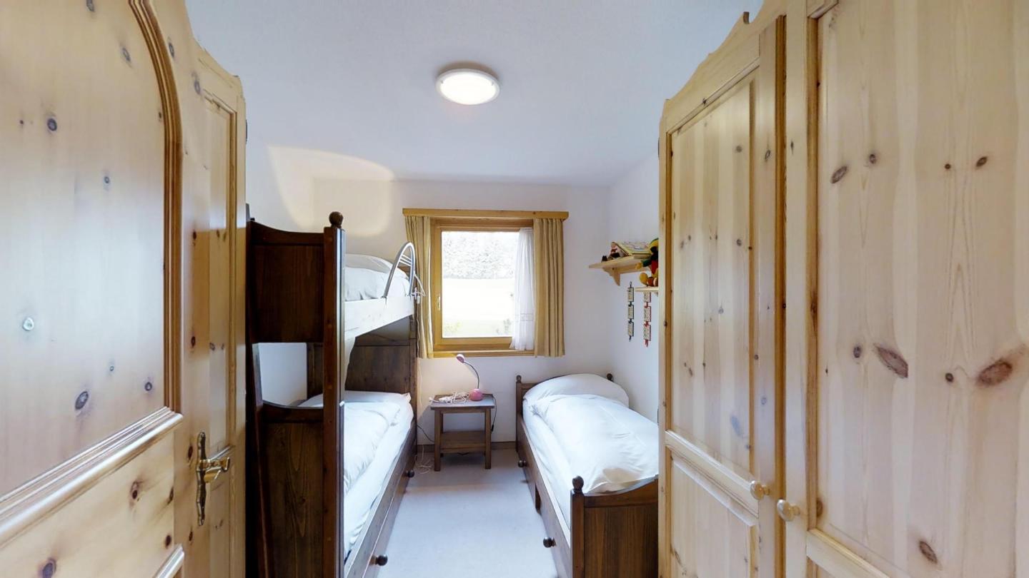 3 – Zimmerwohnung, ca.70 m², im EG. Eingang mit Garderobe. Wohn-/Esszimmer mit Fernseher, Radio, CD und Internet. Ausgang auf den Gartensitzplatz. Offene Küche mit Backofen, Geschirrspülmaschine, Kaffeemaschine (Chicco d'Oro), Raclette und Fondue Set, Wasserkocher und Kühlschrank. Ein Doppelzimmer mit Bad Dusche/WC/Lavabo. Ein Zimmer mit Kajüttenbett und ein Einzelbett. Ein Bad mit Wanne/WC und Lavabo. Waschküche zur gemeinsamen Benützung. Zur Wohnung gehört auch ein Garagenparkplatz max. Höhe 1.90M. Haustiere sind nicht erlaubt.