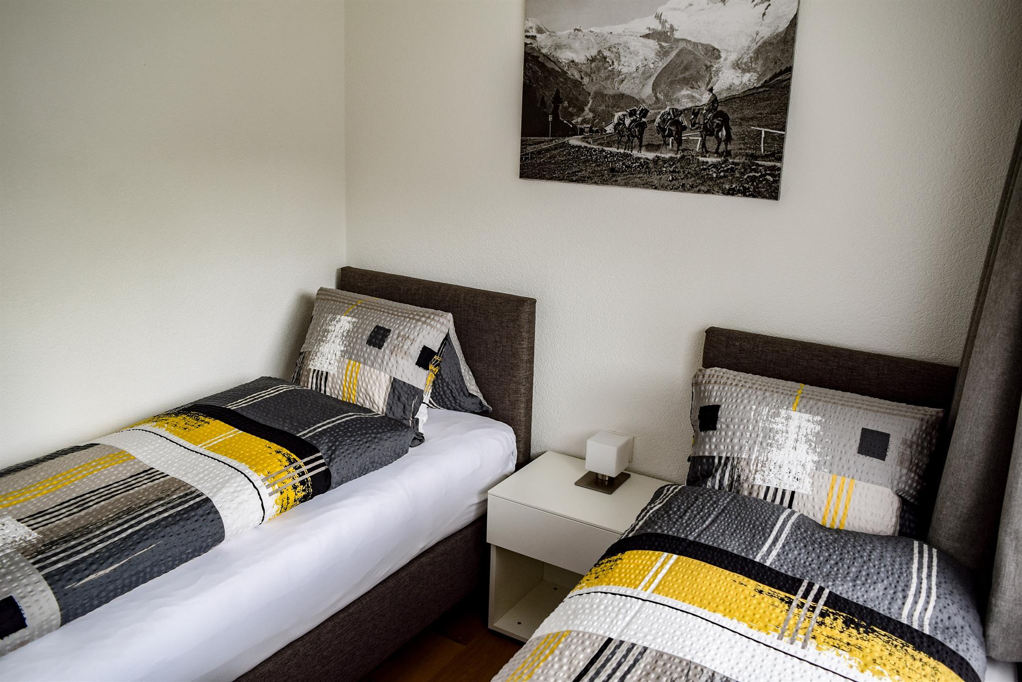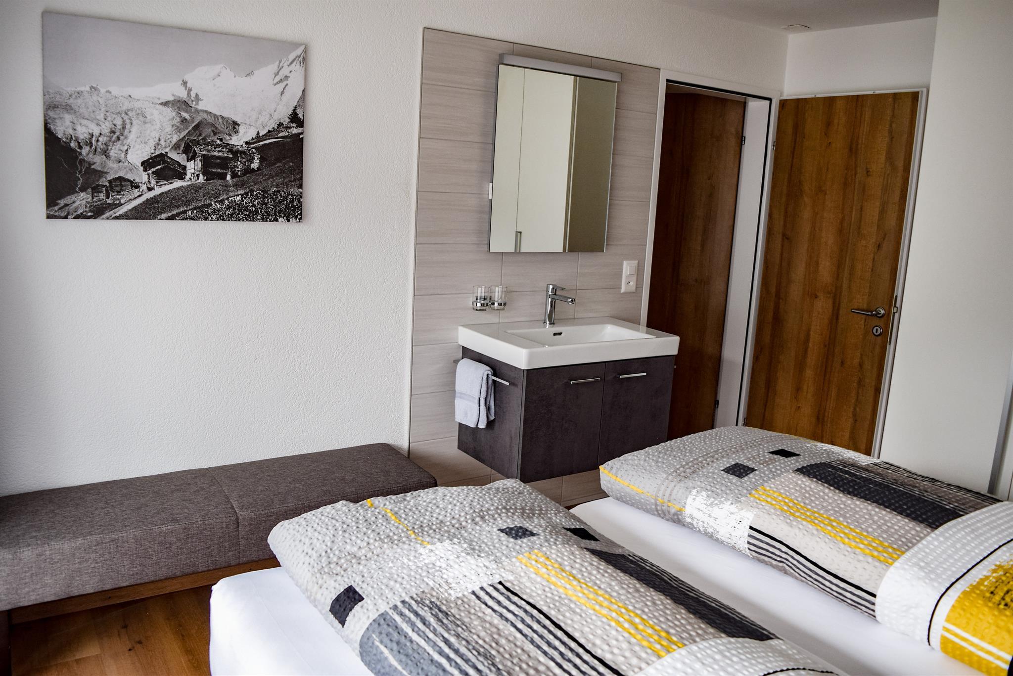 Geräumige 3 Zimmerwohnung (ca. 65m2), 2. Stock, 1 Doppelschlafzimmer, 1 Zweibettzimmer (Die Betten sind bei der Ankunft bezogen), Dusche/WC, moderne Küche mit Geschirrspüler, Wohn- Essraum, Kabel-TV, kostenloses WiFi.