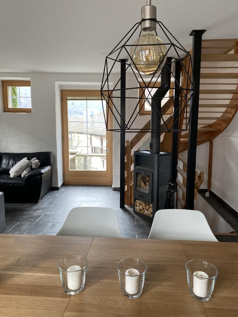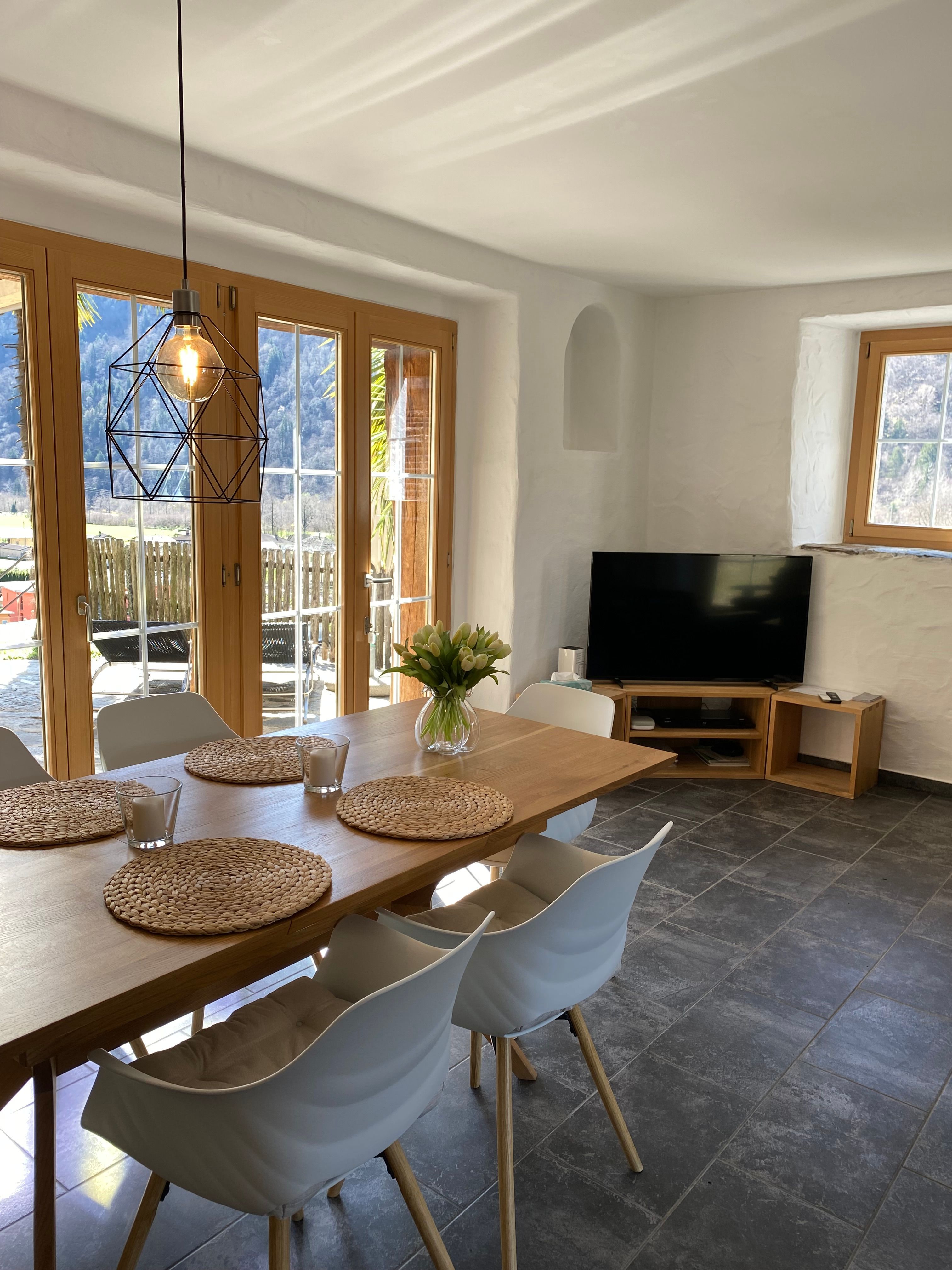 Sonstige Wohnzimmerausstattung (Wohnzimmer1): Fernseher (Swisscomtv mit 30 Stunden Replay) , Polstergruppe , Salontisch ,Esstisch u. Stühle. Treppe nach oben und nach unten abschließbar mit Kindergitter.