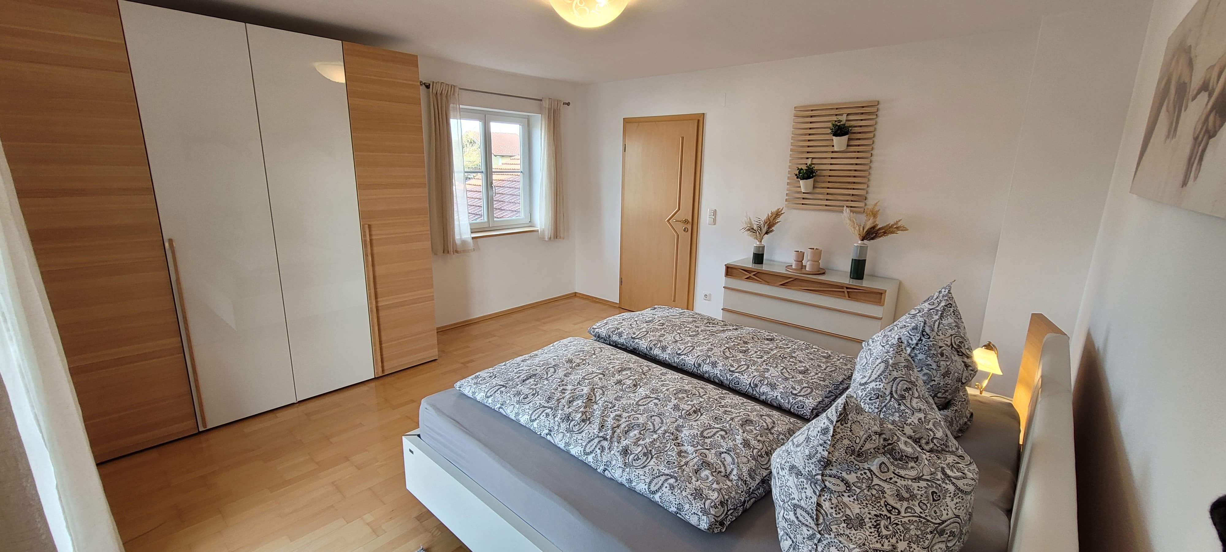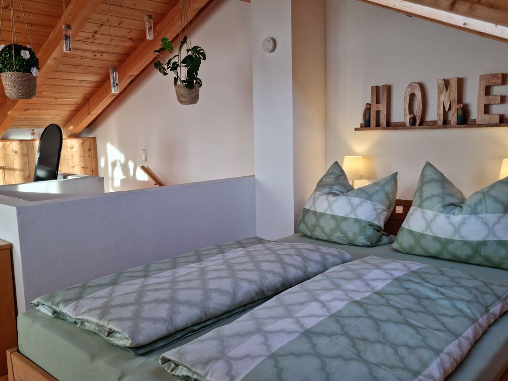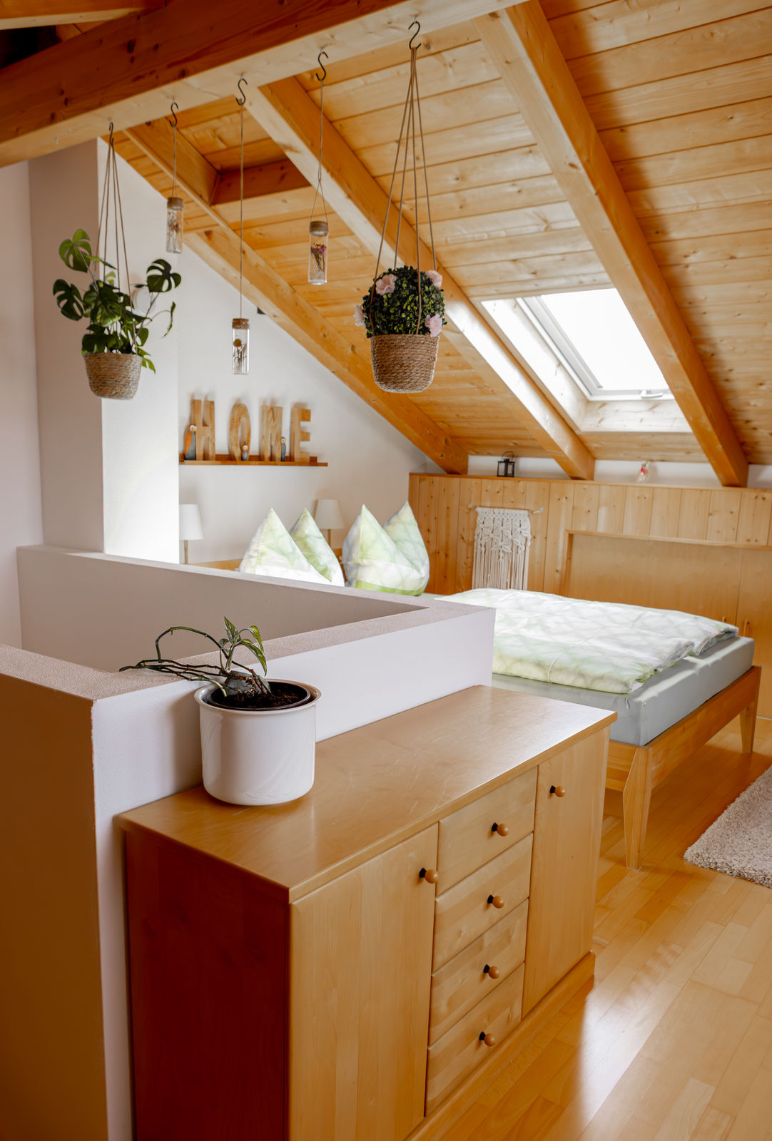 - offenes Schlafzimmer DG mit komfortablem Doppelbett in Überlänge (2,20 m) mit Blick auf die Alz