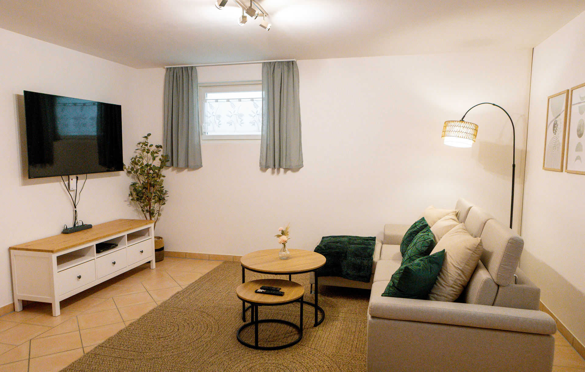 - Gemütliches Wohnzimmer UG mit Couch (+ Schlaffunktion), DVD-Player, einer Auswahl an DVDs, Büchern und einem Schreibtisch.