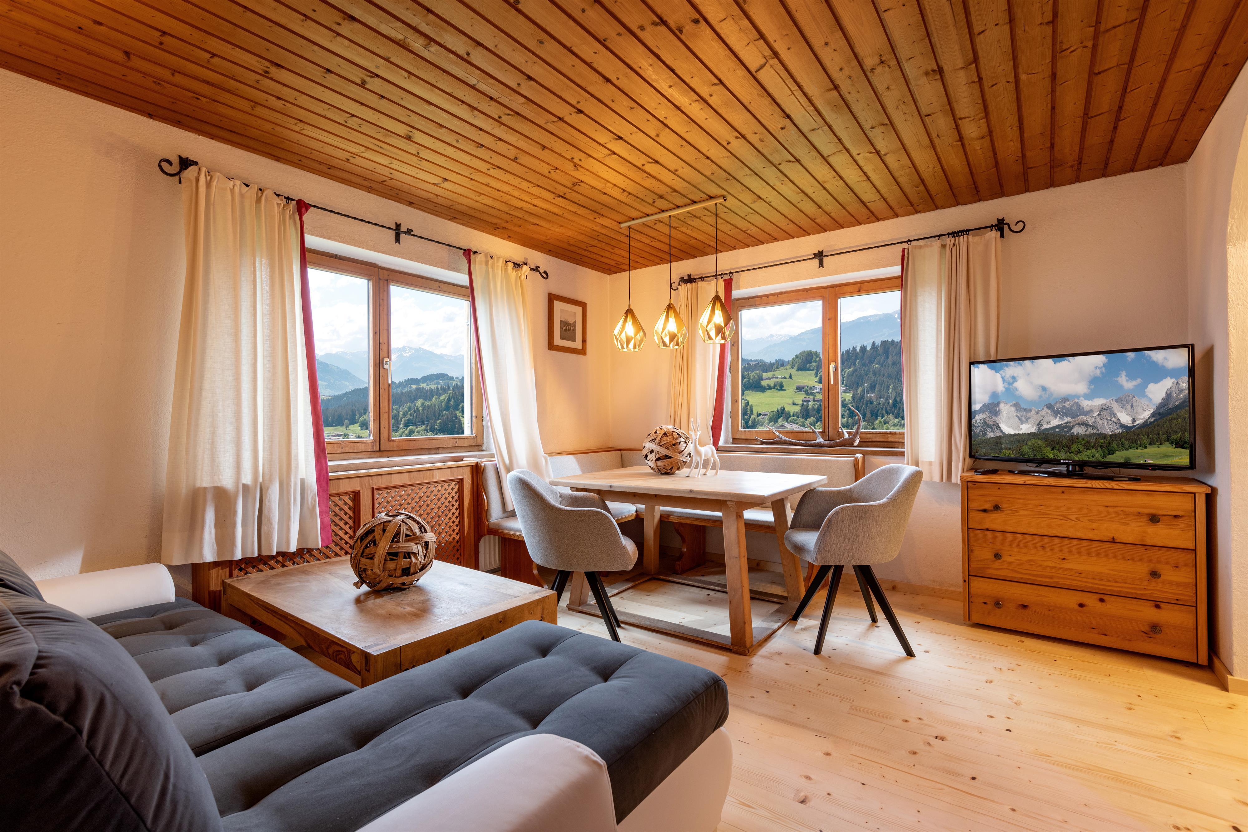 Das ca. 40 m² große Appartement verfügt über eine kleine, gut ausgestattete Küche mit einer gemütlichen Sitzecke, Flat-TV und einer ausziehbaren Schlafcouch, ein Badezimmer mit Dusche und WC sowie ein Schlafzimmer. Da diese Ferienwohnung ebenerdig ist, gelangen Sie mit nur wenigen Schritten zur Terrasse. Urig, einfach & charmant – ein altes Tiroler Haus mit Herz und Ecken. Kein Luxus, aber grandiose Aussicht & echte Persönlichkeit. Ganzjährig kostenloser Whirlpool auf der Wiese.