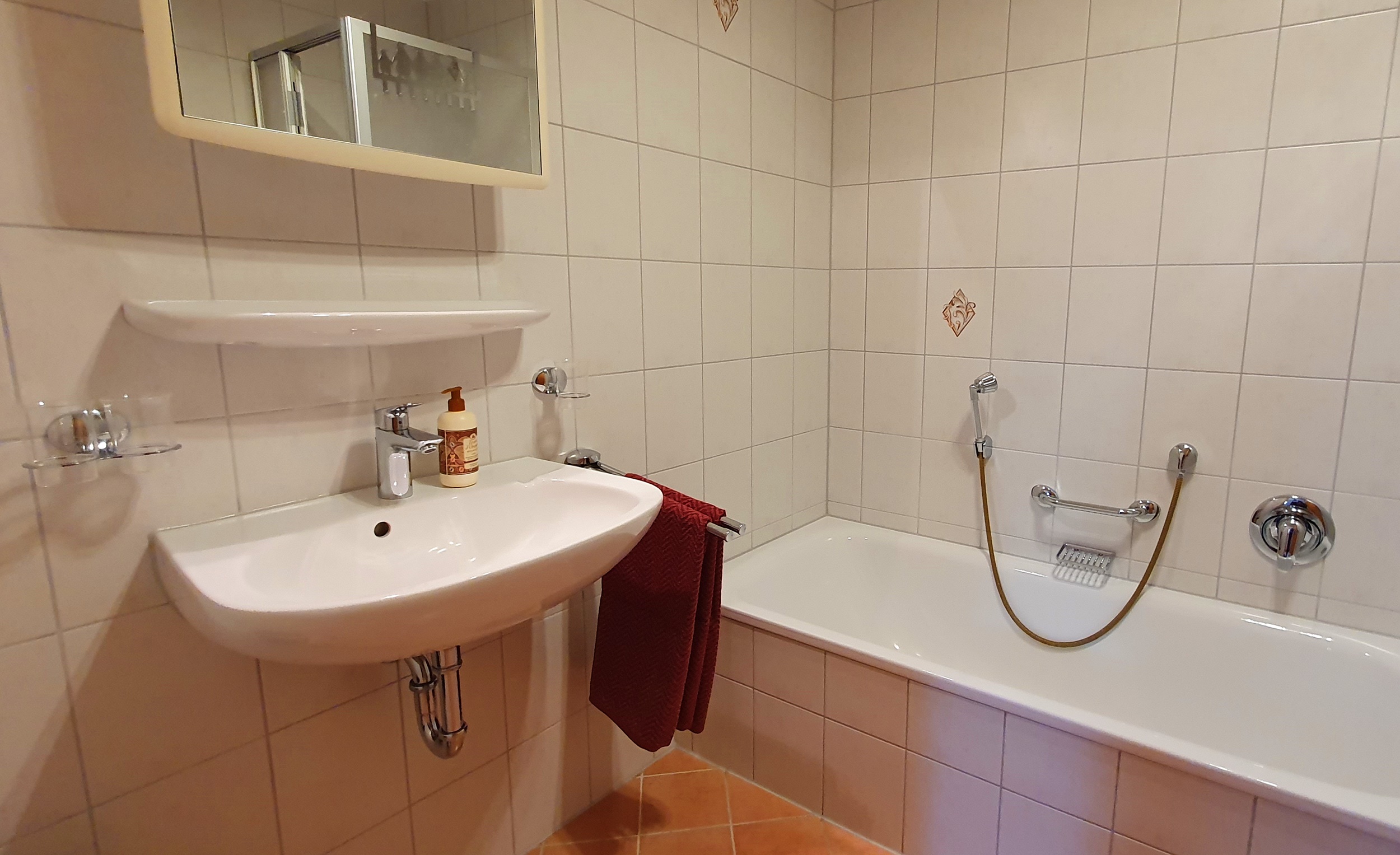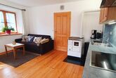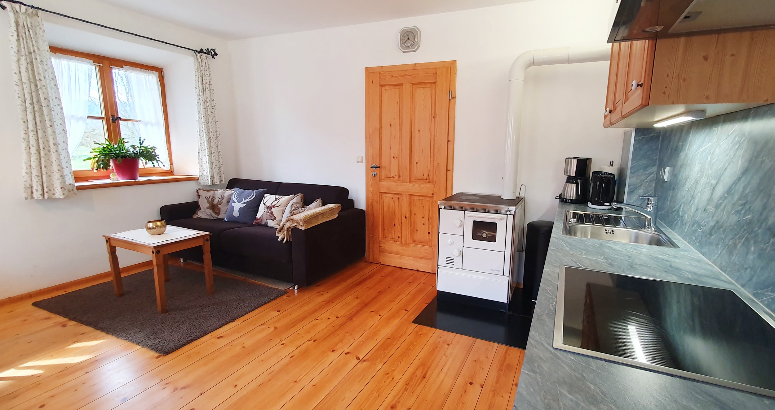 Gemütlicher Wohnraum mit Schlafcouch, 1 Schlafzimmer mit Doppelbett, Sat-TV, Bad/Dusche, WC extra, Z-Heizung und Holzofen, Terrasse, Holz- und Fliesenböden, Nichtraucher, Erdgeschoß, familienfreundlich, Naturlandbiobetrieb, Liegewiese. Die Schlafcouch ist gut geeignet für 2 Erwachsene oder 2 Kinder und hat eine seperate Matraze. Ein Kinderbett oder Kinderreisebett kann kostenlos zur Verfügung gestellt werden, um den Wohnraum frei zu halten. Die Küche ist vollausgestattet mit Spülmaschine und Kühl-/Gefrierkombination.