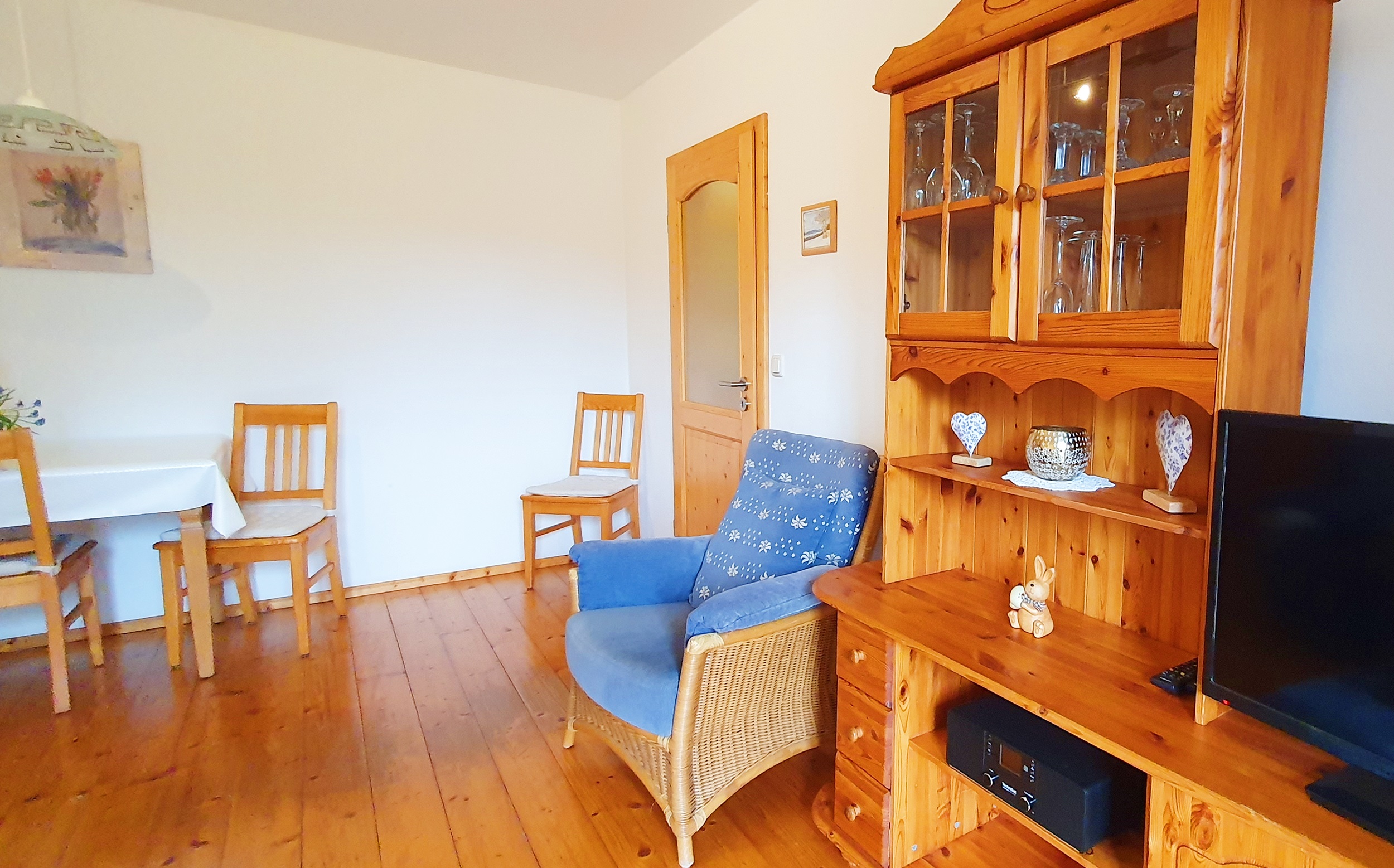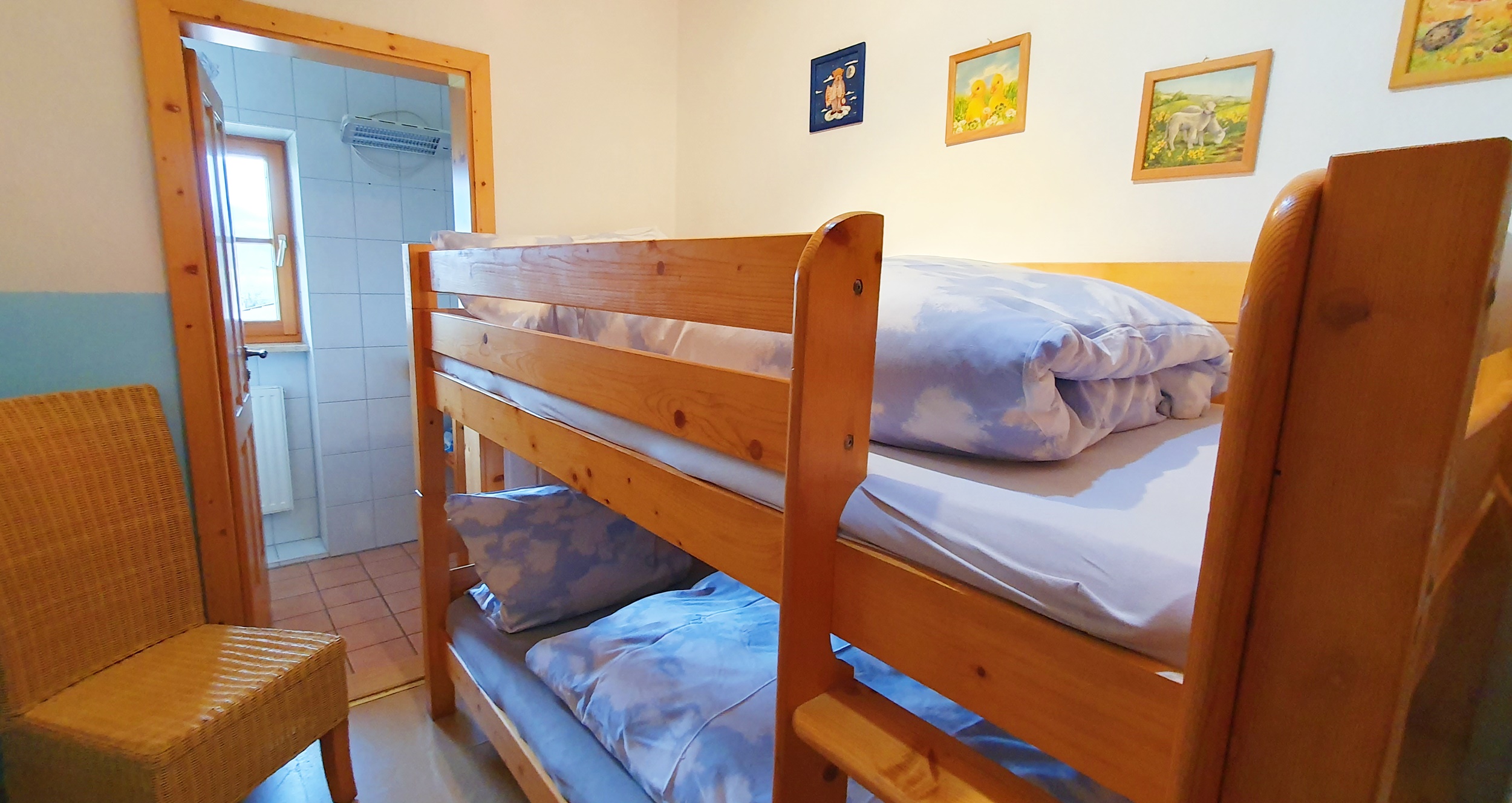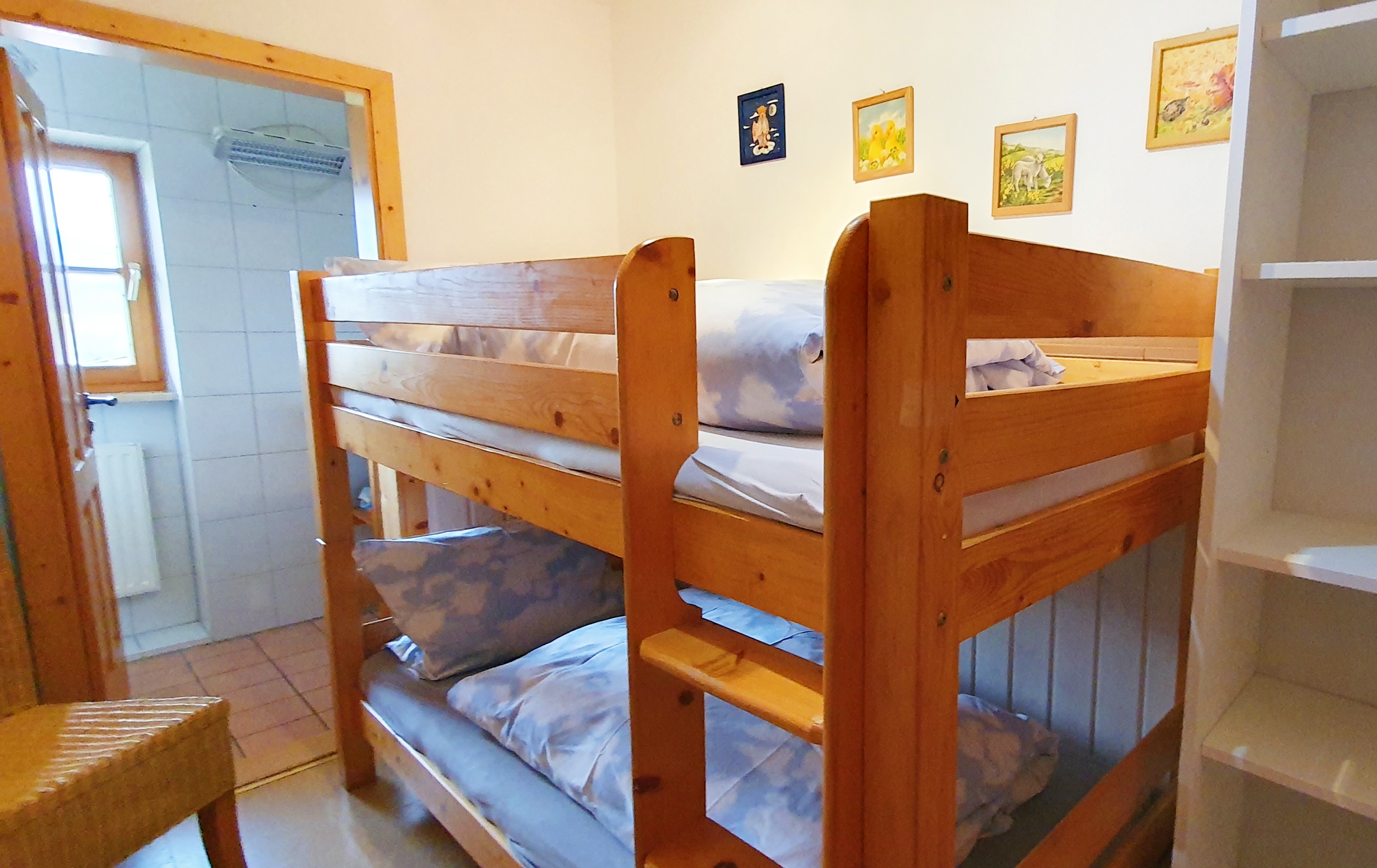 Gemütliche Wohnung im 1 Stock, 2 Schlafzimmer eines mit Doppelbett und eins mit Etagenbett, Sat-TV, Bad/Dusche, WC , Heizung, Balkon, Holz- und Fliesenböden, Nichtraucher, familienfreundlich, Naturlandbiobetrieb. Die Küche ist vollausgestattet mit Spülmaschine und Kühl-/Gefrierkombination. Für das zweite Zimmer mit Etagenbett ist eine eigene