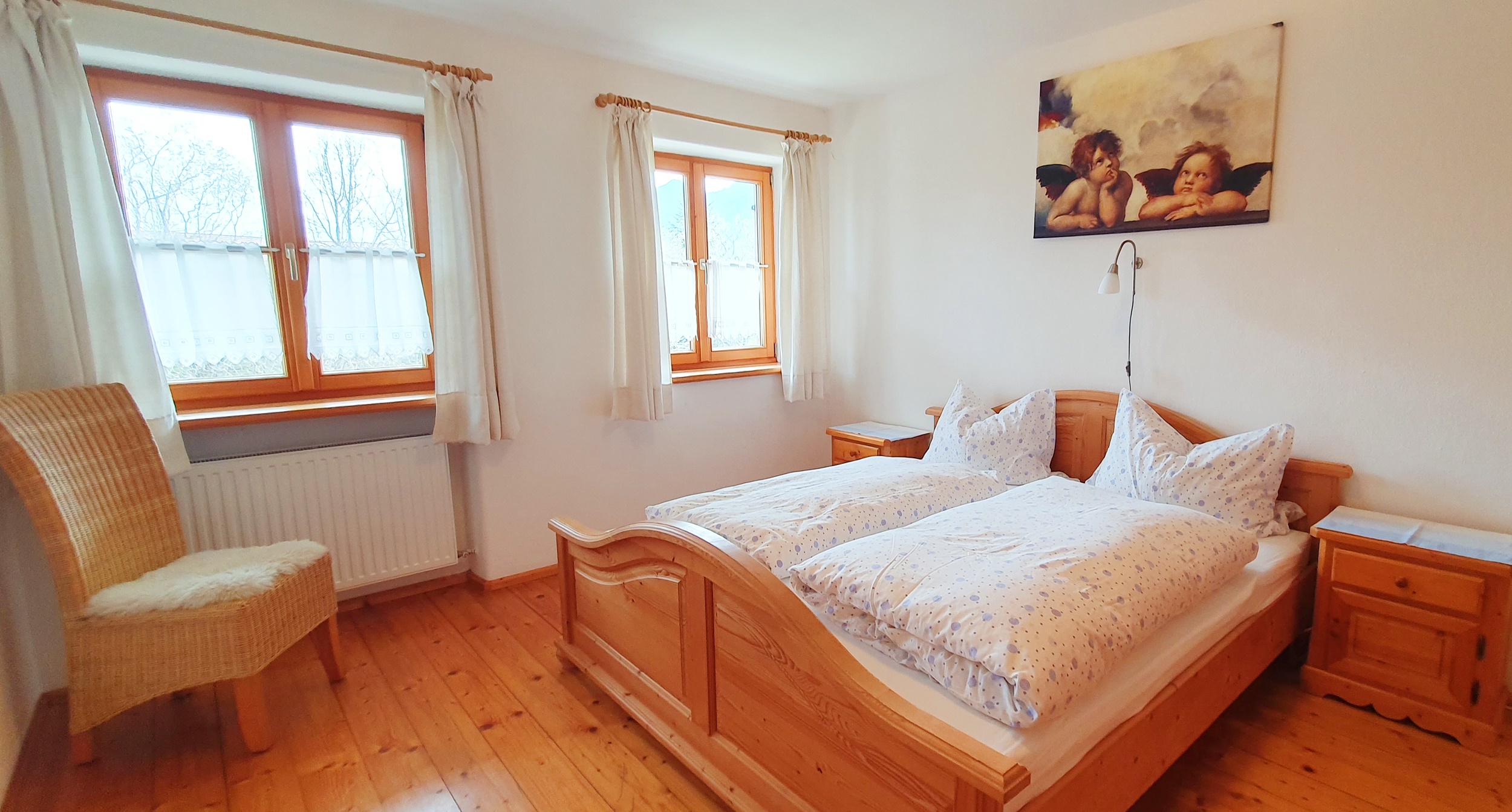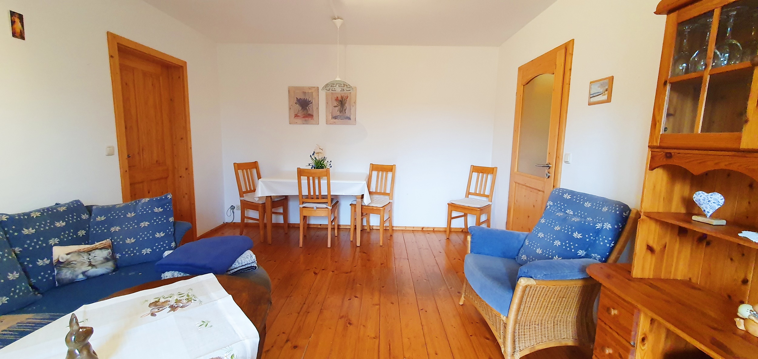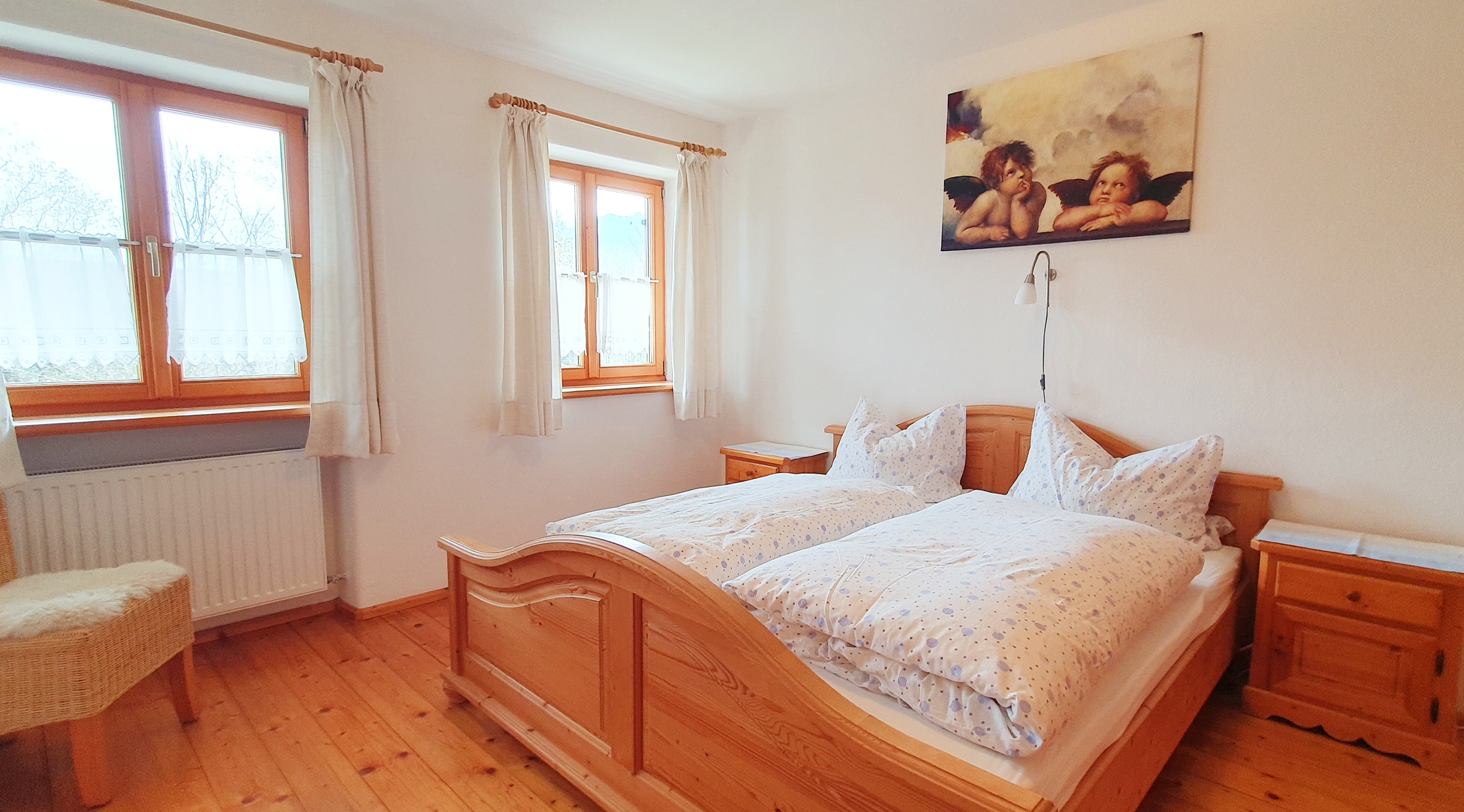 Gemütliche Wohnung im 1 Stock, 2 Schlafzimmer eines mit Doppelbett und eins mit Etagenbett, Sat-TV, Bad/Dusche, WC , Heizung, Balkon, Holz- und Fliesenböden, Nichtraucher, familienfreundlich, Naturlandbiobetrieb. Die Küche ist vollausgestattet mit Spülmaschine und Kühl-/Gefrierkombination. Für das zweite Zimmer mit Etagenbett ist eine eigene