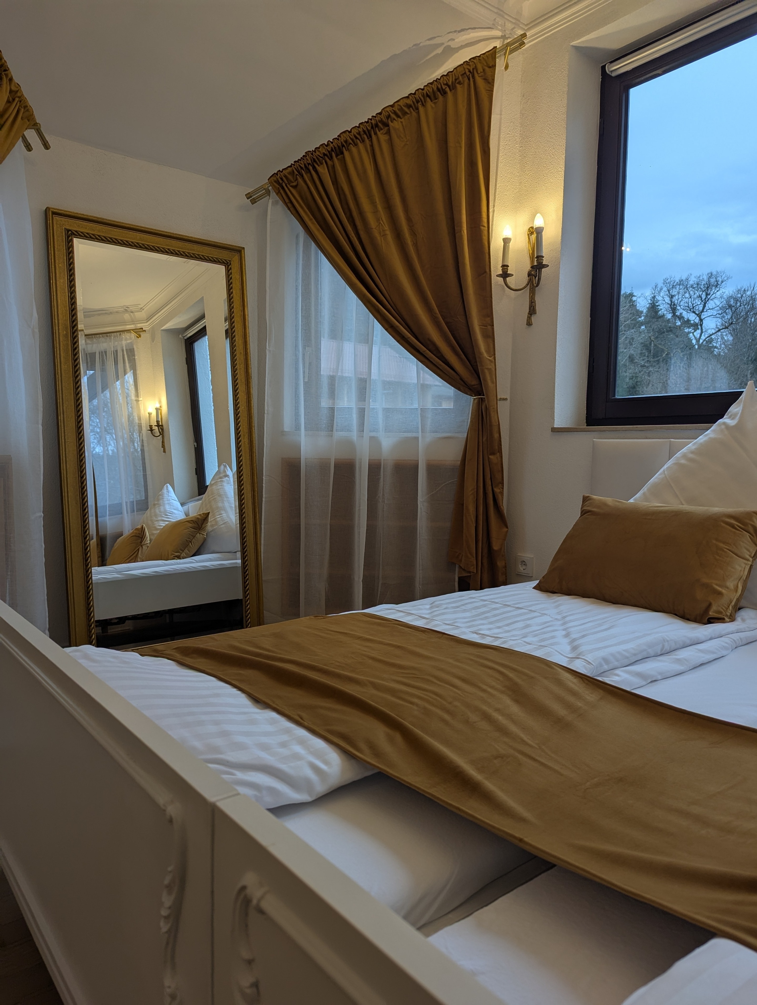 Die Kamin Suite bietet eine exklusive Auszeit, perfekt für Paare oder Familien. Genieße entspannende Stunden im privaten Whirlpool oder auf dem großen Balkon mit Blick ins Grüne. Zwei Schlafzimmer, durch eine Schiebetür getrennt, und ein gemütlicher Kamin, der mit Holz beheizt wird, schaffen eine behagliche Atmosphäre.
