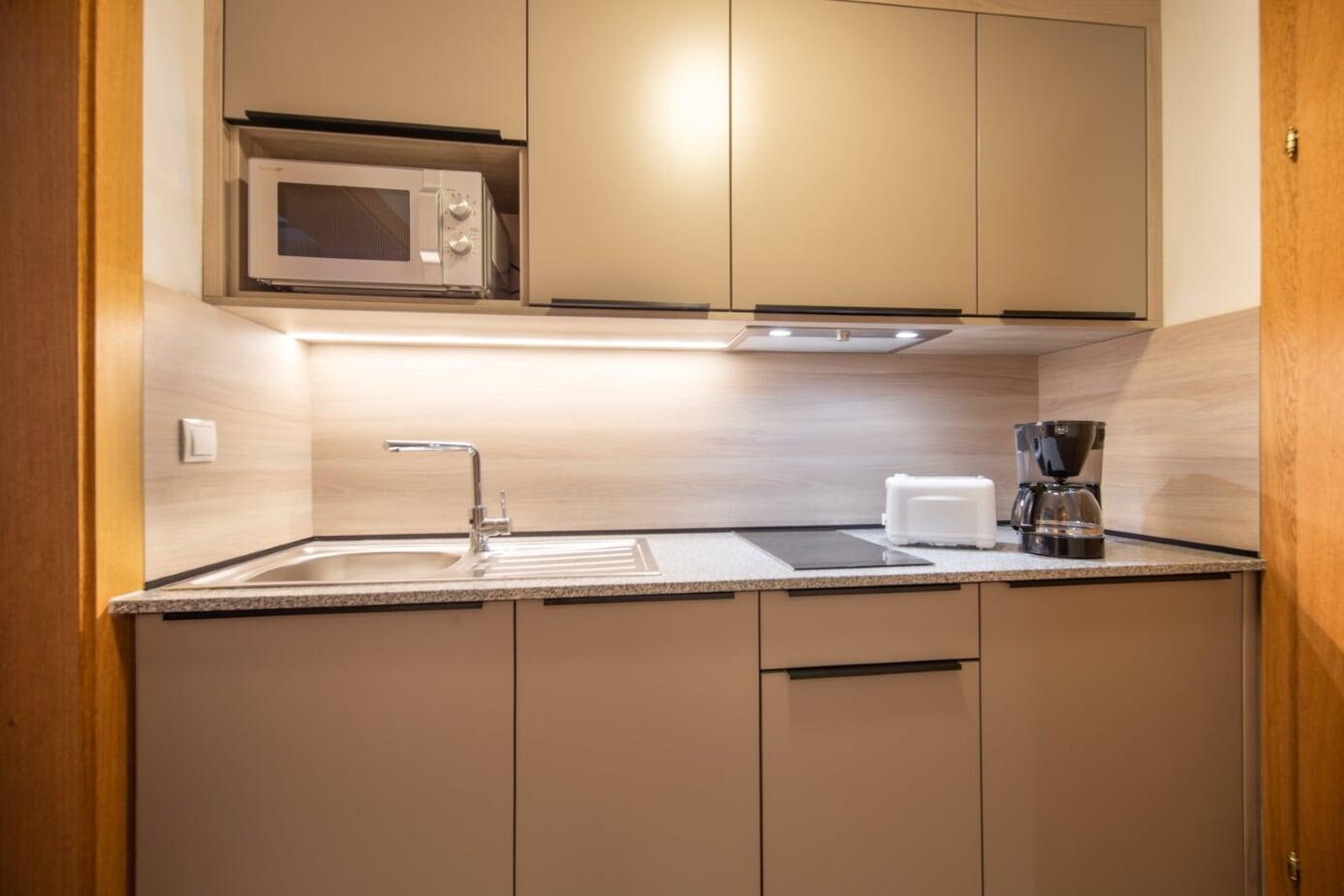 Appartement No. 3 mit ca. 35 m²: 1 Schlafzimmer mit Doppel - und Einzelbett, voll ausgestattete Wohnküche mit Einbauküche (Herd mit Backrohr, Kühlschrank, Spülmaschine, Filter-Kaffeemaschine, Wasserkocher, Geschirr, Gläser, Töpfe, Besteck etc.), Essecke, Sofa, Fernseher uvm., 1 Badezimmer mit Dusche und separtes WC, kleine Terrasse mit Sitzmöbeln und eingeschränkte Aussicht (seitlicher Blick auf die Berge). Kostenlose Pflegemittel im Badezimmer und Reinigungsmittel in der Küche.
