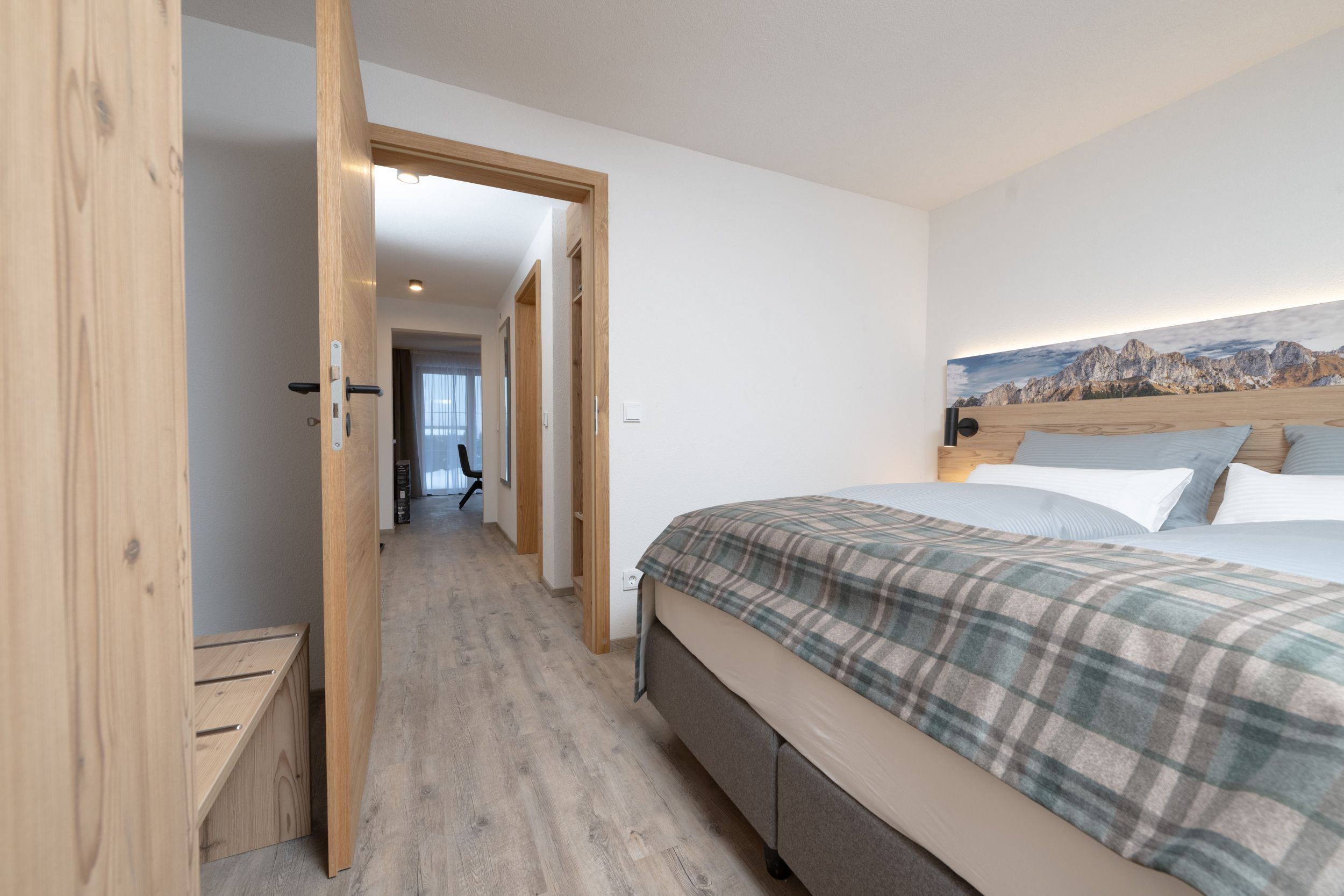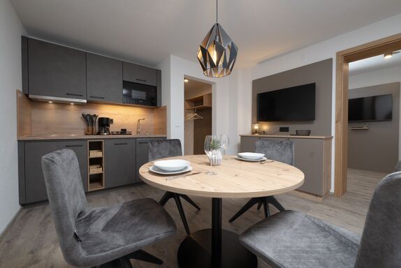 Sie blicken direkt in die umliegende Bergwelt und genießen den Komfort unserer hochwertig ausgestatteten Ferienwohnungen im rustikal-modernen Alpin-Style.