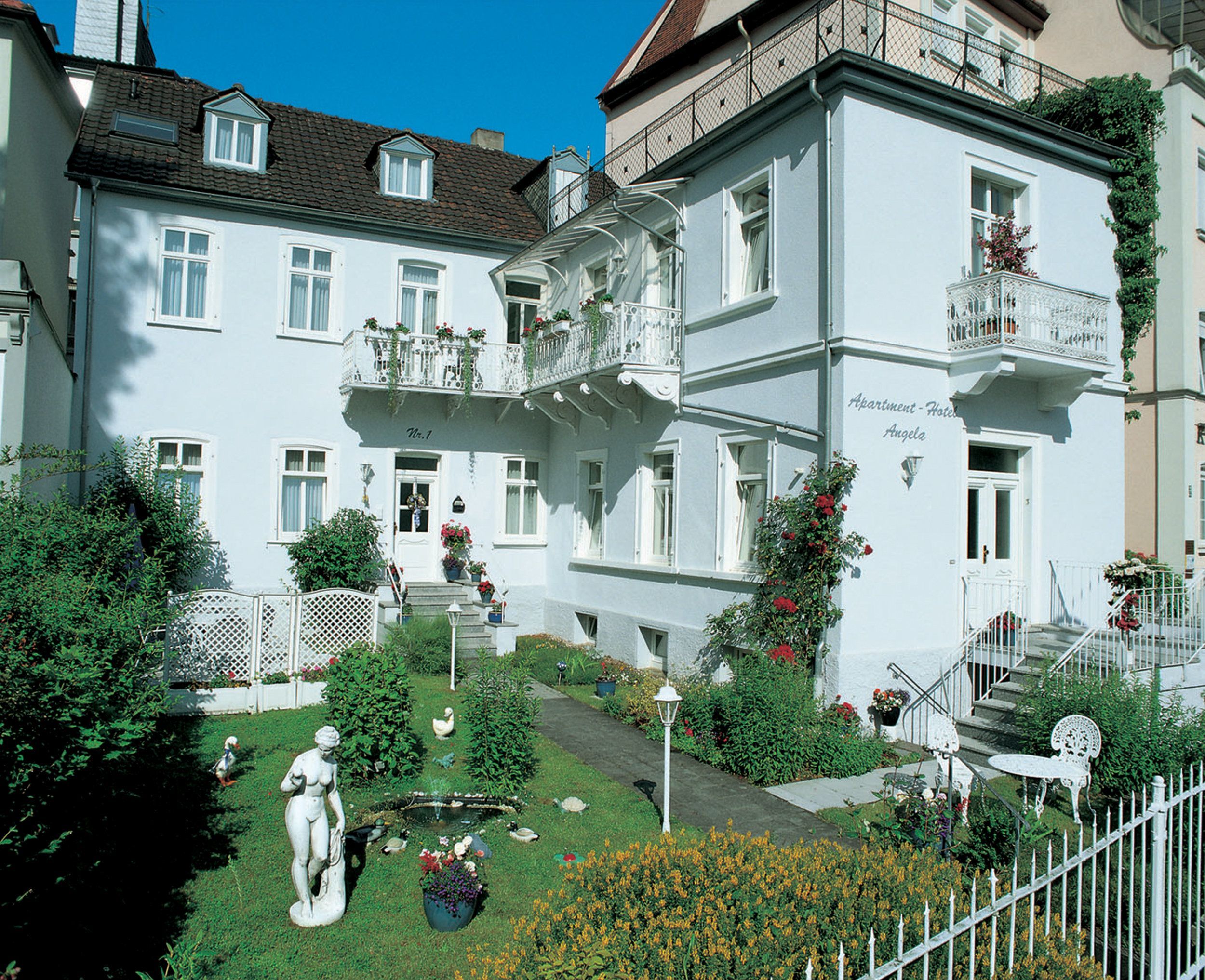 Das Apartmenthotel New Angela mit seiner Jugendstilfassade lädt ein zu angenehmen Ferien im Herzen eines Kurorts. Hier genießen Gäste modernsten Komfort in Zimmern mit getrenntem Wohn- und Schlafbereich sowie verschiedene Vital- und Wellnessangebote. Die hauseigenen kostenfreien Parkplätze sind 20 Meter vom Haus entfernt.