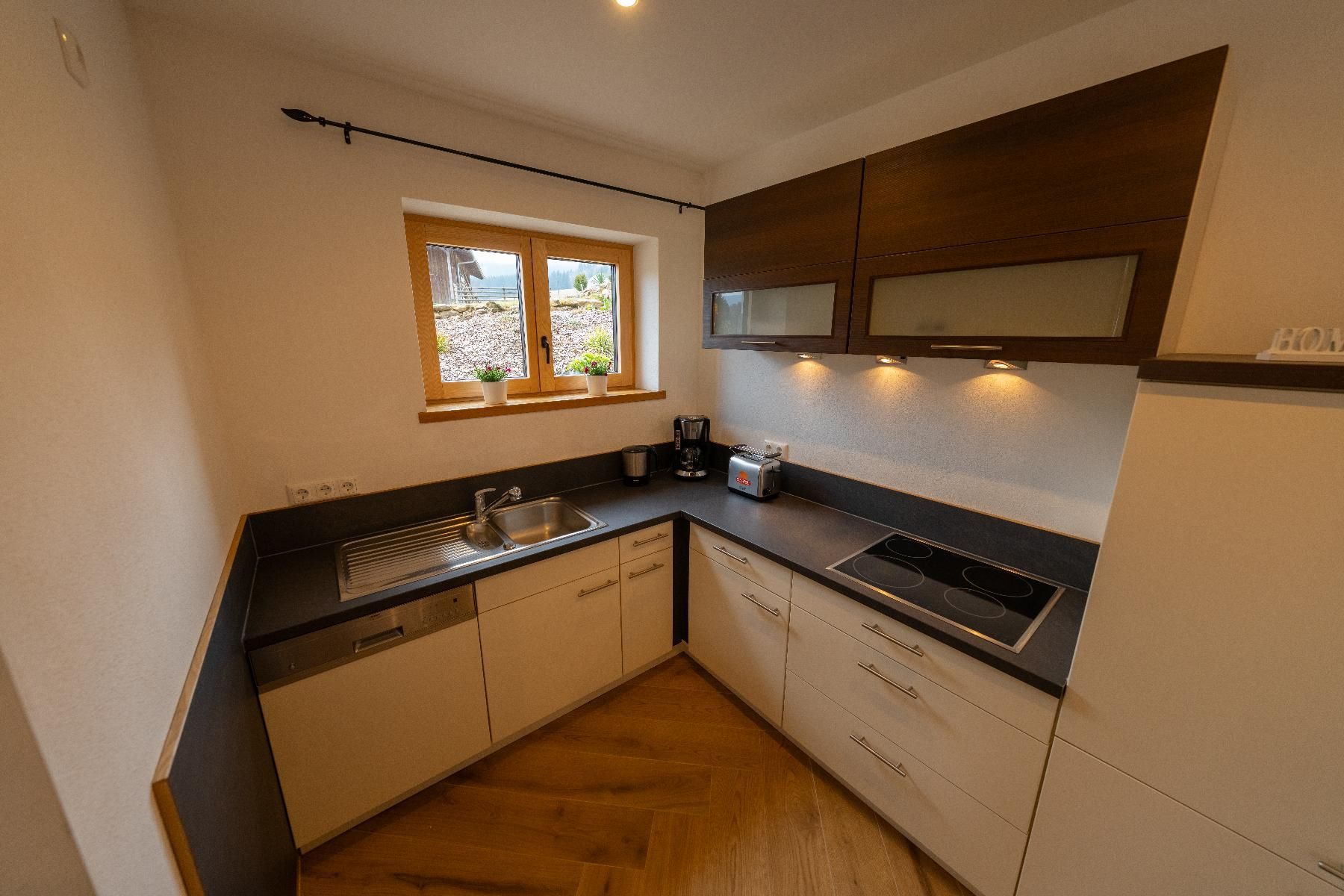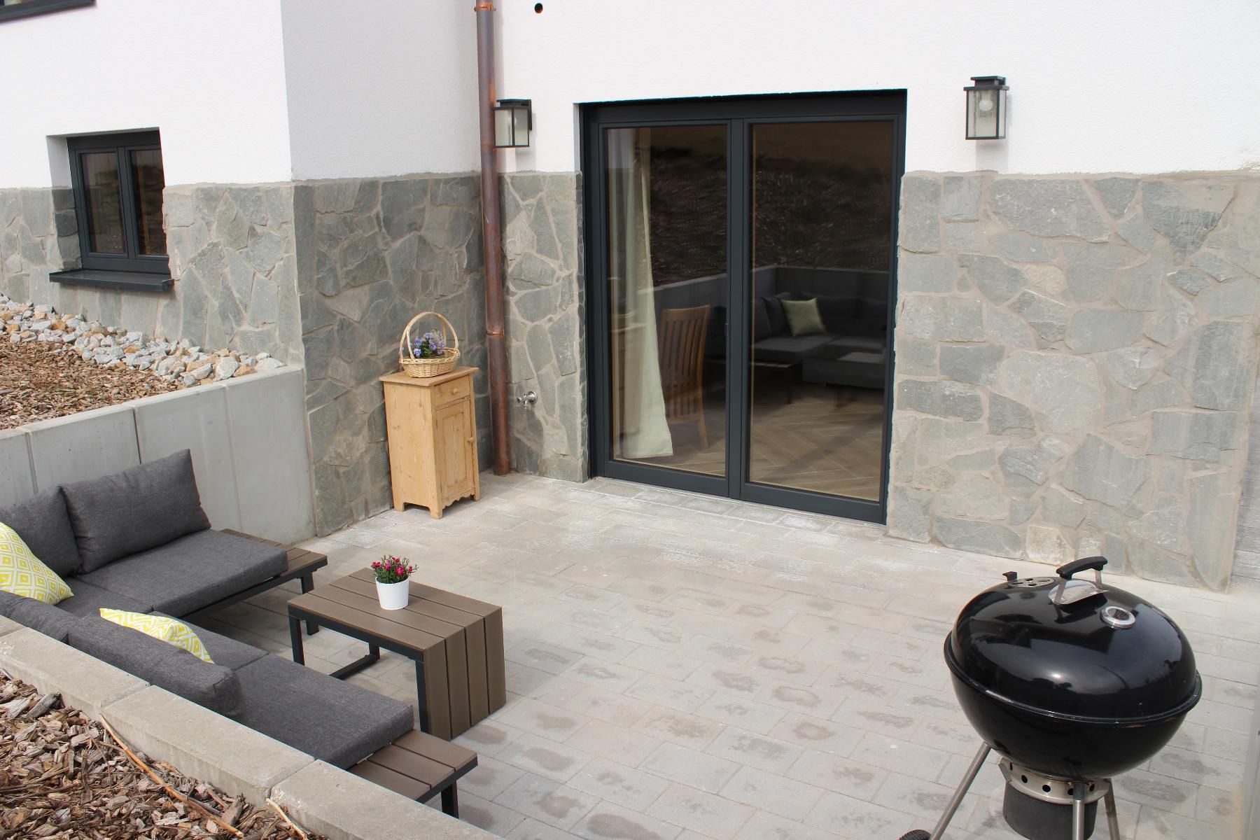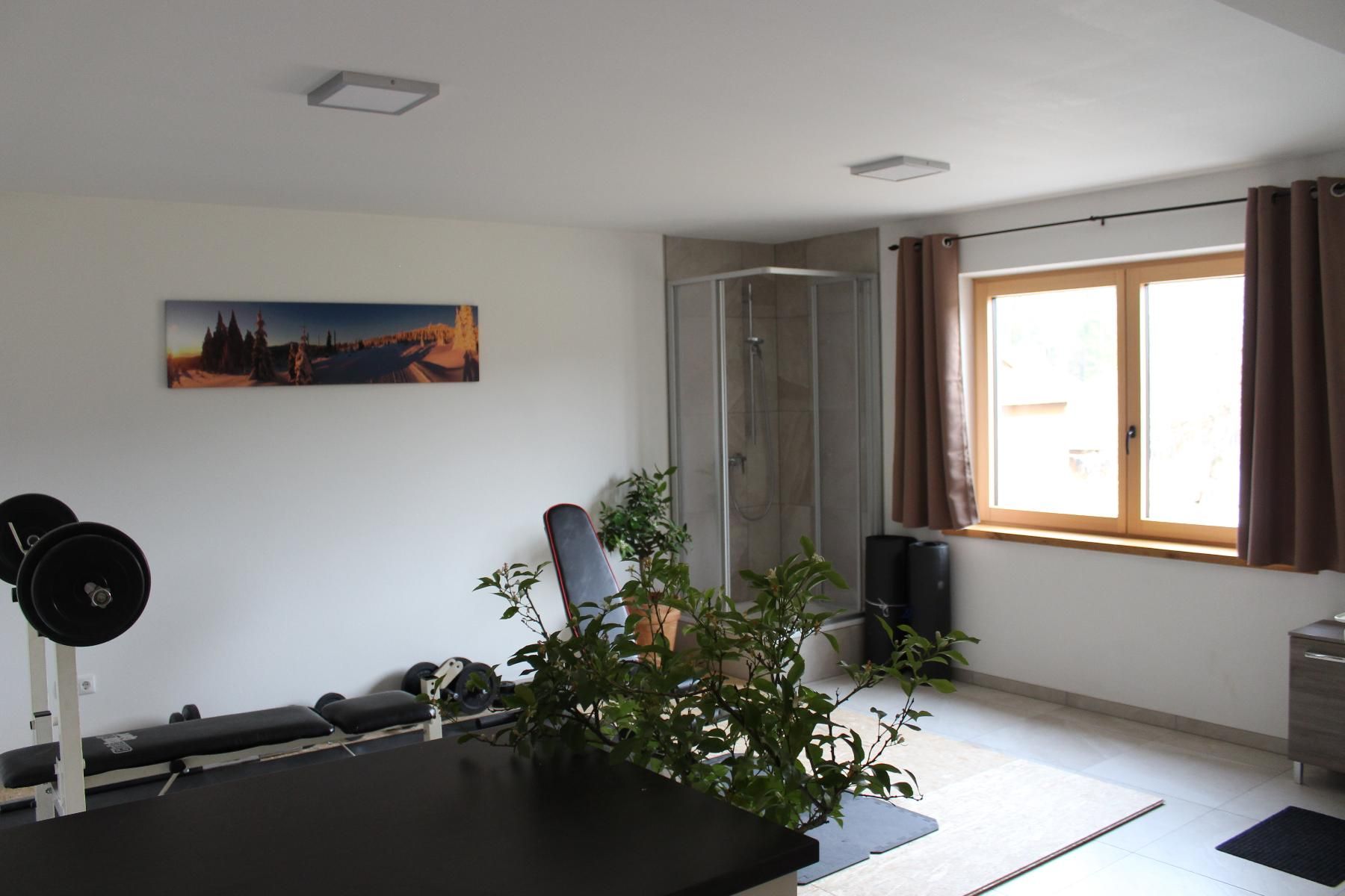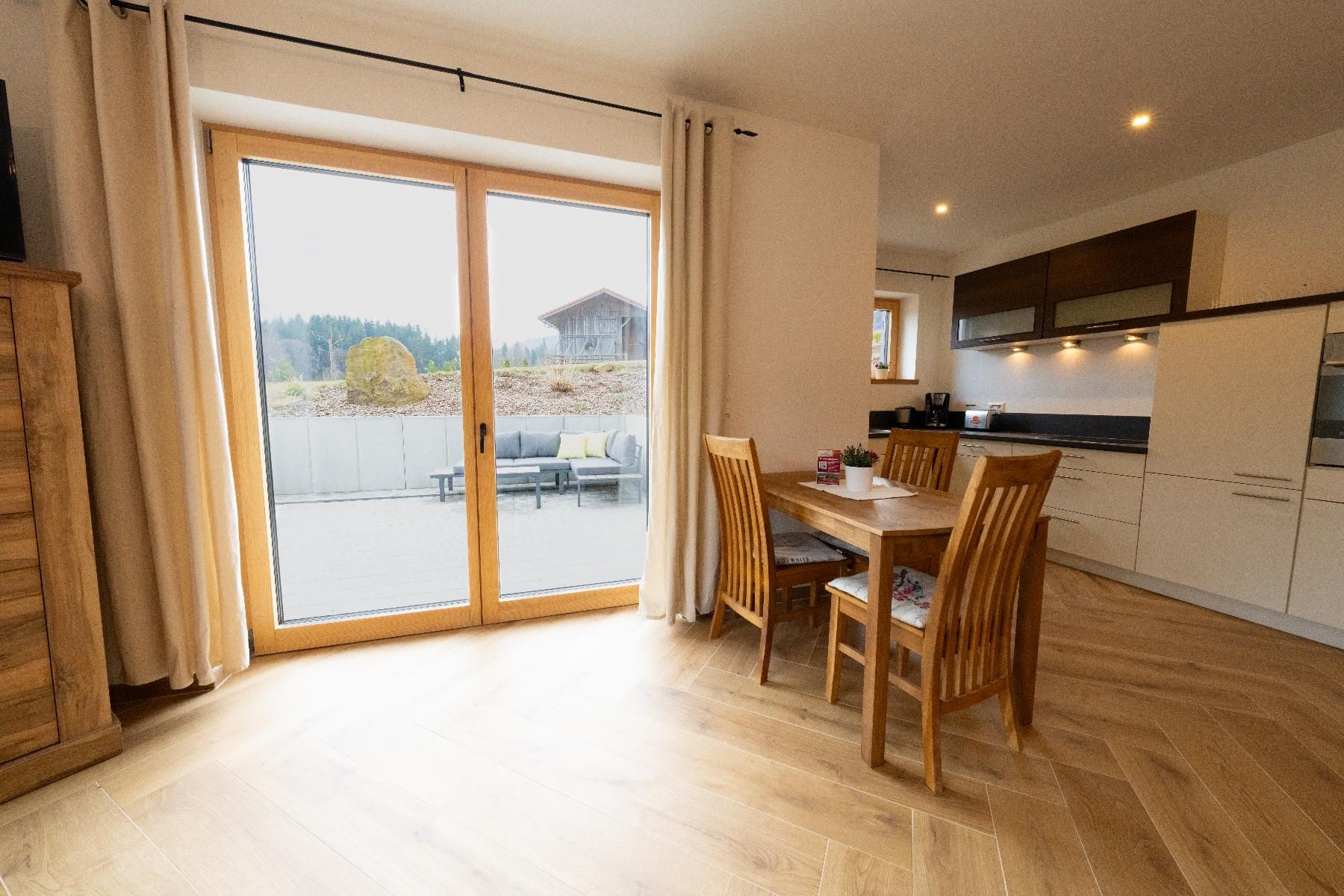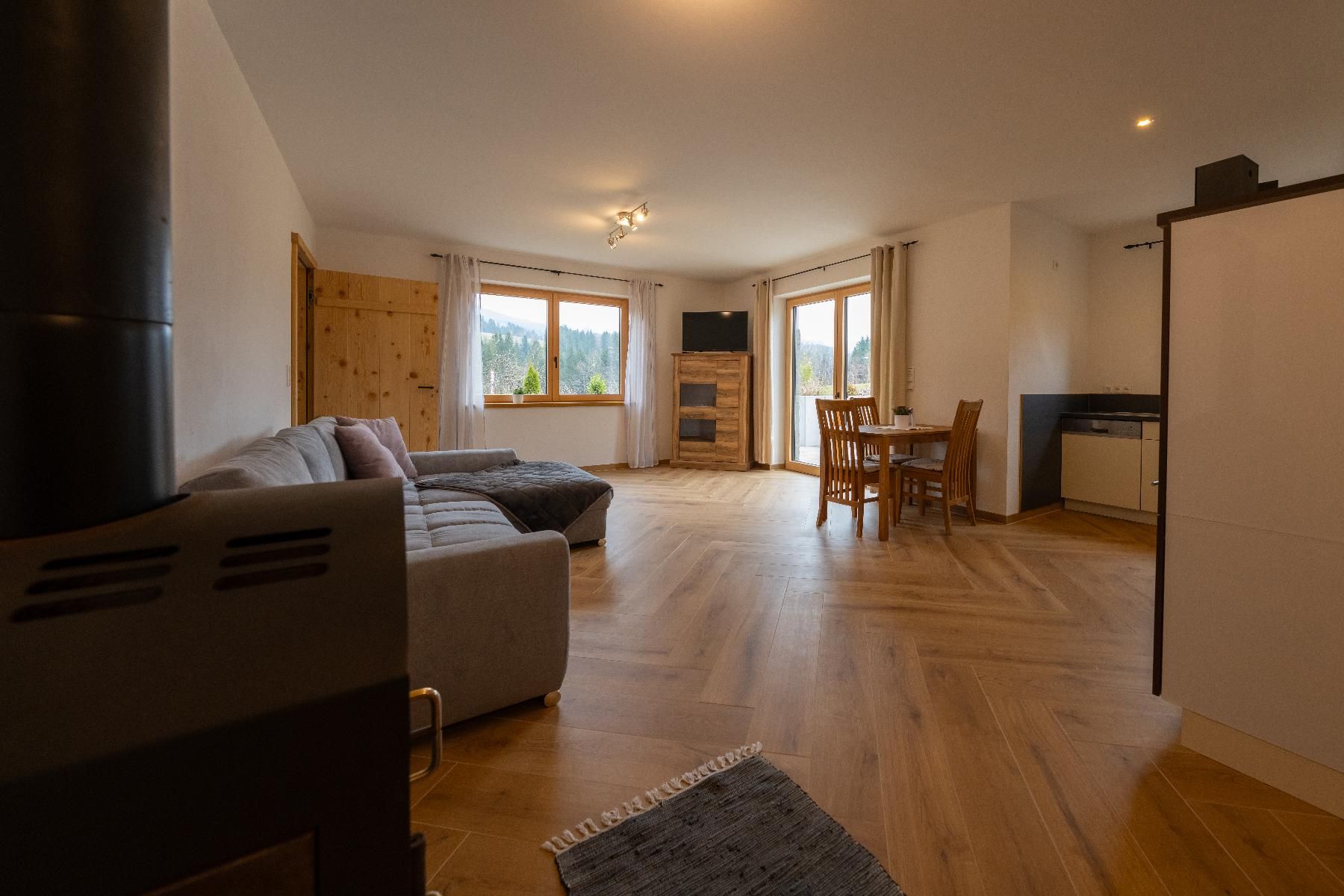 Die Ferienwohnung liegt im Erdgeschoss und bietet auf 65 Quadratmetern Platz für bis zu 3 Personen. Sie verfügt über einen offenen Wohn- und Essbereich, ein Badezimmer sowie ein separates Schlafzimmer. Im großzügigen Wohnraum befindet sich ein Kaminofen und eine Couch, die als Schlafcouch genutzt werden kann, ein Sat-TV sowie ein Essbereich. Die anschließende, offene Küche ist mit Spülmaschine, Kühl- und Gefrierschrank, Backofen, Herd, Toaster, Kaffeemaschine und Wasserkocher voll ausgestattet. Das Tageslichtbad verfügt über eine ebenerdige Regendusche, Waschbecken, WC und Handtuchtrockner. Das separate Schlafzimmer umfasst ein gemütliches Bockspringbett. Zur Ferienwohnung gehört eine eigene Terrasse, auf der Sie entspannen und den Ausblick genießen können, sowie ein PKW-Stellplatz. Außerdem kann ein Fitnessraum mit separater Dusche genutzt werden. Bettwäsche und Handtücher sowie WLAN stehen kostenfrei zur Verfügung.