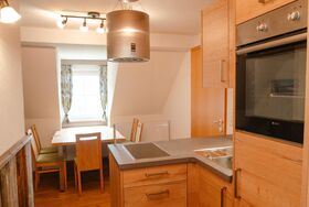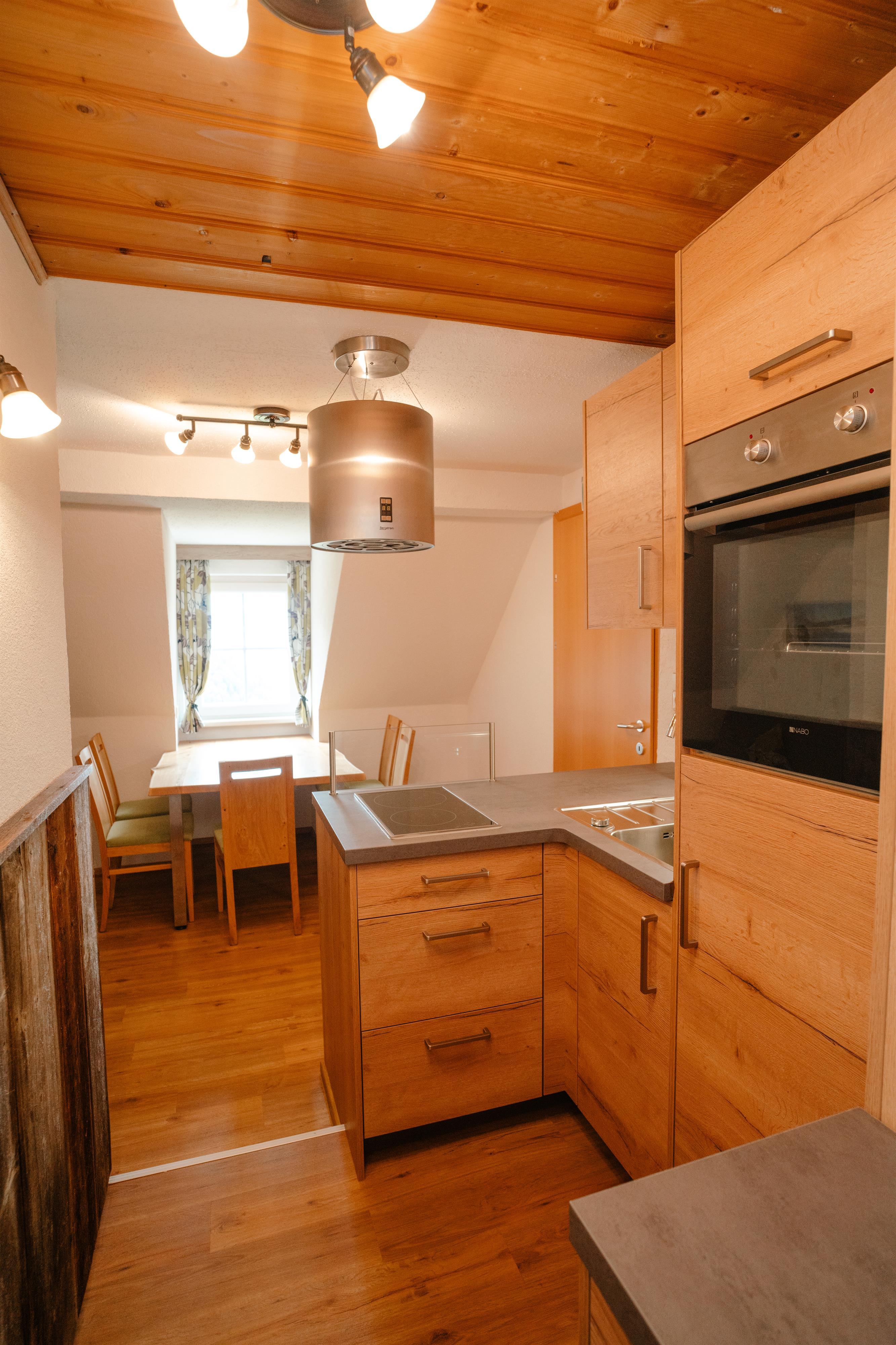 Die Küche ist ausgestattet mit Induktionsfeld, Backrohr, Kühl/Tiefkühlschrank, Filterkaffeemaschine, Microwelle und Geschirr.