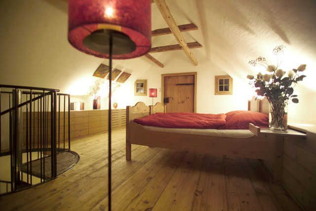 Über die handgefertigte Wendeltreppe gelangen Sie in den stilvoll eingerichteten Schlafraum, wo Sie in Großmutters Betten die Ruhe der Vergangenheit spüren können.