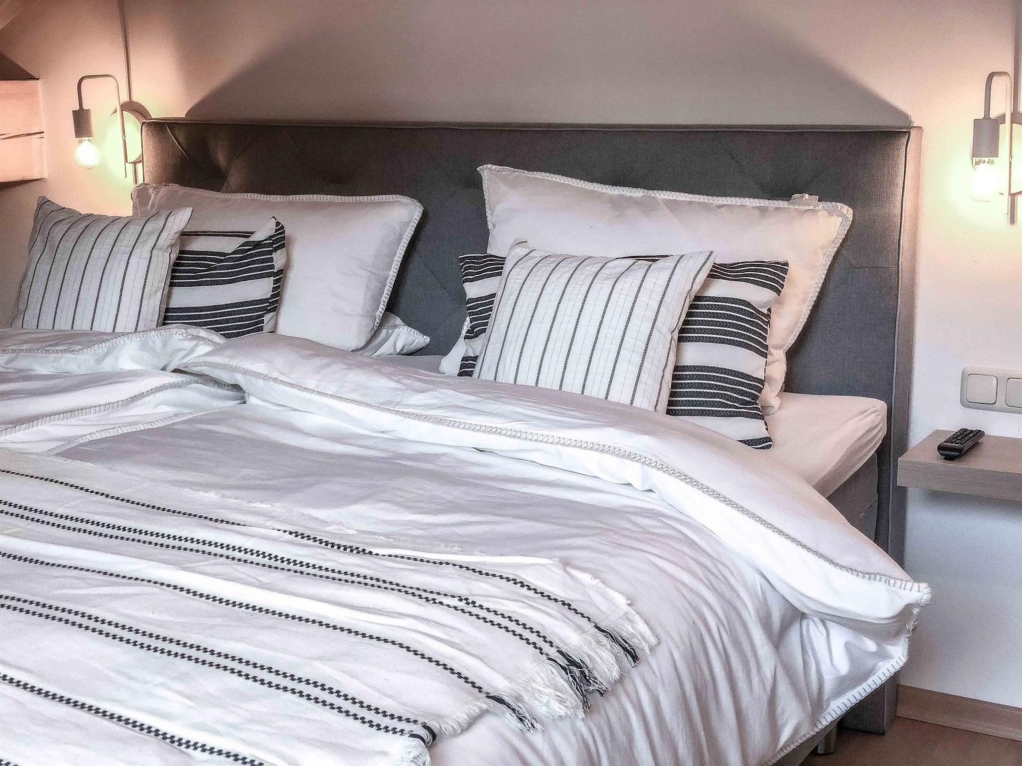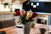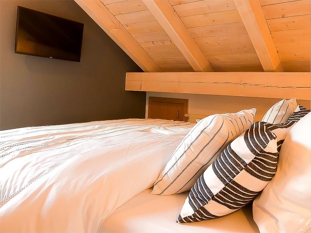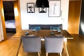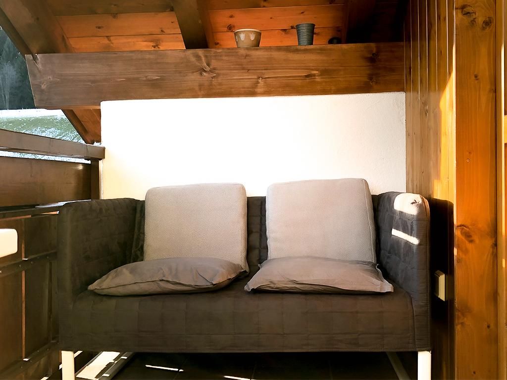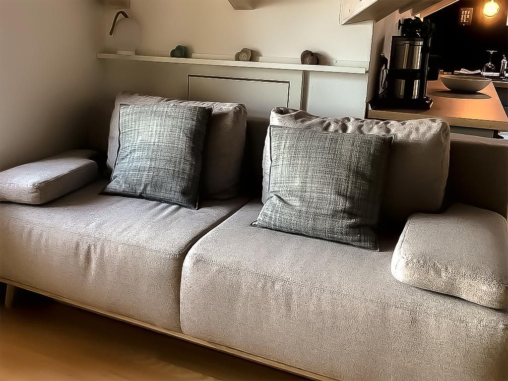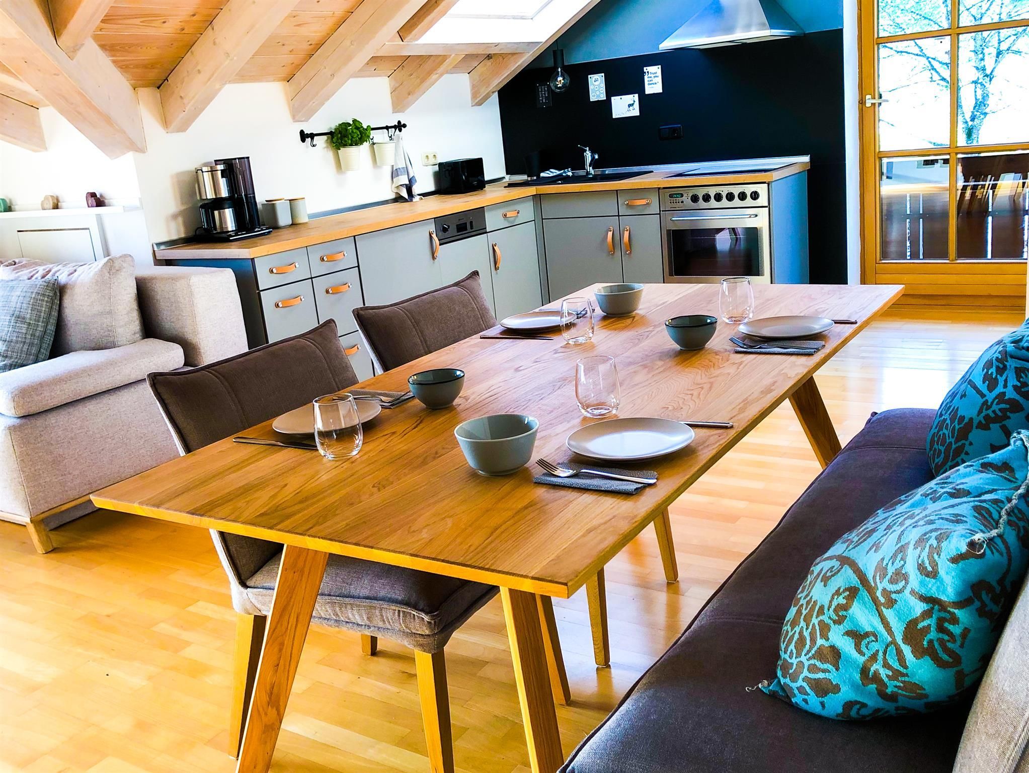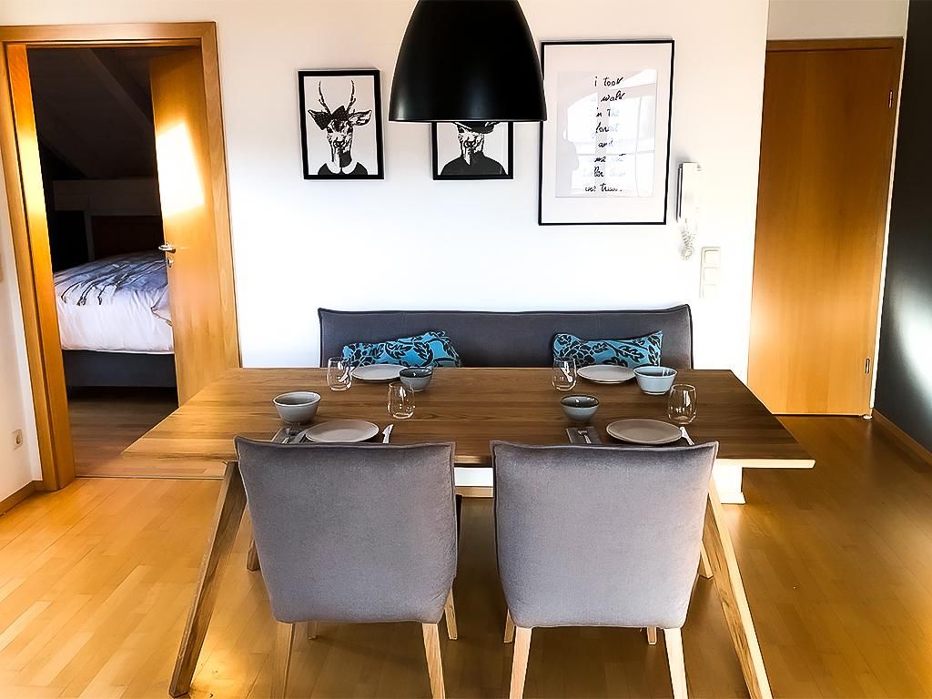 Die geschmackvolle Dachgeschosswohnung (45qm) mit eigenem Zugang liegt im zweiten Stock und vermittelt durch einen sichtbaren Dachstuhl und zwei Balkone Gemütlichkeit und Weite zugleich.