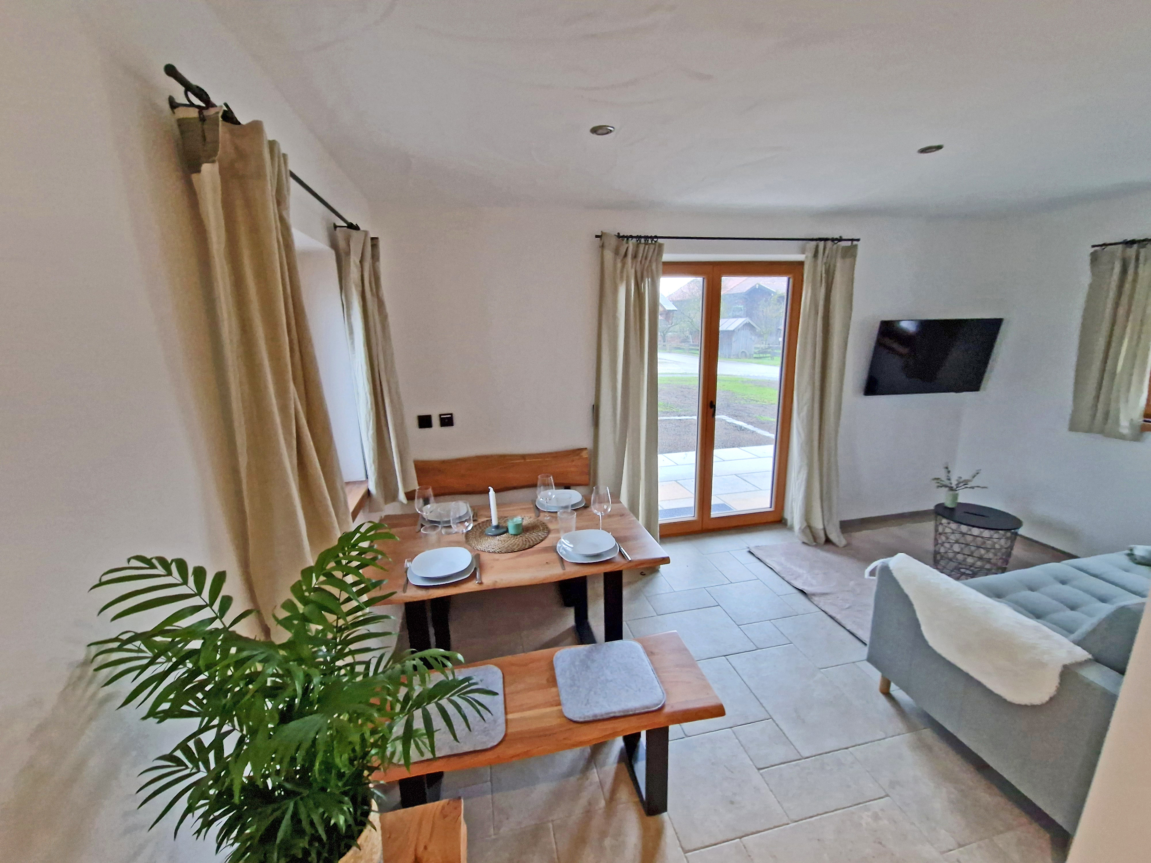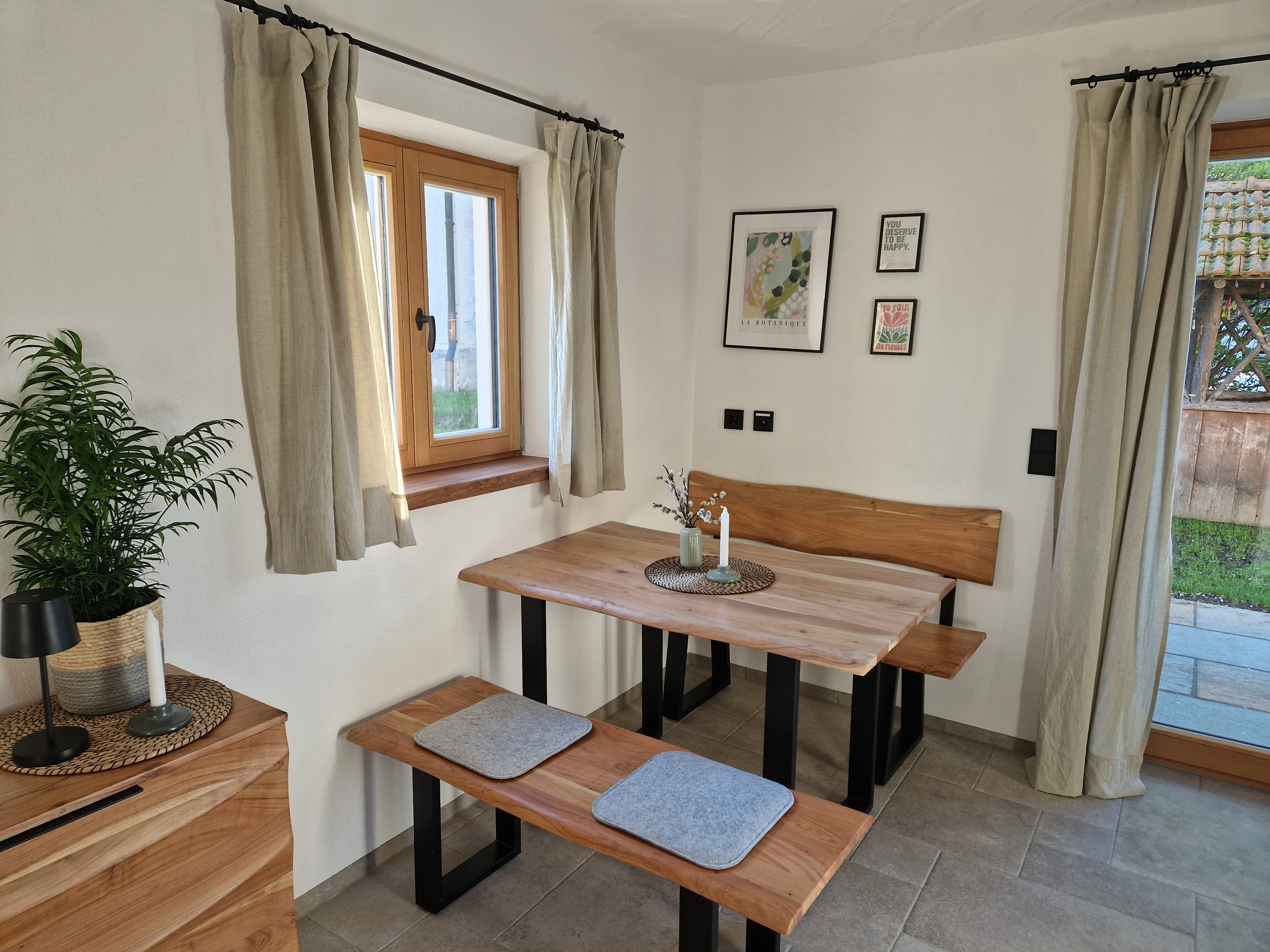 Unser gemütliches Chalet erstreckt sich über zwei Etagen und bietet Platz bis zu vier Personen – ideal für Familien, Paare oder Freunde. Im Erdgeschoss erwartet Sie eine offene, moderne Küche mit Geschirrspüler, Kühlschrank und Backofen, eine einladende Essecke sowie ein gemütlicher Wohnbereich. Von hier aus gelangen Sie direkt auf die Terrasse mit einem eigenen kleinen Garten, wo Sie einen traumhaften Blick auf Höhenberg, die charmante Kirche und die umliegenden Berge genießen können.