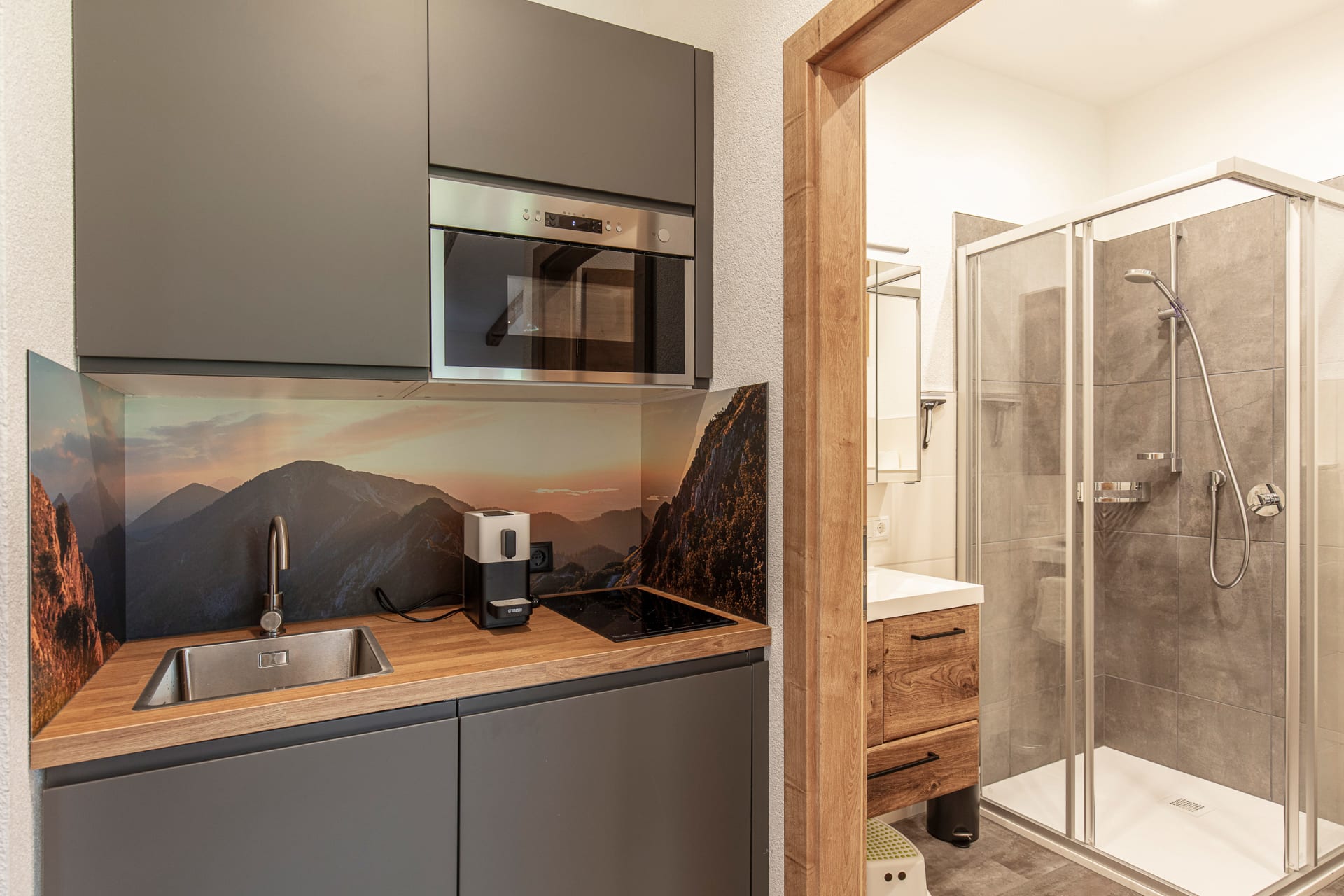Sehr gemütliche Wohnung mit einem Schlafzimmer, einem Badezimmer mit Dusche/WC einer Einbauküche, Kabel-TV/SAT-Anschluss und eigenem Balkon. Die Küche ist ausgestattet mit einem Zweiblattenherd, Geschirrausstattung, Geschirrspülmaschine, Kaffeemaschine, Kühlschrank, Microwelle.