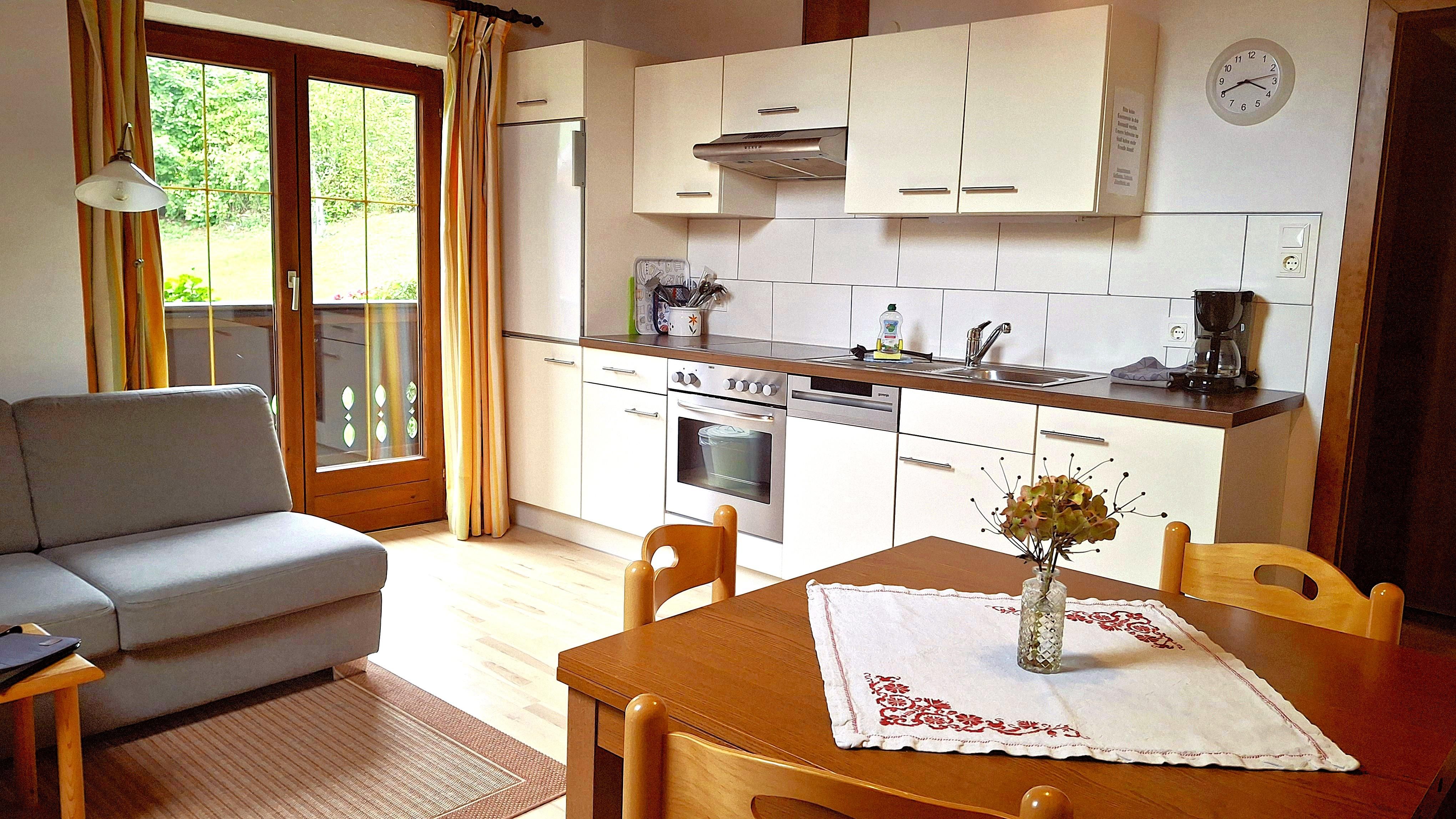 Die 42m² gemütliche Ferienwohnung Alpenblick befindet sich in unserem Bauernhaus und bietet Platz für 4 Personen. Sie hat eine geräumige Wohnküche mit Couch, Esstisch und Küchenzeile, 2 Schlafzimmer und ein Badezimmer. Auf dem wohnungseigenem Balkon lassen sich gemütliche Stunden verbringen mit Blick auf die Millstätter Alm.