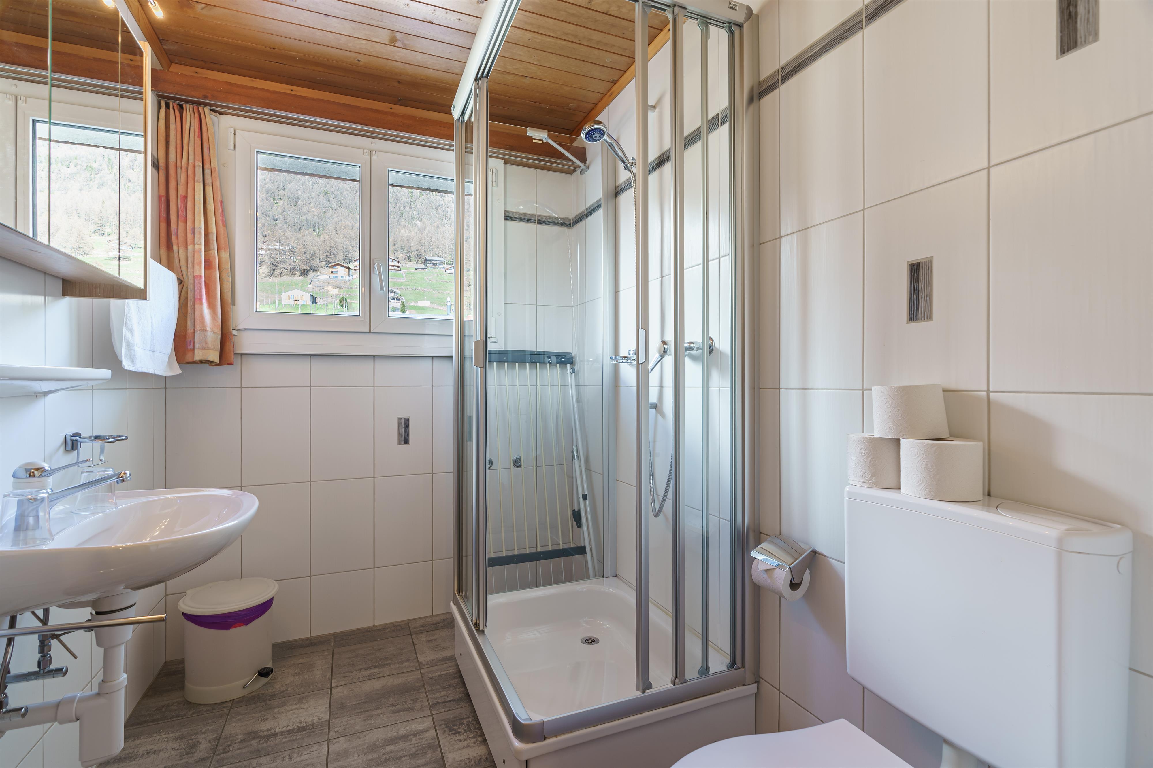• Badezimmer: Ein modernes Badezimmer mit Dusche und WC.