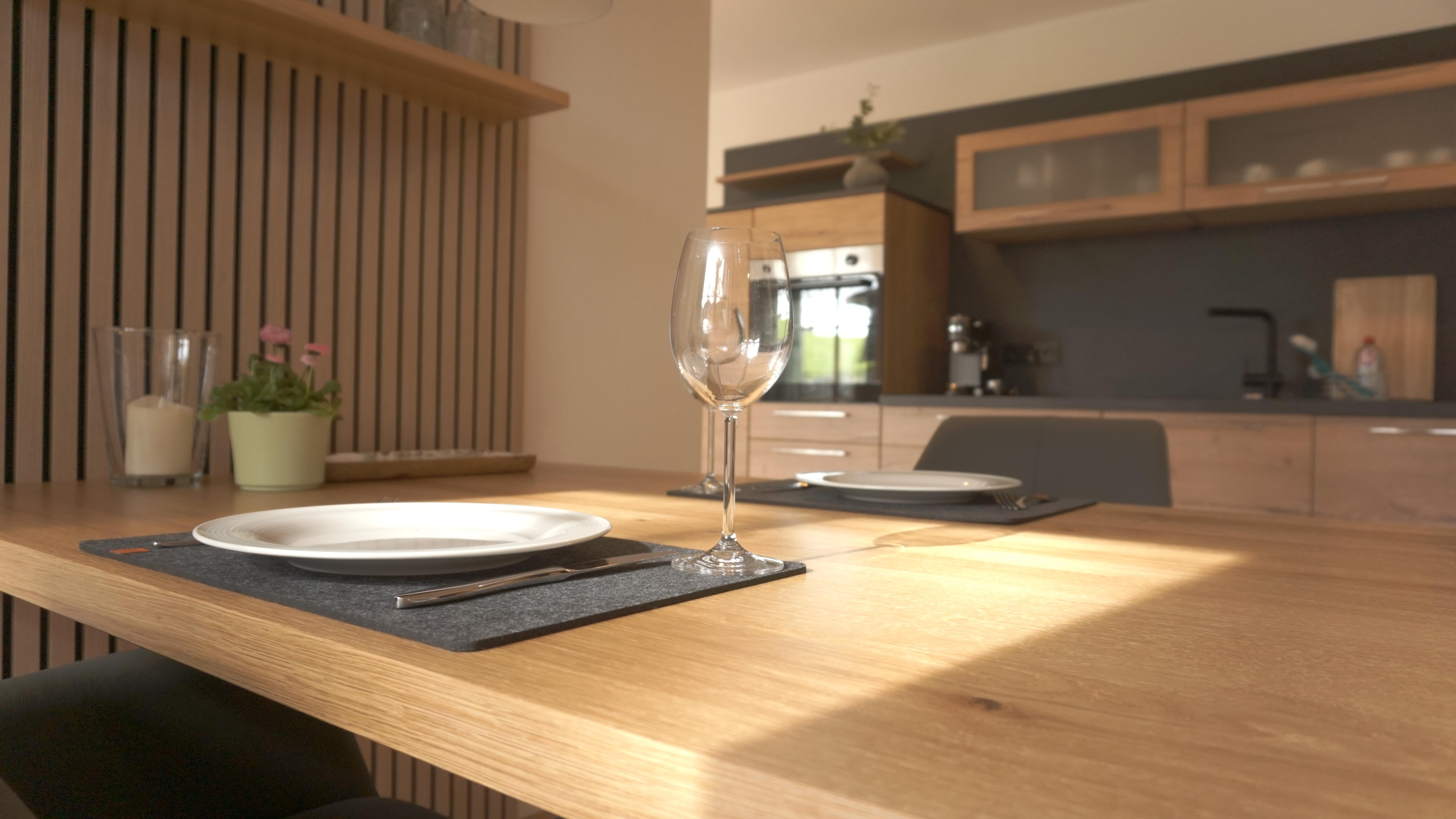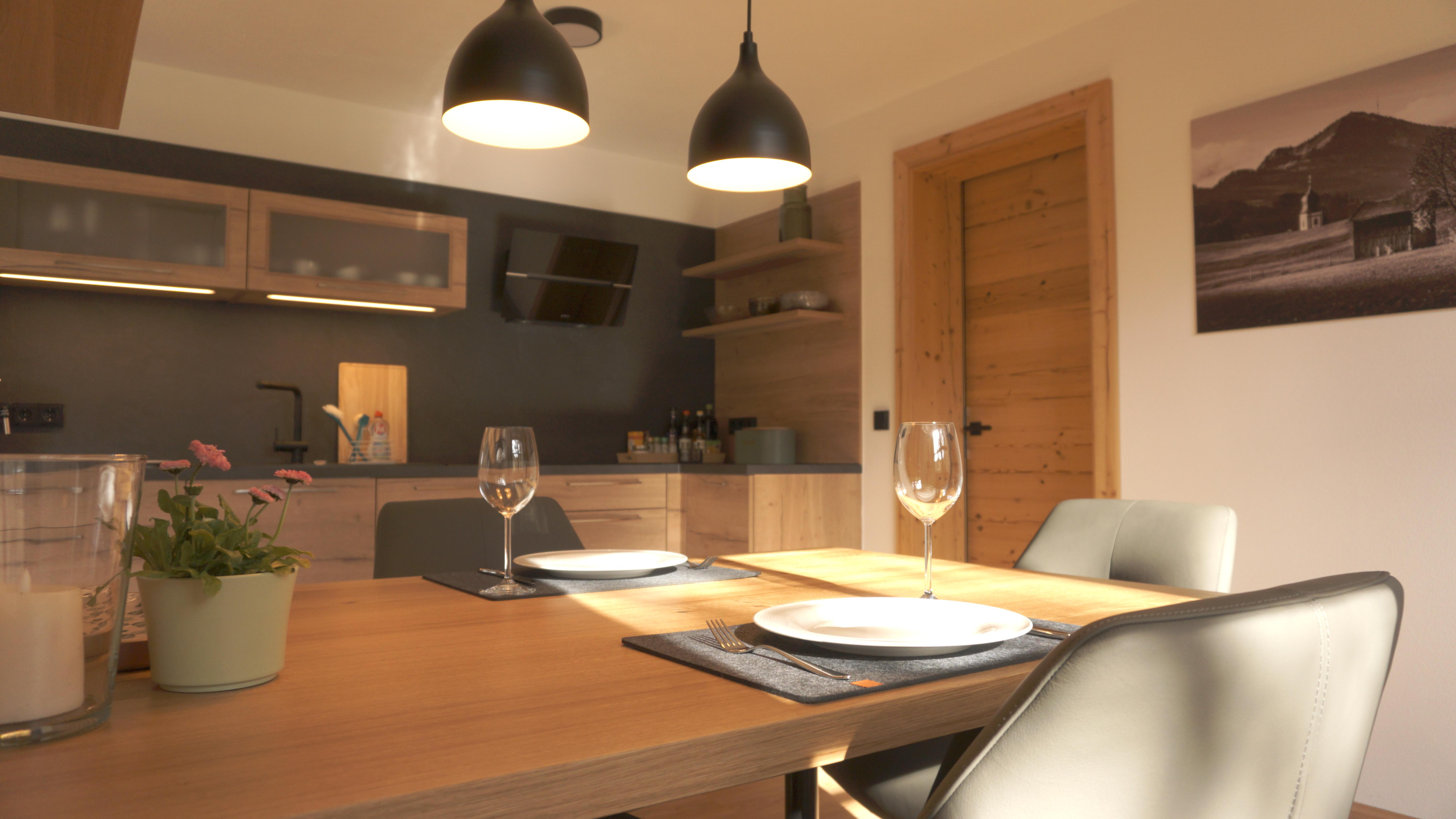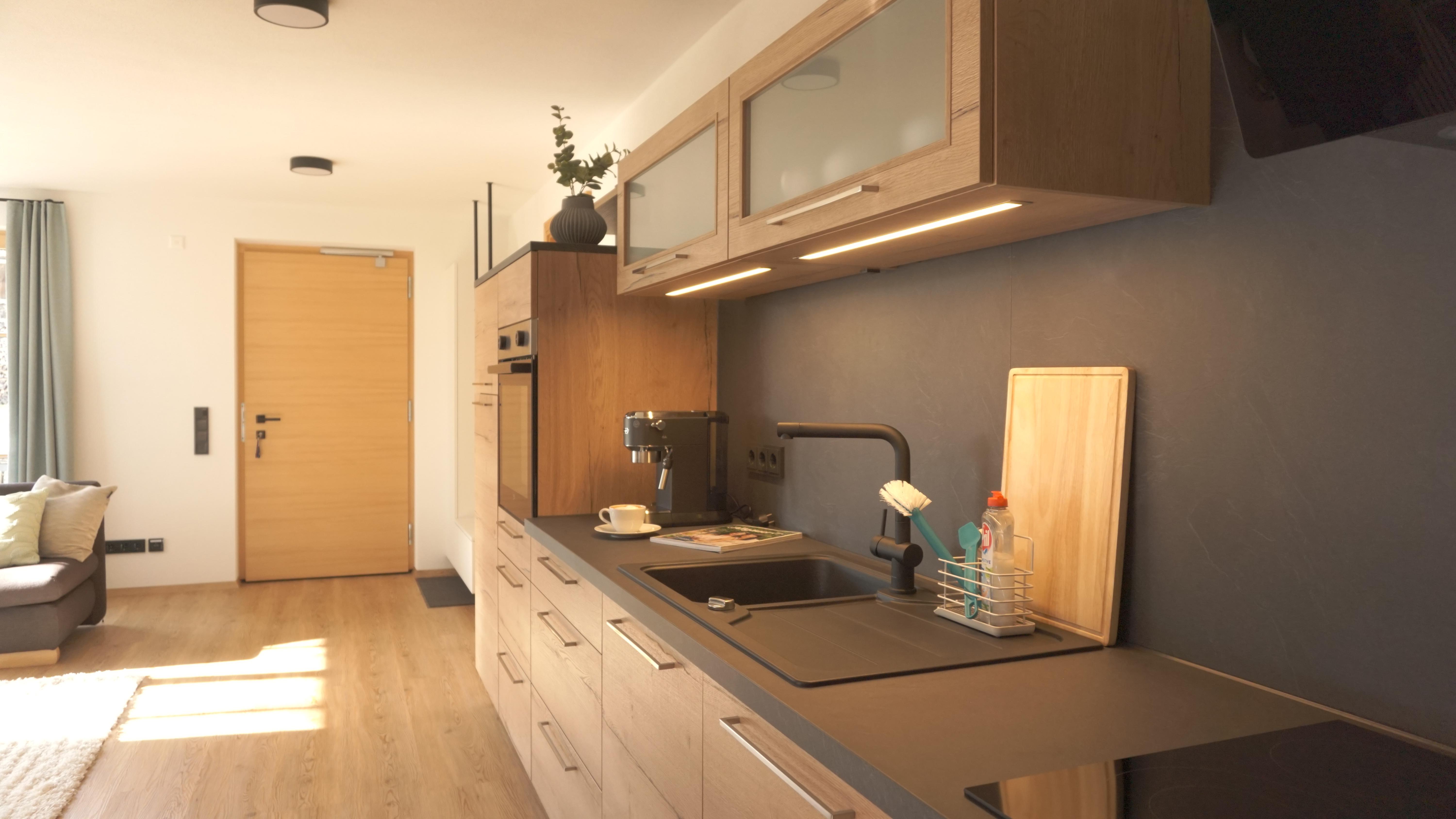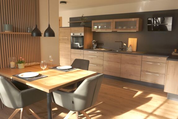 In unserer neuen, 65 qm großen Ferienwohnung erwartet Sie eine moderne, voll ausgestattete Wohnküche mit Geschirrspüler, Backofen und Kühlschrank mit Gefrierfach, Espressomaschine und allem dazugehörigen Zubehör.