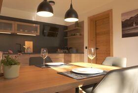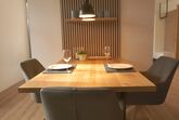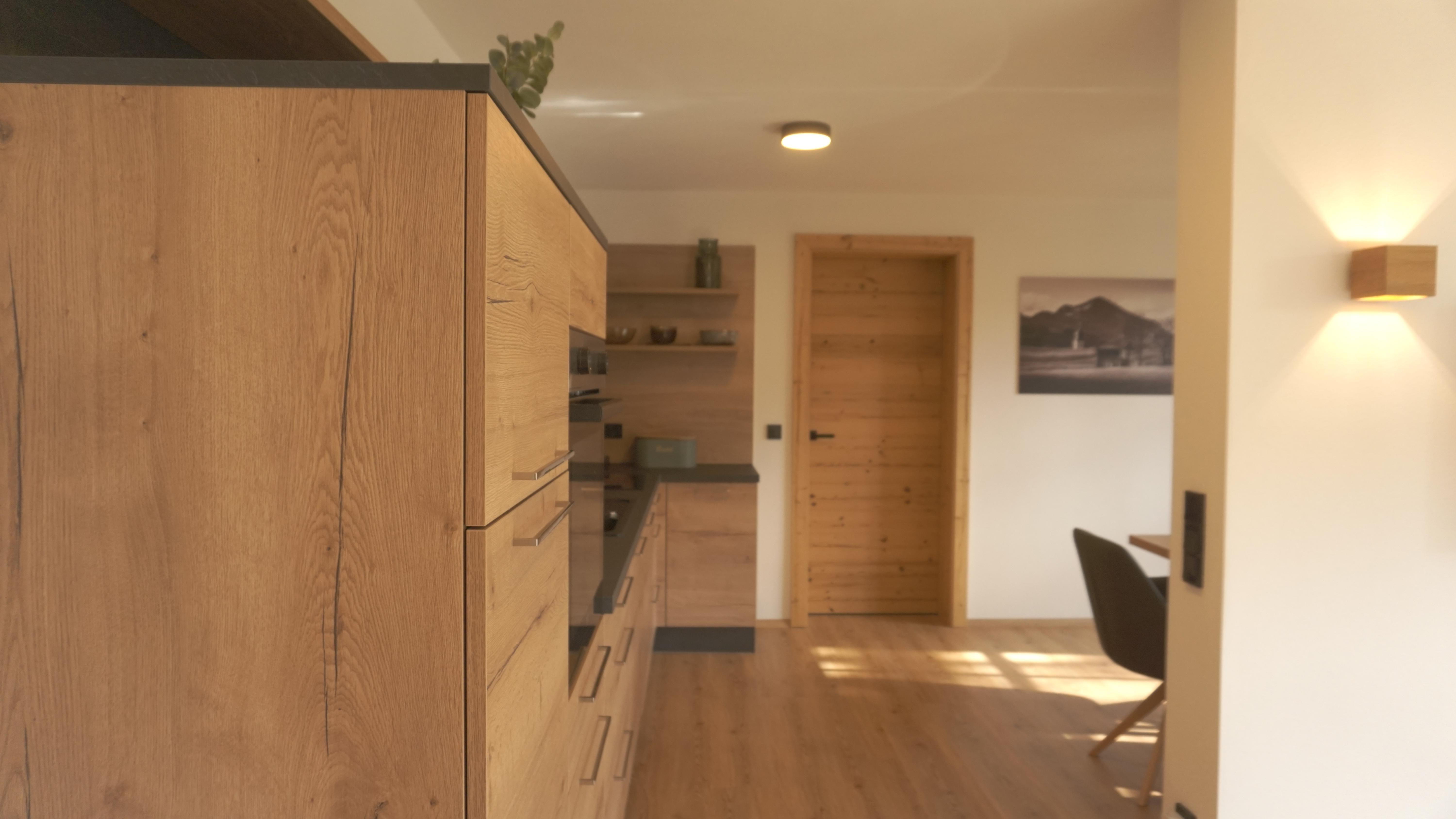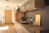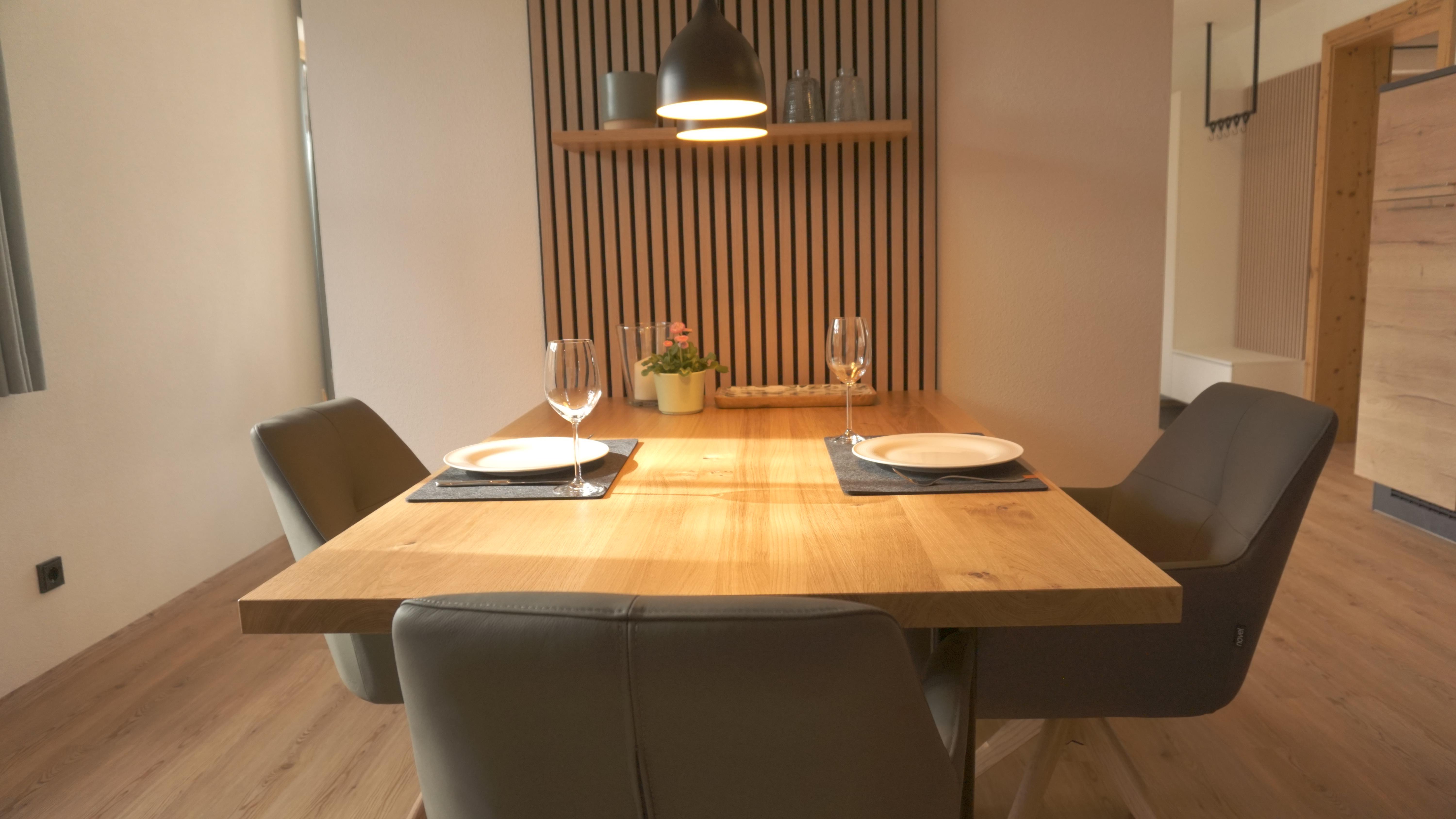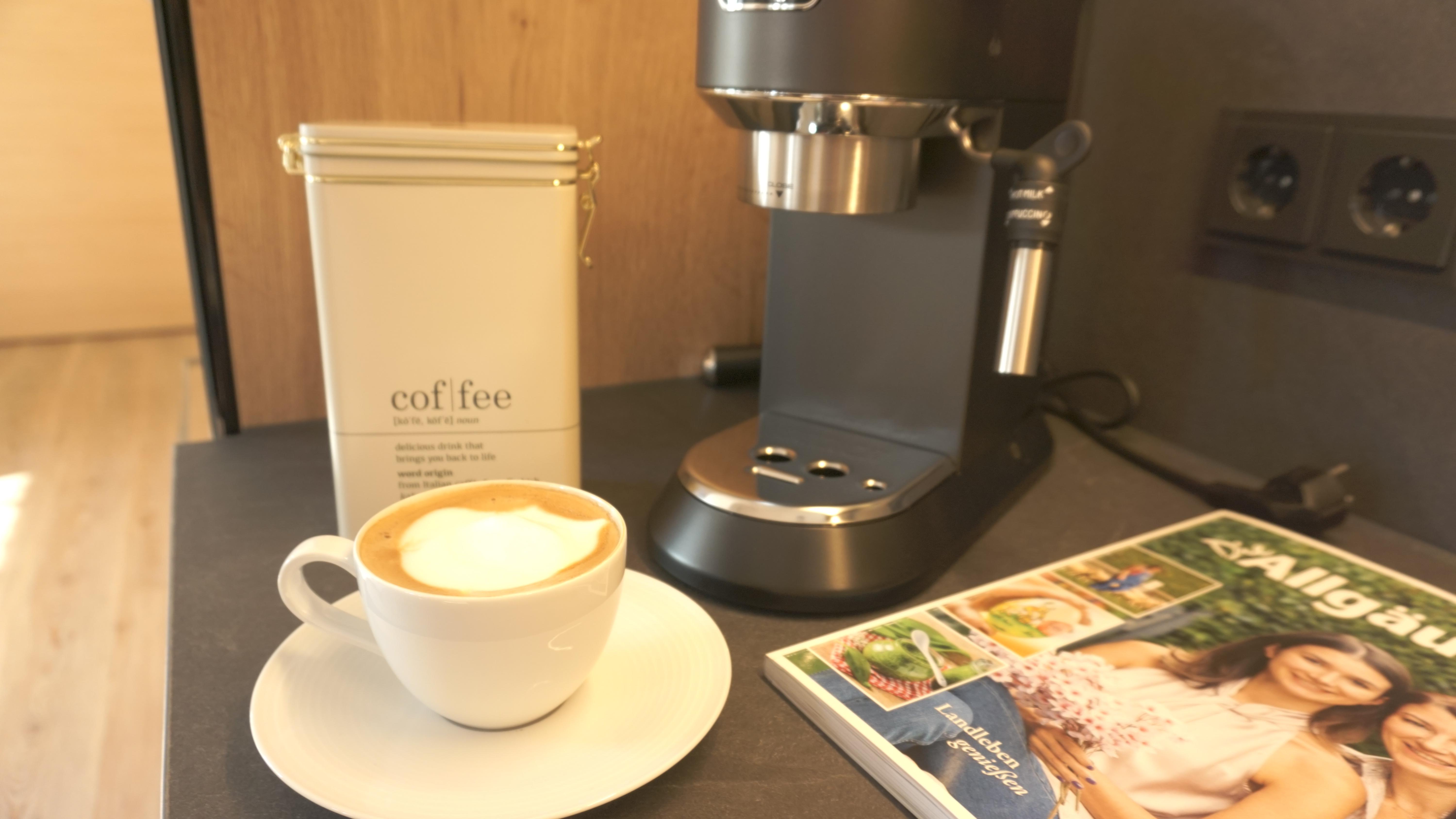 In unserer neuen, 65 qm großen Ferienwohnung erwartet Sie eine moderne, voll ausgestattete Wohnküche mit Geschirrspüler, Backofen und Kühlschrank mit Gefrierfach, Espressomaschine und allem dazugehörigen Zubehör.