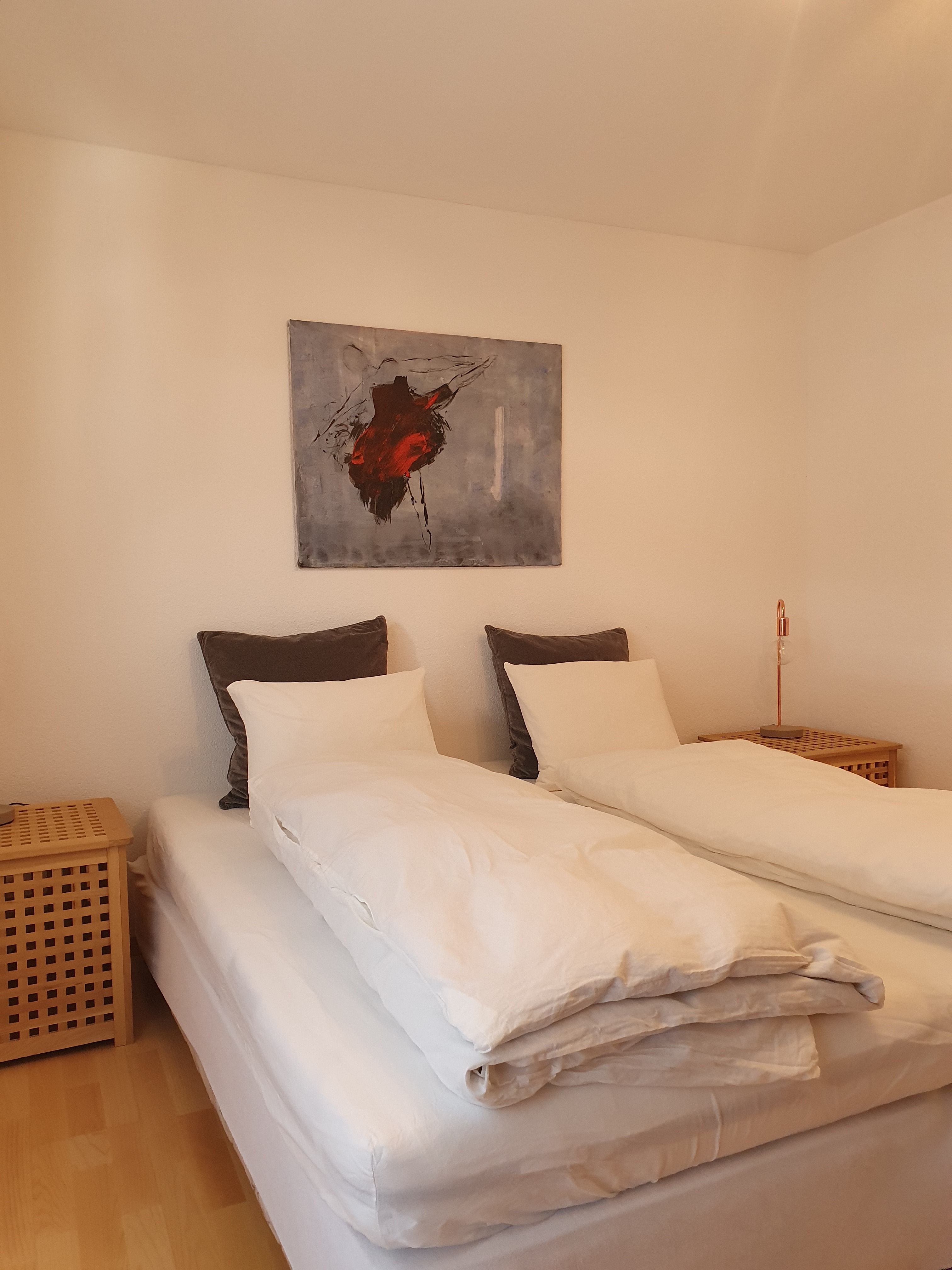 4-Zimmerwohnung in einem Mehrfamilienhaus, im autofreien Dorfteil. Die Wohnung liegt im 2. Stock (Lift) & verfügt über 1 Schlafzimmer mit Doppelbett, 1 Schlafzimmer mit Hochbett & 1 Schlafzimmer mit Einzelbett (offenes Zimmer ohne Türe). Offene Küche, Essecke, Wohnraum, TV, 2 Badezimmer (Bad/Dusche/WC) & Süd-Balkon.