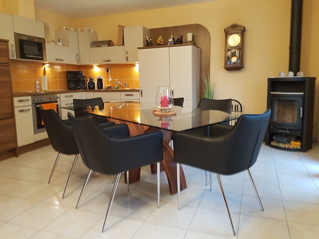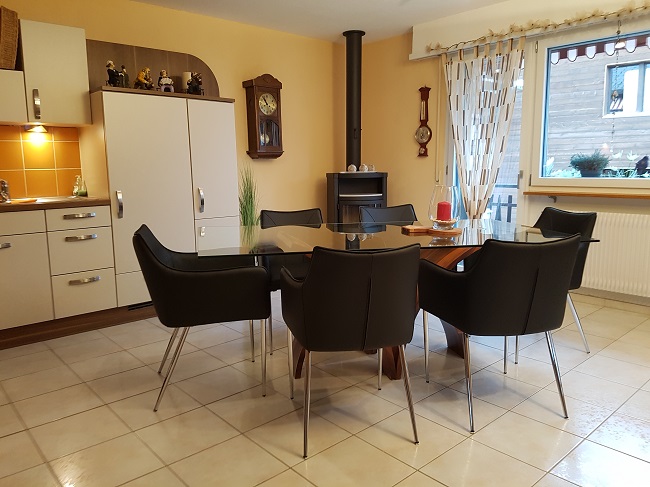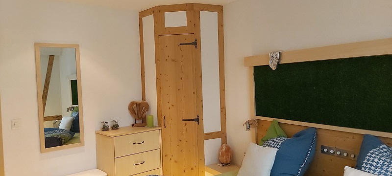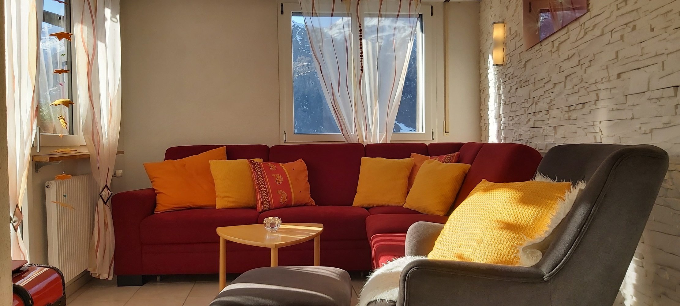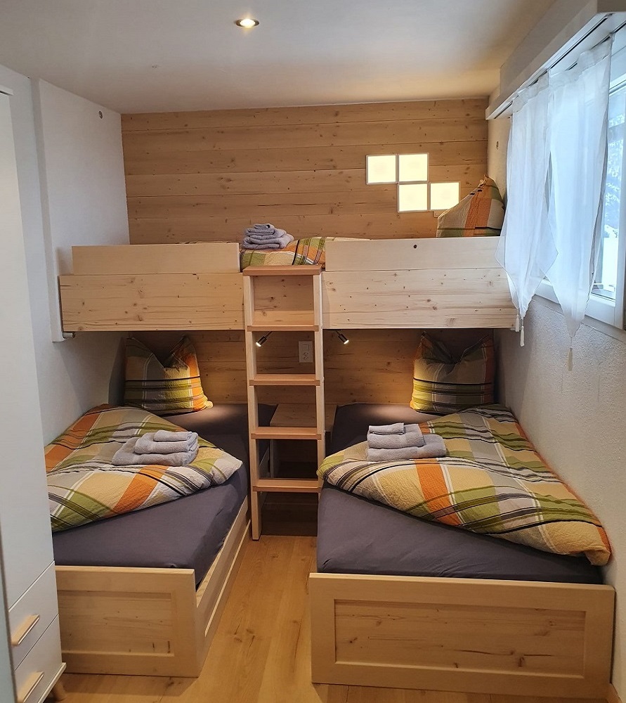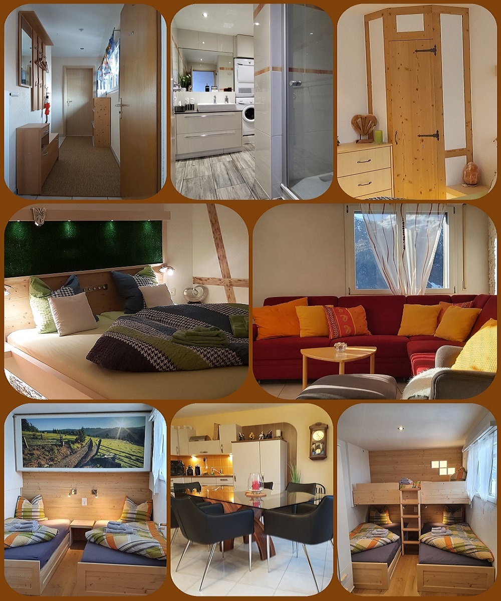 Die moderne sehr schöne 4* superior 3-Zimmerwohnung mit 5 Betten im 3. Stock umfasst 1 Wohn-/Esszimmer mit SAT-TV & SAT-Radio sowie DVD/CD-Player, Free Wi-Fi, 1 Doppelschlafzimmer (mit elektrischen Fensterstoren), 1 Dreibettzimmer (1 Hochbett quer und 2 Einzelbetten ebenfalls mit elektrischer Fensterstore), Hochstuhl, WC-Aufsatz, Wickelkissen, Kindergeschirr und Kindersicherung für Bett, einige Brettspiele und Malsachen, moderne Küche mit hohem Komfort (Geschirrspüler, Mikrowelle, Kaffeefiltermaschine, eine vollautom. Kaffeemaschine, 1 Nespresso-Kapsel-Maschine, Toaster, Wasser-/Eierkocher, Raclette-, Fondue- & Fondue Chinoisegeschirr usw.), moderne Nasszelle mit Dusche/WC, grosser Südbalkon mit Sonnenstoren, eigene Waschmaschine mit Tumbler (inkl. Waschpulver). Zusätzlich verfügt diese Wohnung über einen Cheminéeofen (Holz wird unseren Gästen gratis zur Verfügung gestellt).