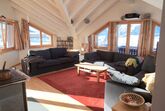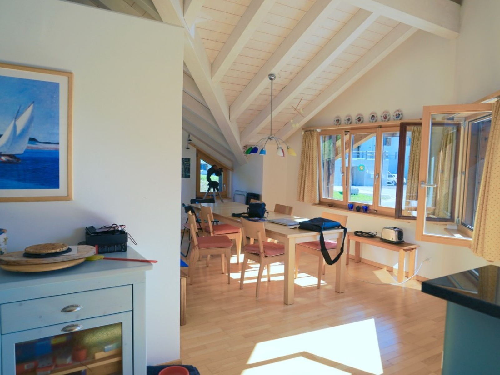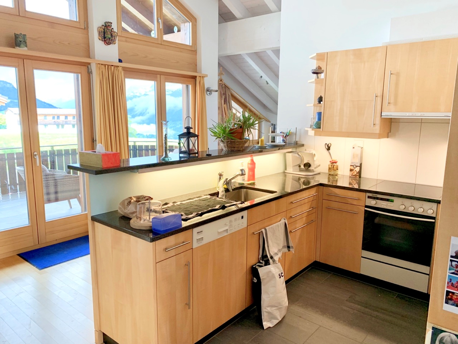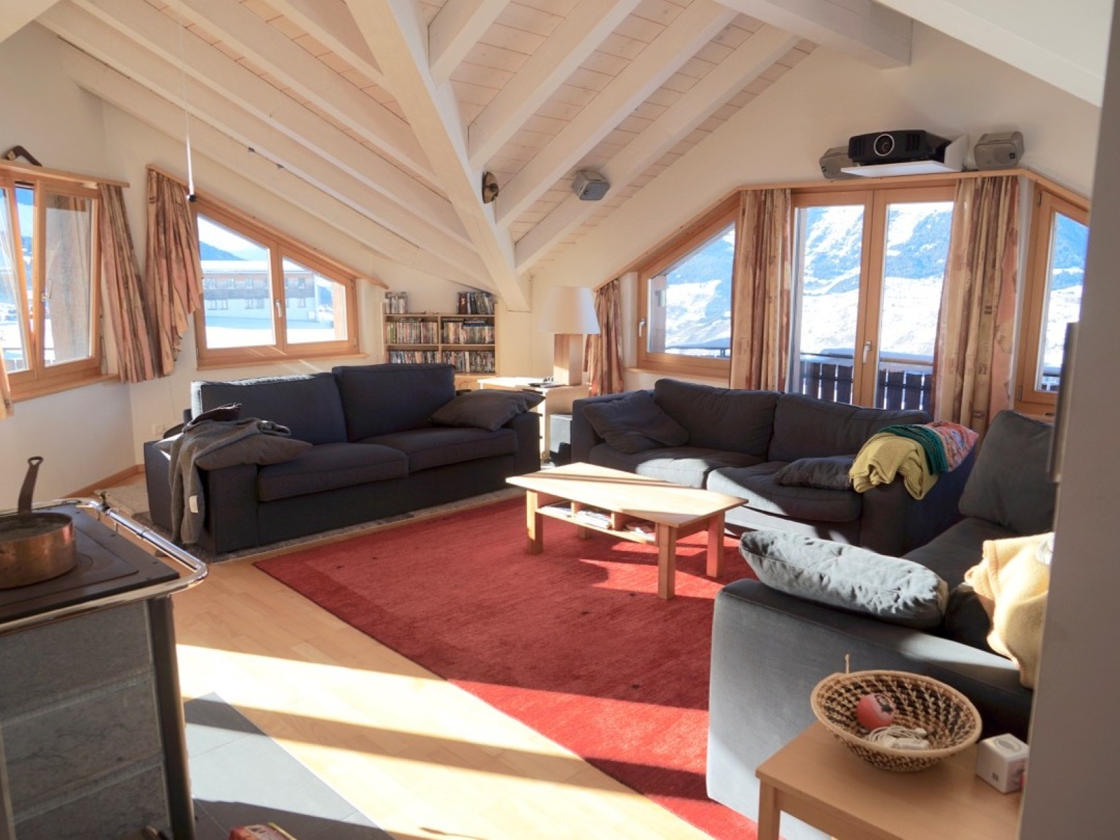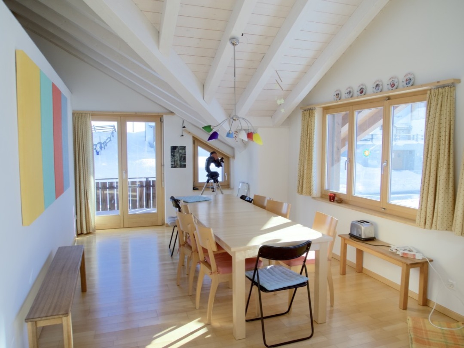Ein offener Wohnraum mit Küchen-/Essbereich mit viel Luftraum bis unter dem Dach. Im Wohnzimmer befinden sich 3 x 3-er Sofa, ein Schwedenofen (Holz wird bereitgestellt), ein Beamer mit Leinwand und ein Nordbalkon. Im Essbereich mit grossem Esstisch (bis 10 Personen) und Südbalkon. Zwischen Ess- und Wohnzimmer ist der Zugang zum grossen Westbalkon mit Lounge-Möbel. WLAN in der ganzen Wohnung (kostenlos), Beamer, Fernsehen, Stereoanlage.Küche: