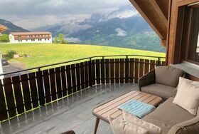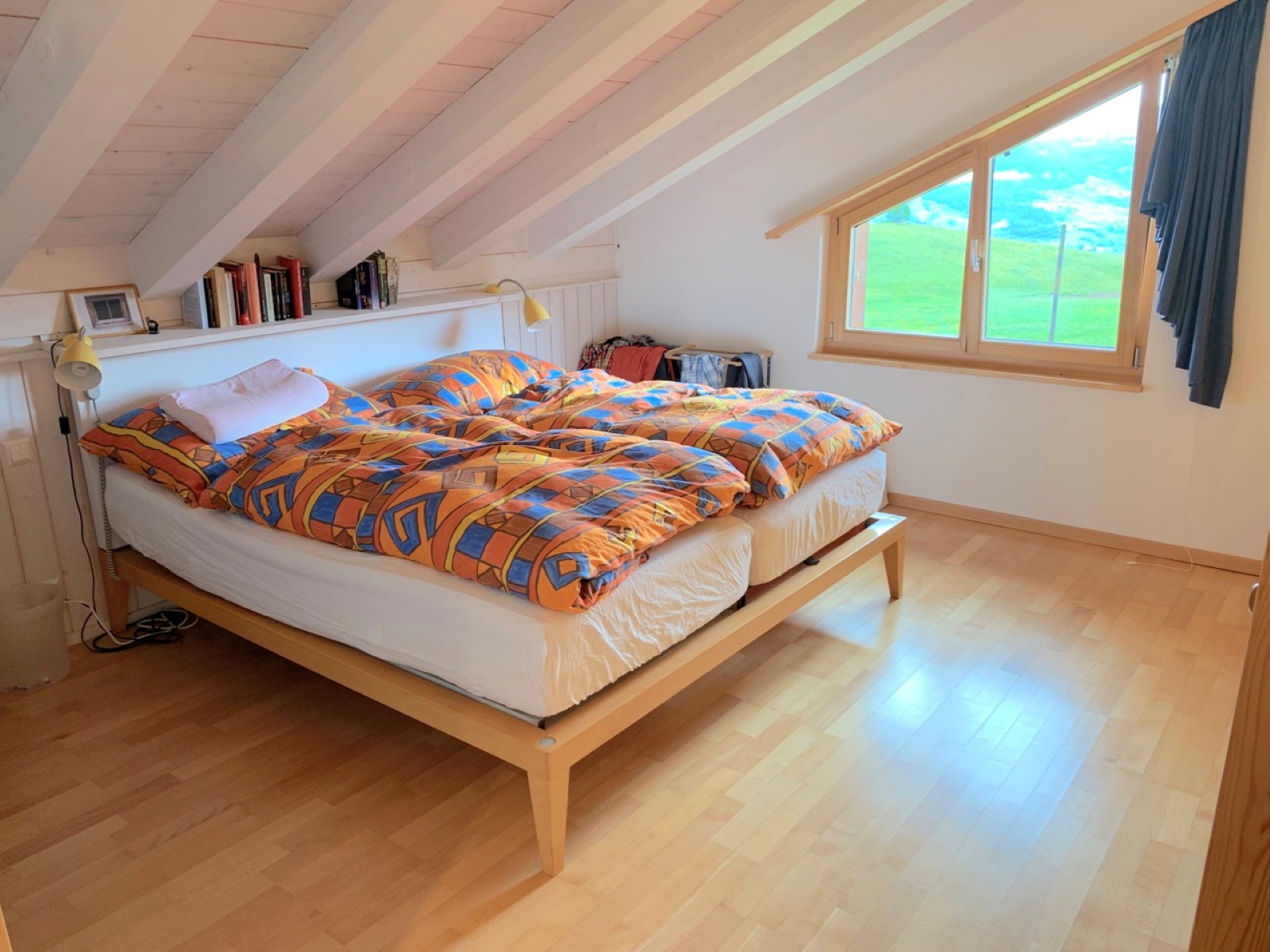 Ein offener Wohnraum mit Küchen-/Essbereich mit viel Luftraum bis unter dem Dach. Im Wohnzimmer befinden sich 3 x 3-er Sofa, ein Schwedenofen (Holz wird bereitgestellt), ein Beamer mit Leinwand und ein Nordbalkon. Im Essbereich mit grossem Esstisch (bis 10 Personen) und Südbalkon. Zwischen Ess- und Wohnzimmer ist der Zugang zum grossen Westbalkon mit Lounge-Möbel. WLAN in der ganzen Wohnung (kostenlos), Beamer, Fernsehen, Stereoanlage.Badezimmer: