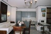 Wohnzimmer mit grosser Schiebetür-Fenster-Wand mit elektrisch bedienbaren Rollos. Wertbeständige Bulthaup-Massivholz-Landhausküche: 4 Kochplatten, Backofen, Kühlschrank mit Tiefkühlfach, Dunstabzug, Geschirrspüler, Deckenventilator, Waschmaschine, Wäscheständer (Trockner im Waschhäuschen auf Gemeinschaftsterrassen vor Schwimmbad-Haus).