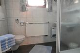 Badezimmer mit Toilette, Waschbecken und Dusche. Hand- und Duschtücher sind in gebuchter Personenzahl in der Wohnung.