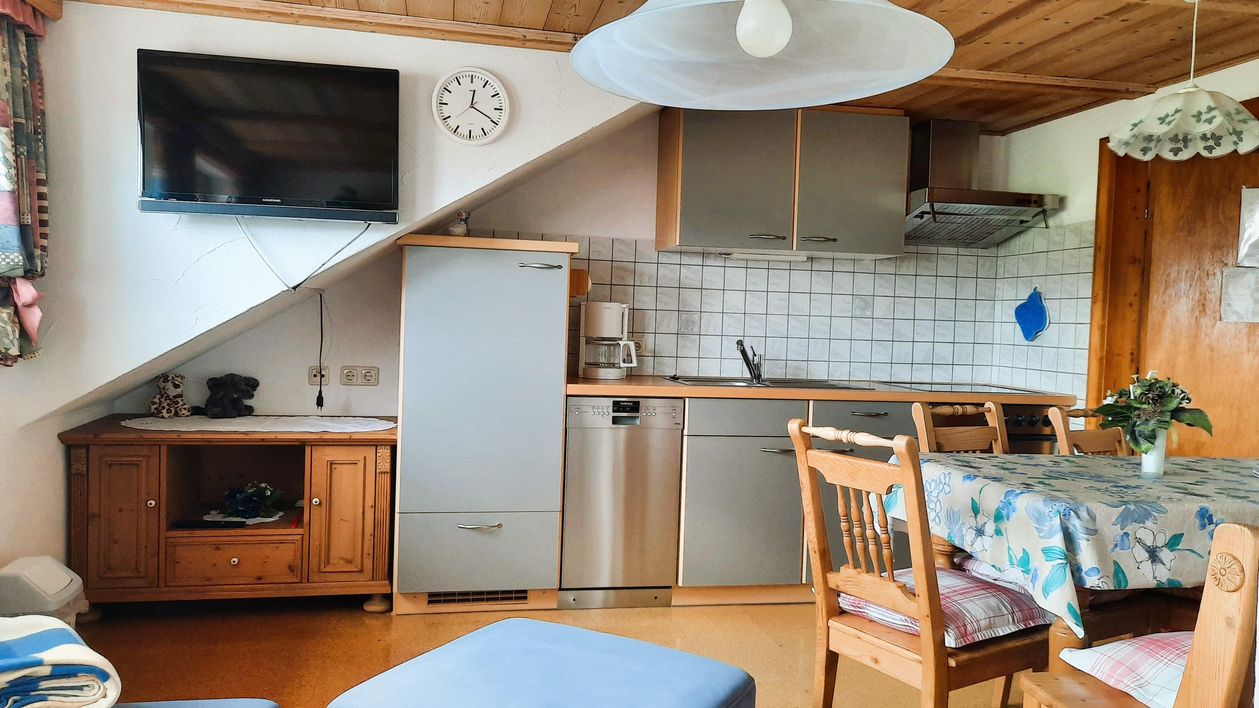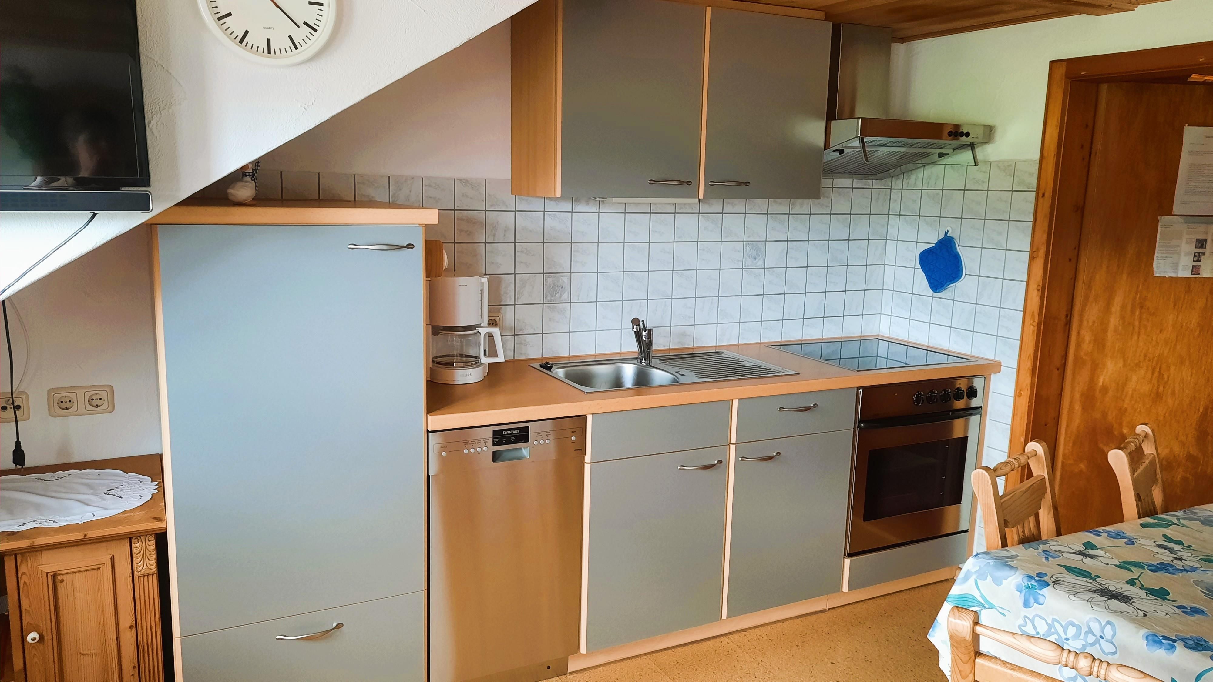 Komplett ausgestattete Küche mit Spülmaschine, Cerankochfeld, Kühlschrank mit Gefrierfach (3*), Wasserkocher, Filter-Kaffeemaschine, Toaster, Töpfe, Pfannen, Geschirr und Besteck.