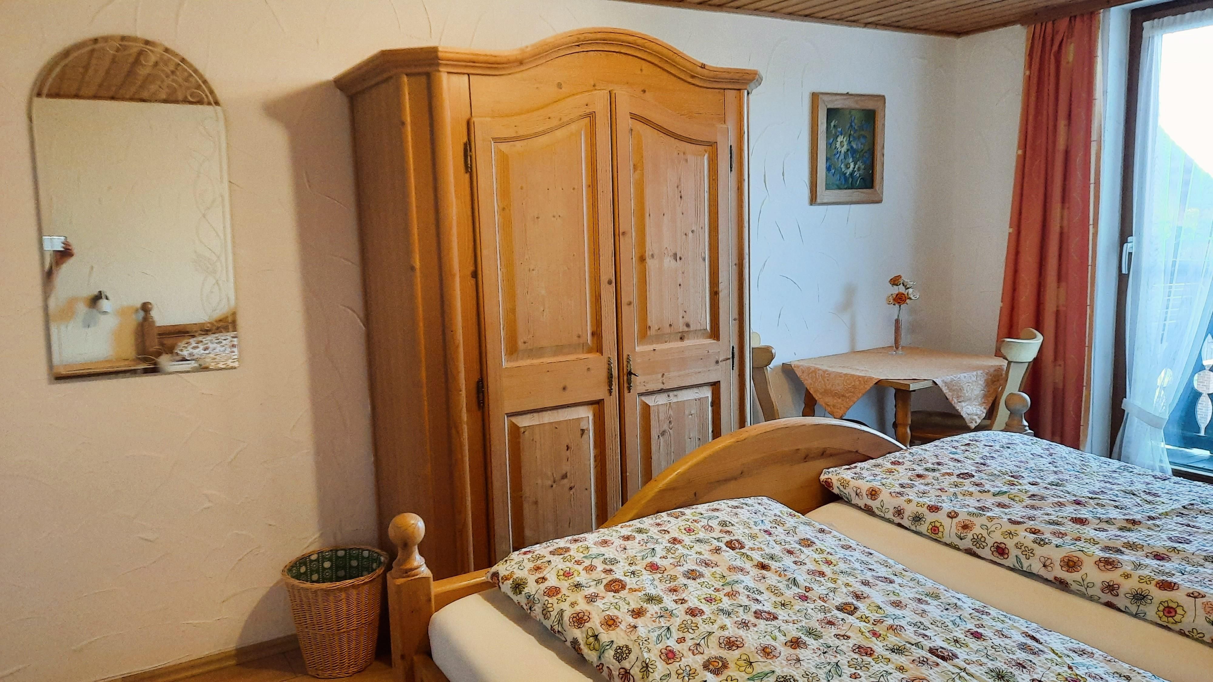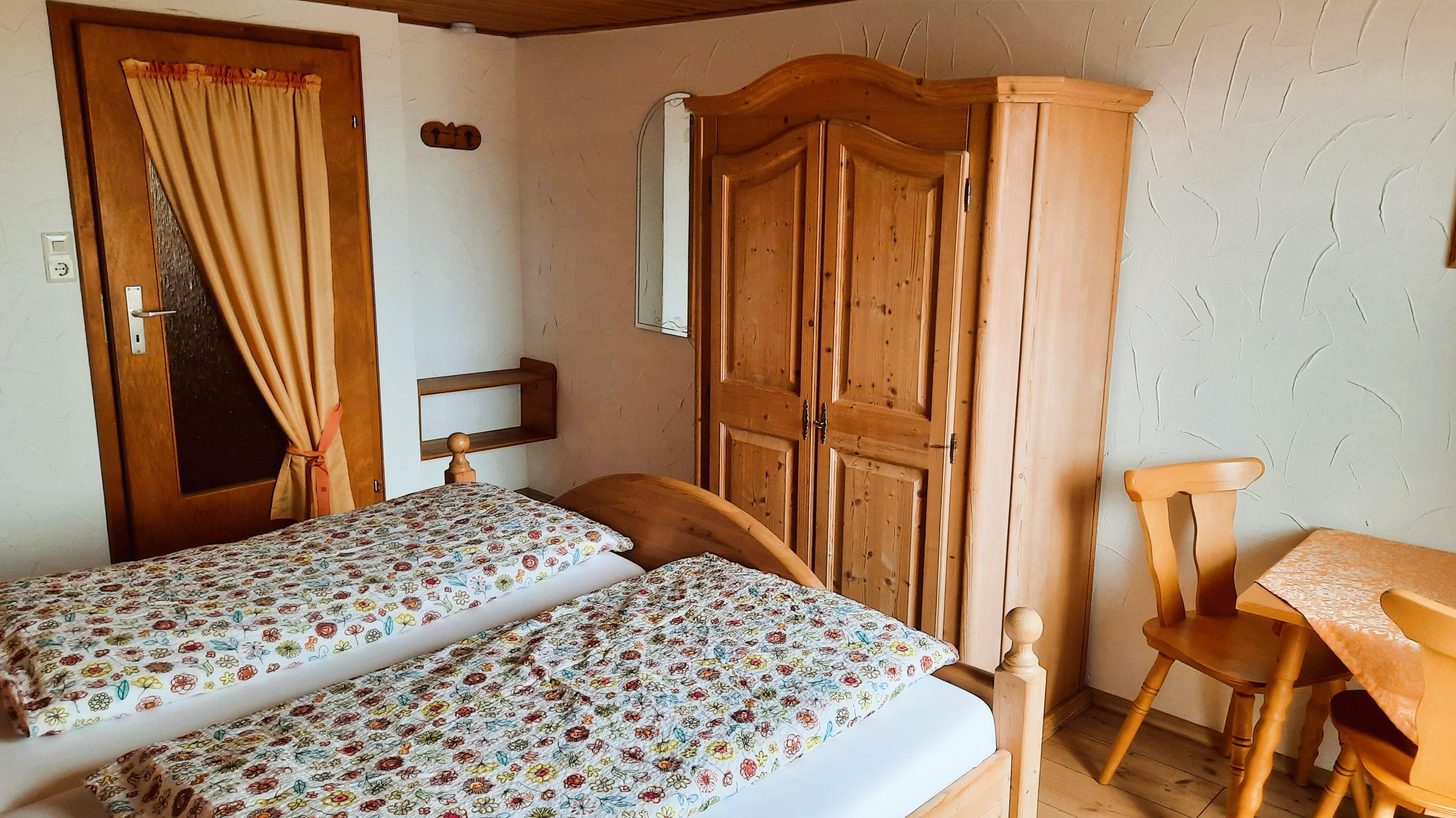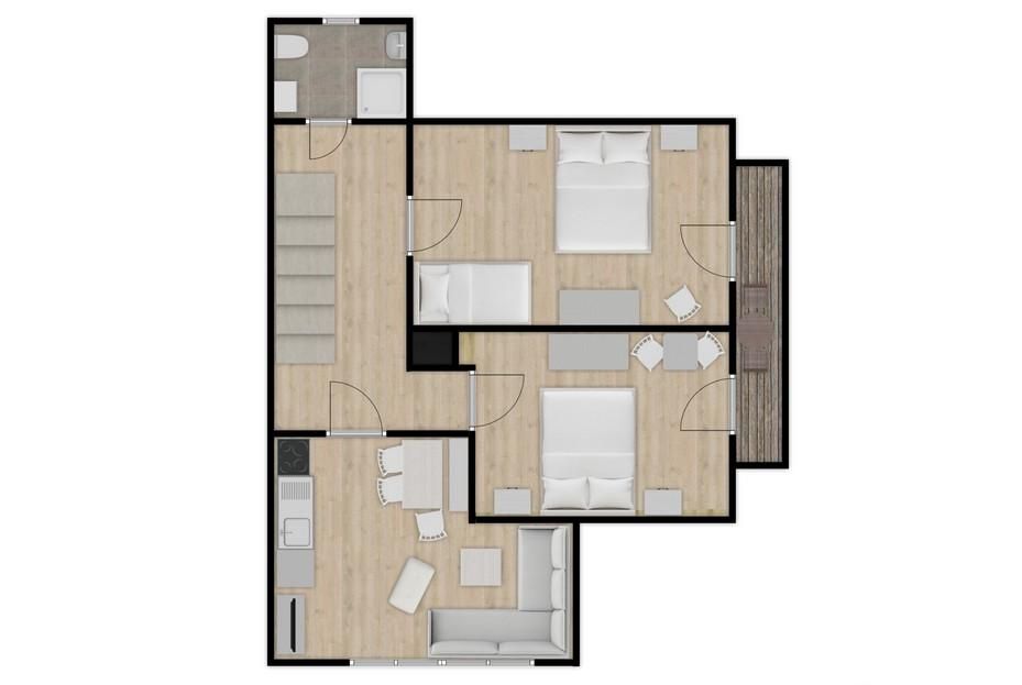 Die komfortable und liebevoll ausgestattete Wohnung befindet sich im 2. Obergeschoss. Sie verfügt über zwei Schlafzimmer (ein Doppelzimmer und ein Dreibettzimmer) mit Balkon, einer Wohn-/Küche und DU/WC.