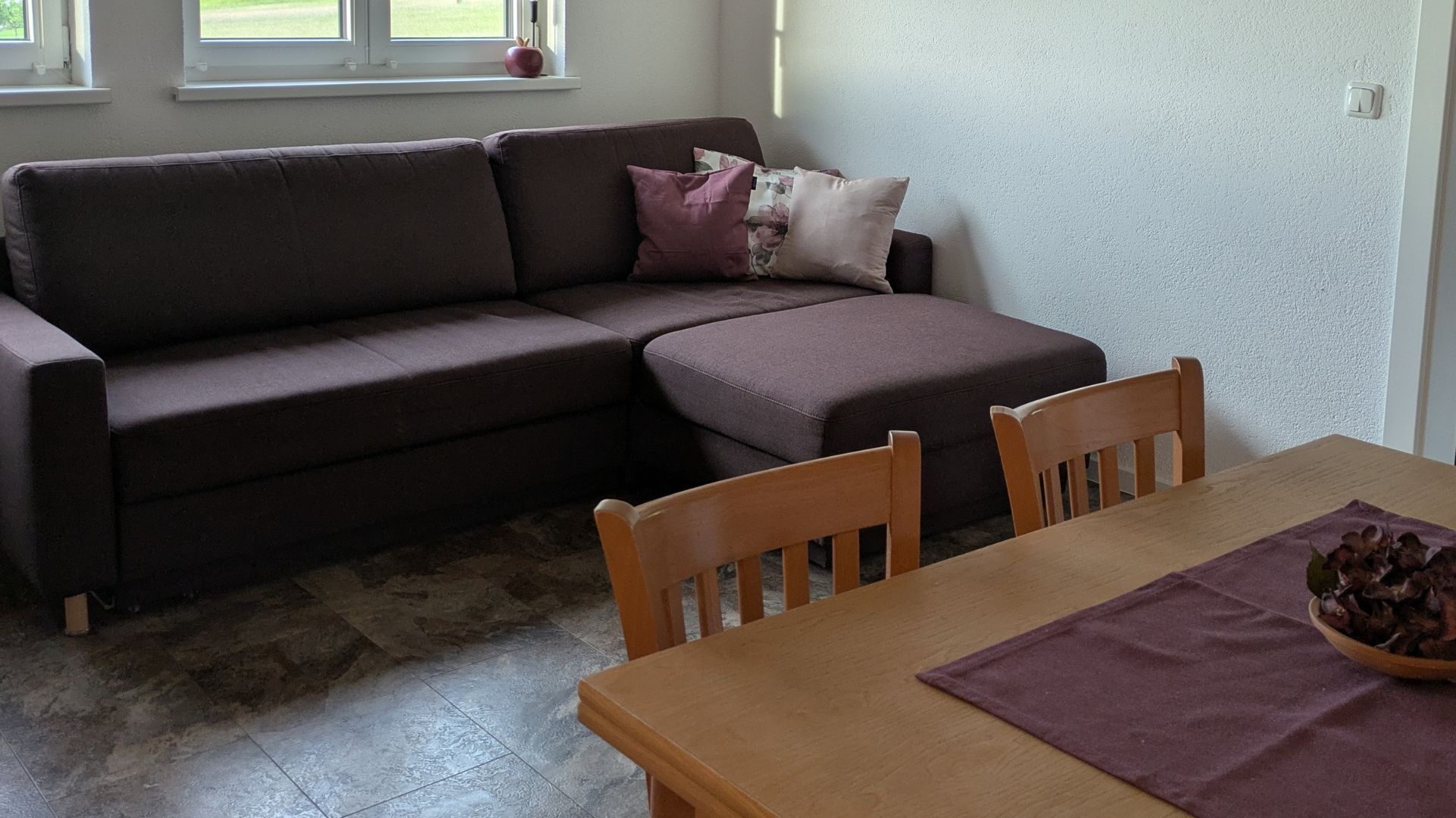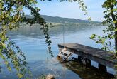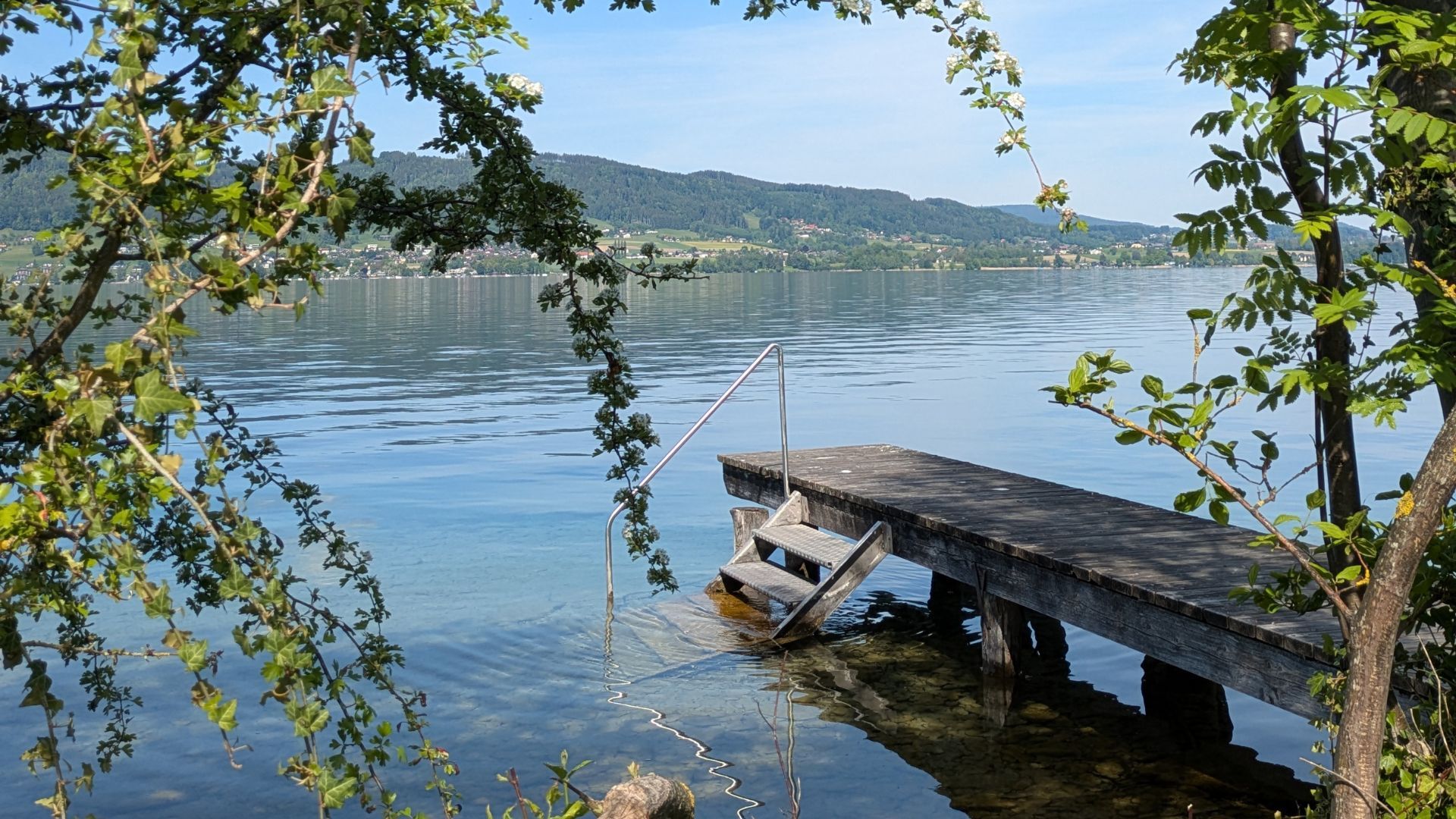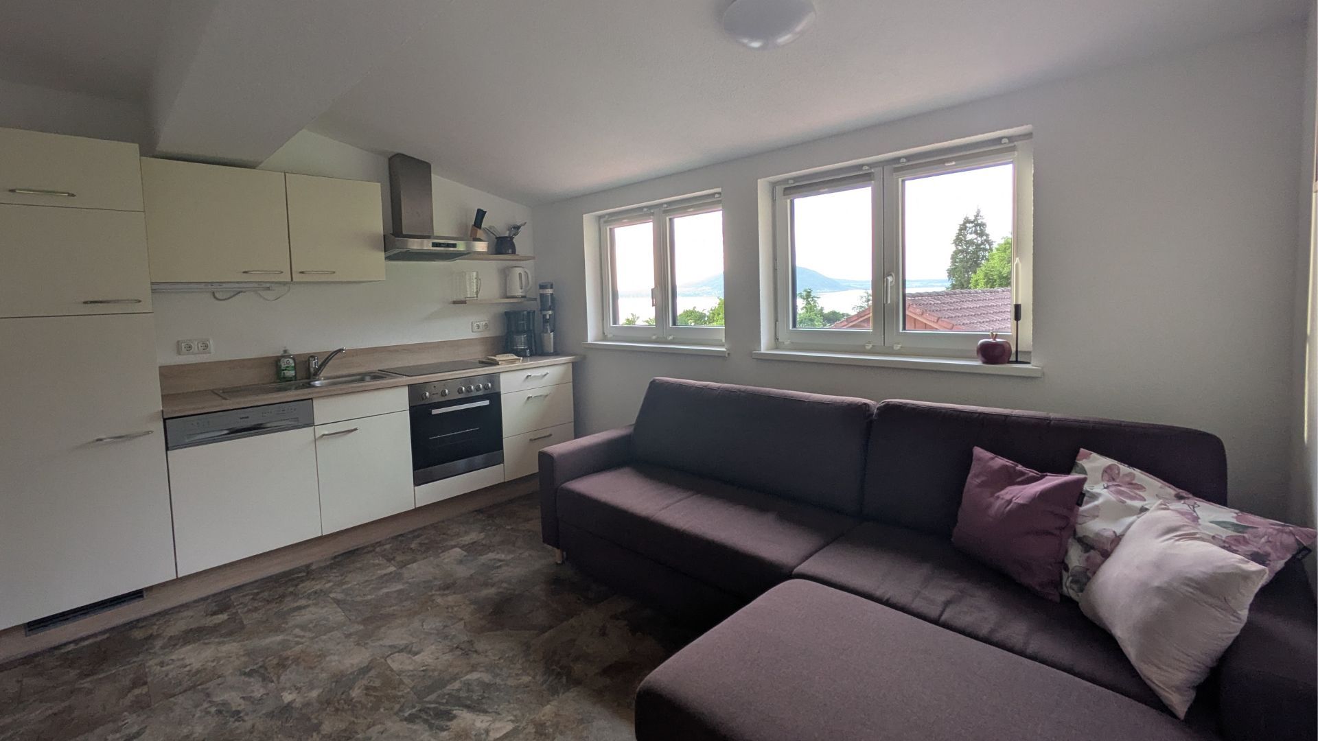 Entdecken Sie unsere gemütliche Ferienwohnung im 2 Stock, die Ihnen eine unvergleichliche Aussicht auf den schimmernden See und den dahintergelegenen Buchberg bietet.