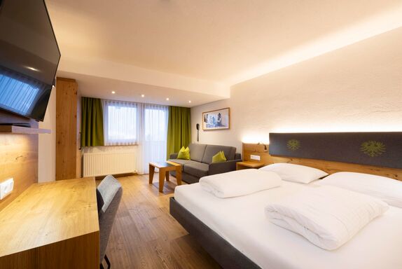 Schönes, großzügiges Superior für bis zu 4 Personen belegbar. Ausgestattet mit Dusche/WC, Eichenholzparkett, Haarfön, Telefon, TV mit Sat-Empfang, gratis Zimmersafe und Balkon mit Blick auf die Stubaier Bergwelt.