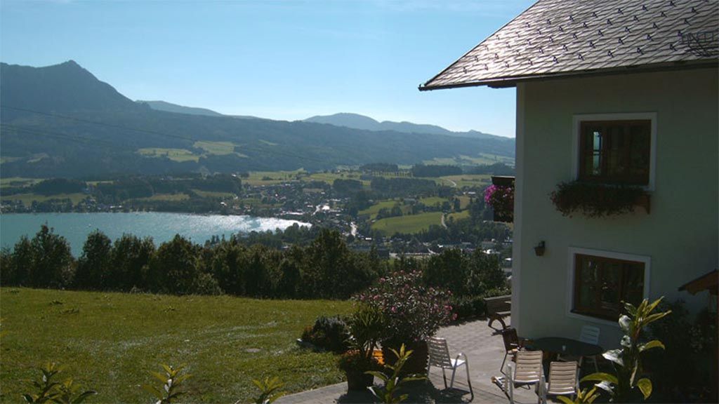 Der Balkon bietet eine traumhafte Aussicht auf den Mondsee und die Berge.